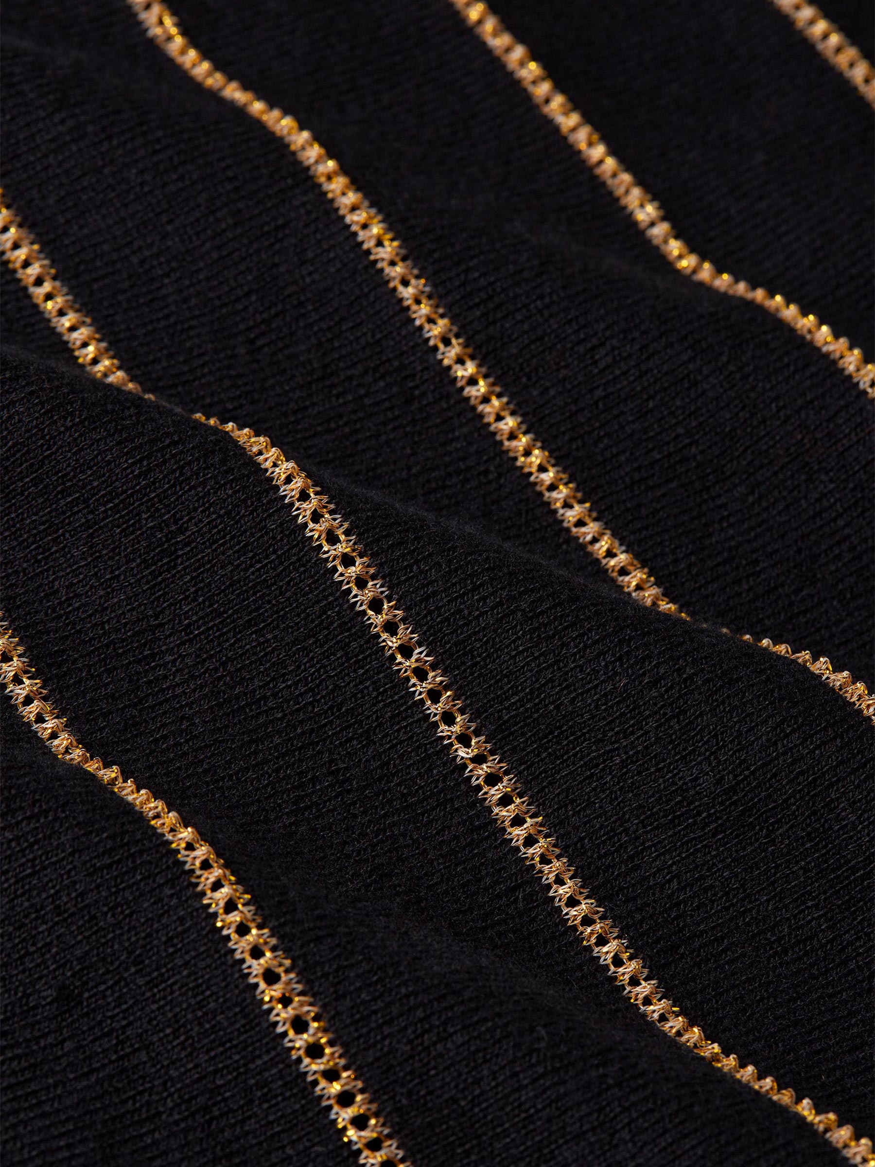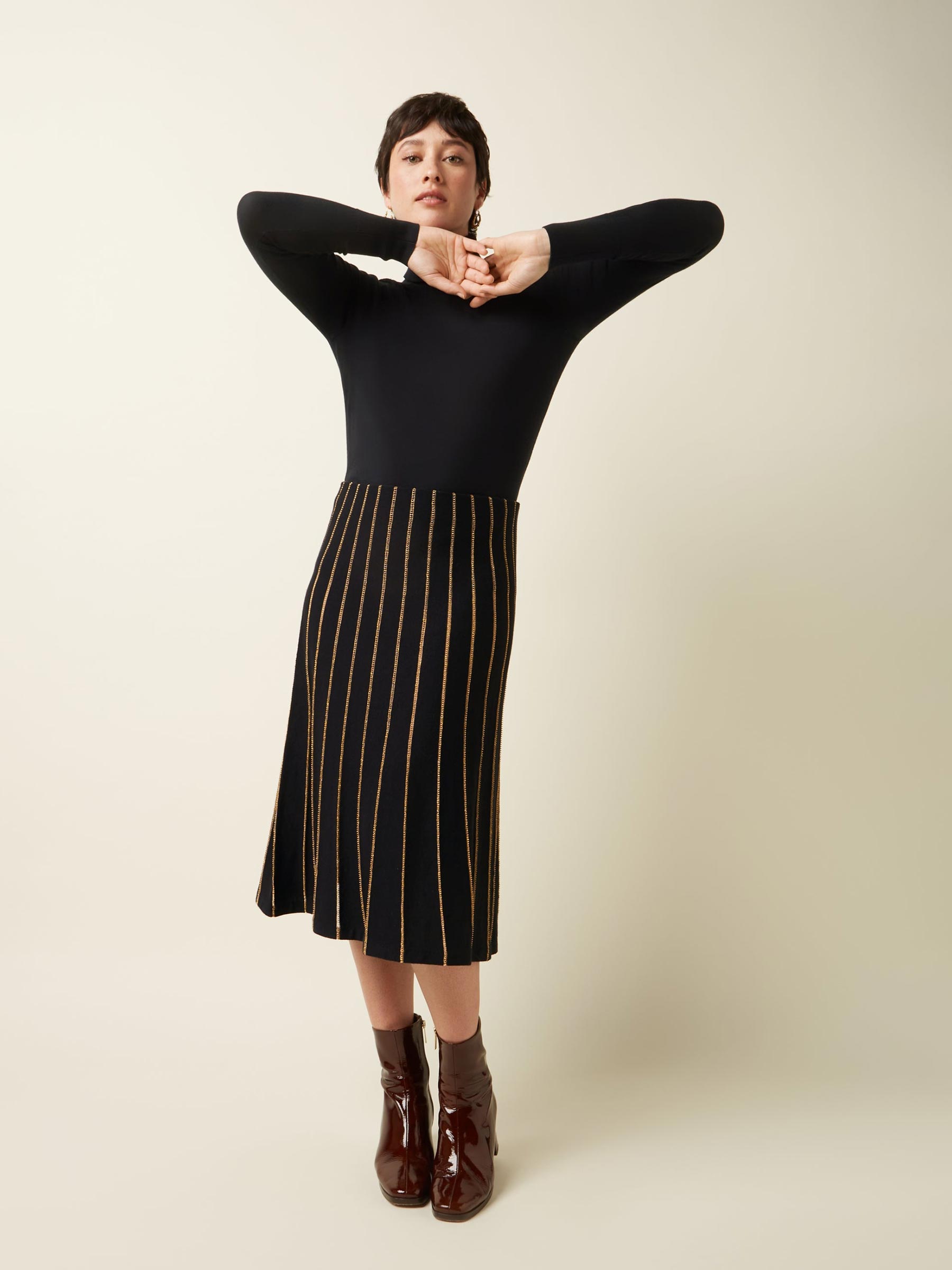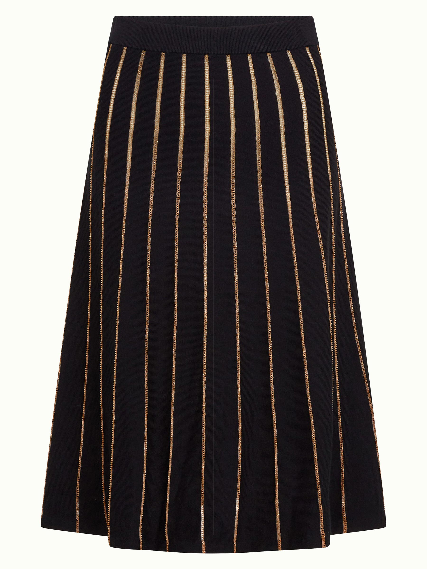 Deze zwarte midi rok van King Louie is een fijne keuze als je iets bijzonders zoekt dat toch makkelijk combineert. De verticale glitterstrepen geven de rok een mooie uitstraling en de knit kwaliteit zit heerlijk comfortabel. Leuk met een simpele top of juist met een blouse voor een avondlook.