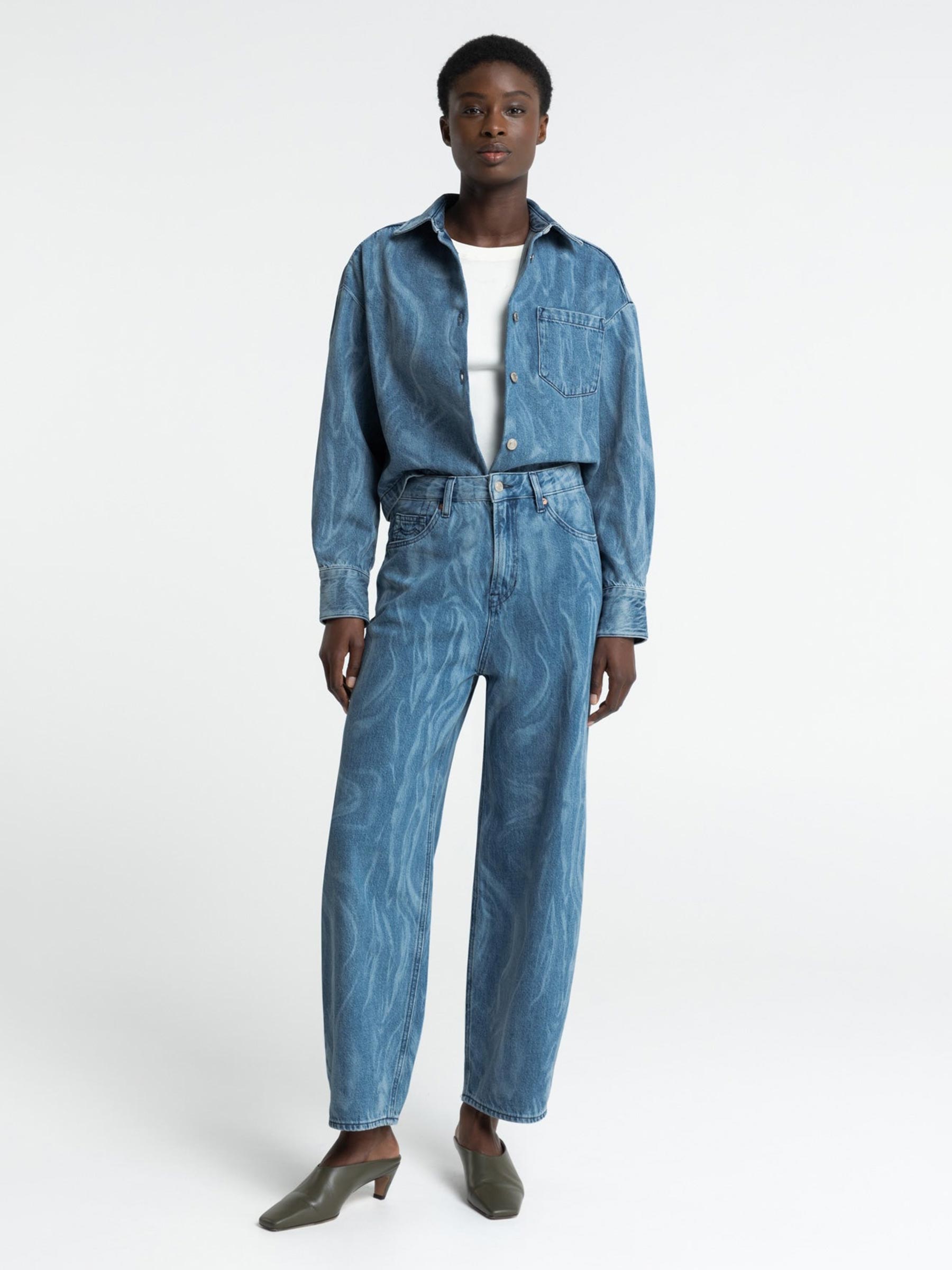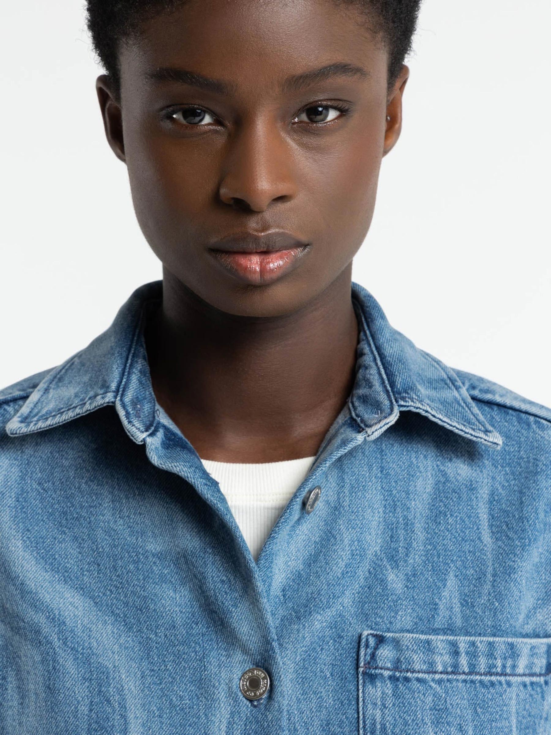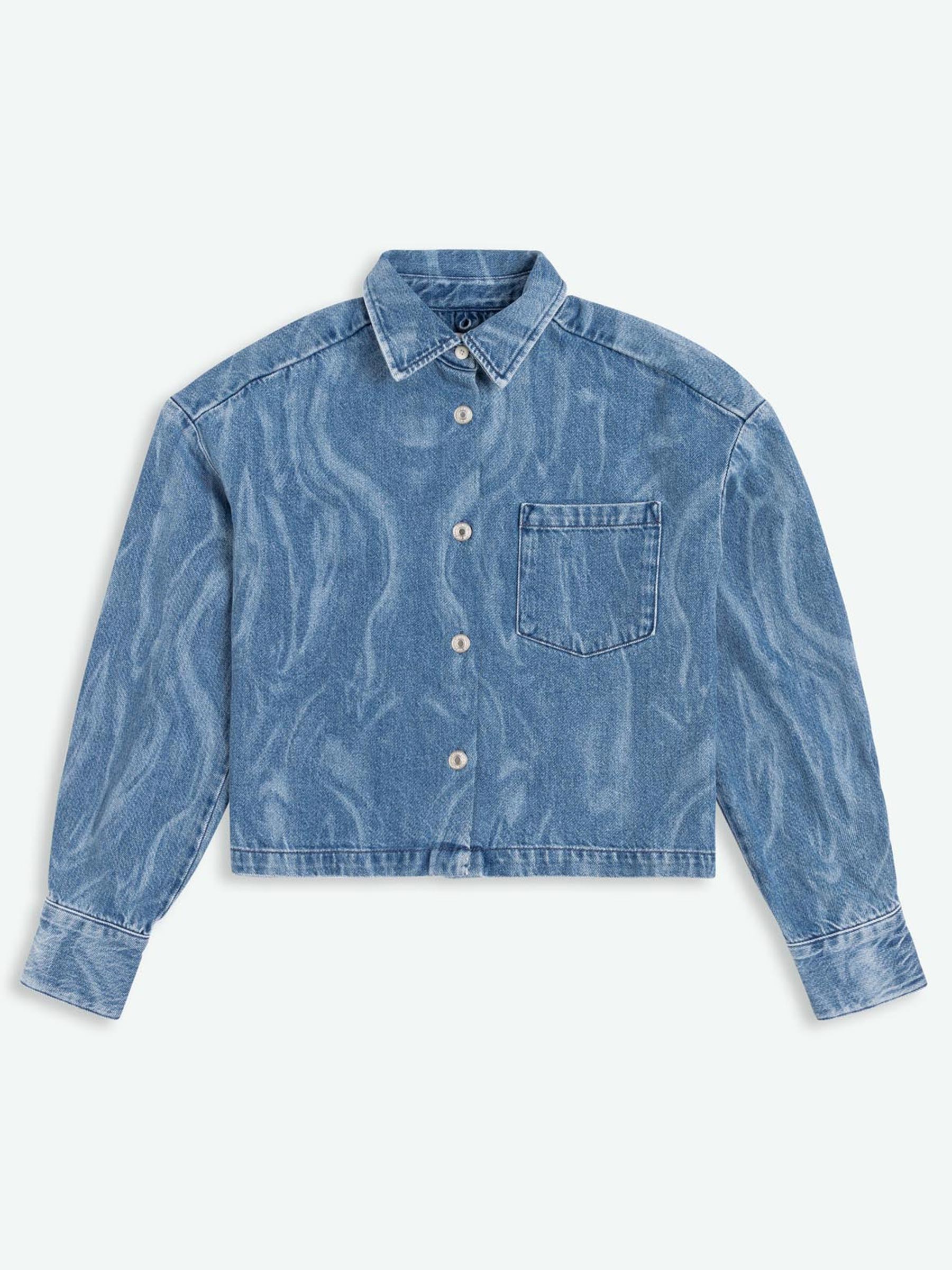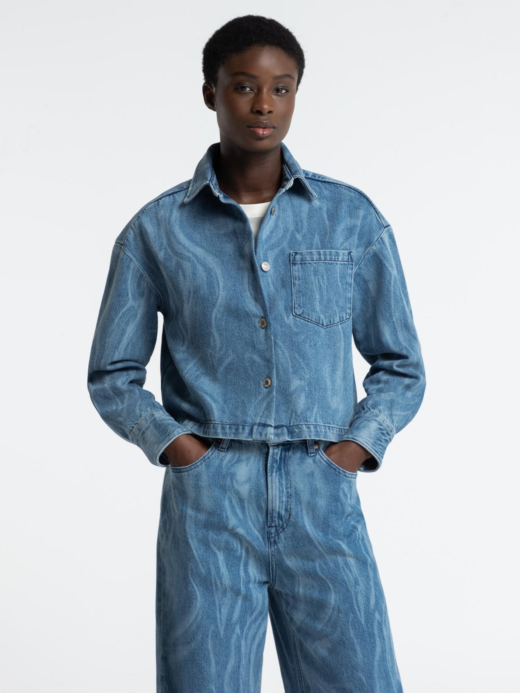 Dit blauwe denim jack van Kings of Indigo is een stoer item dat meteen opvalt door de subtiele wavy print. Het korte, boxy model geeft een frisse look en de borstzak maakt het design speels en praktisch. Perfect met de jeans of juist als contrast op een lichte pantalon.