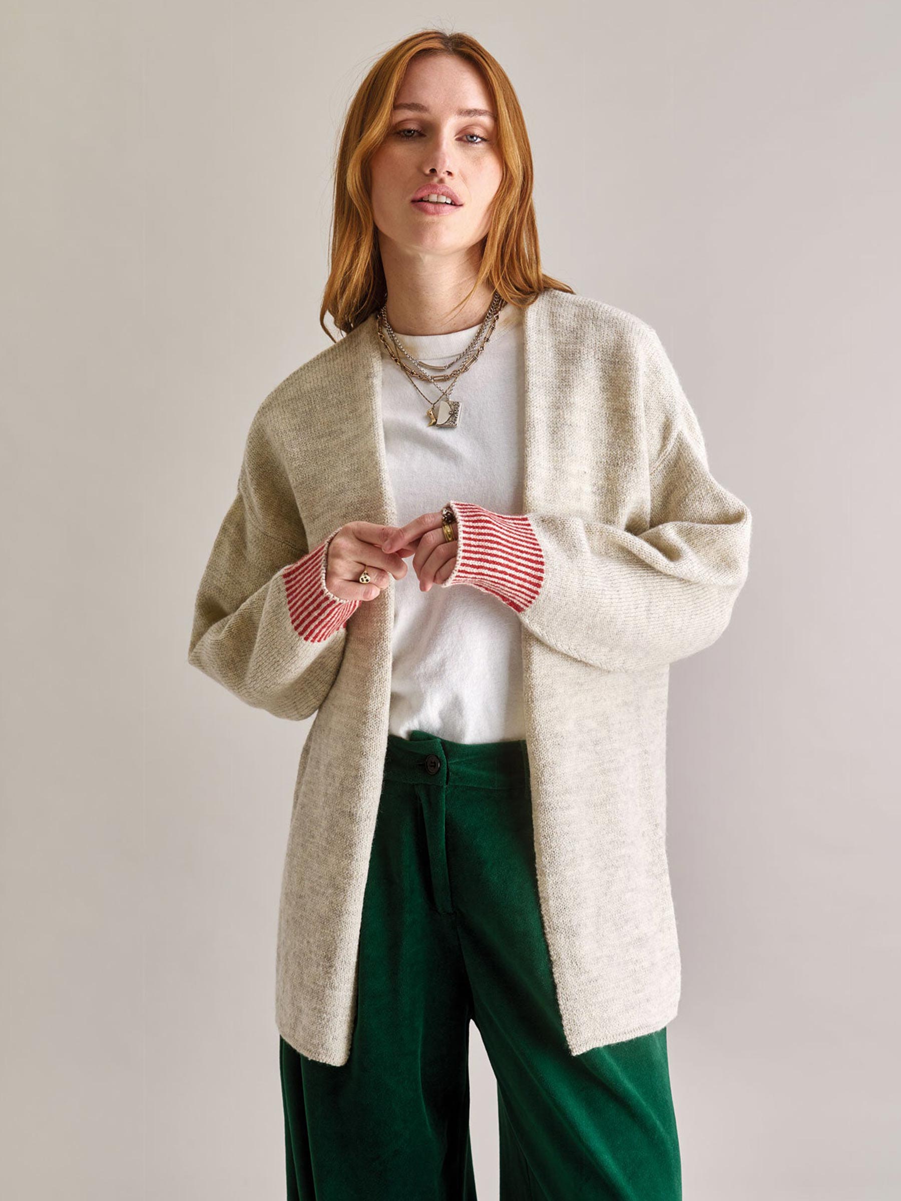 Dit ecru vest van Komodo is een echte allrounder voor het tussenseizoen. De losse pasvorm en open voorkant maken hem ideaal om te dragen over een T-shirt of blouse. De contrasterende rood-witte boorden geven net dat beetje extra en brengen wat kleur in je look.