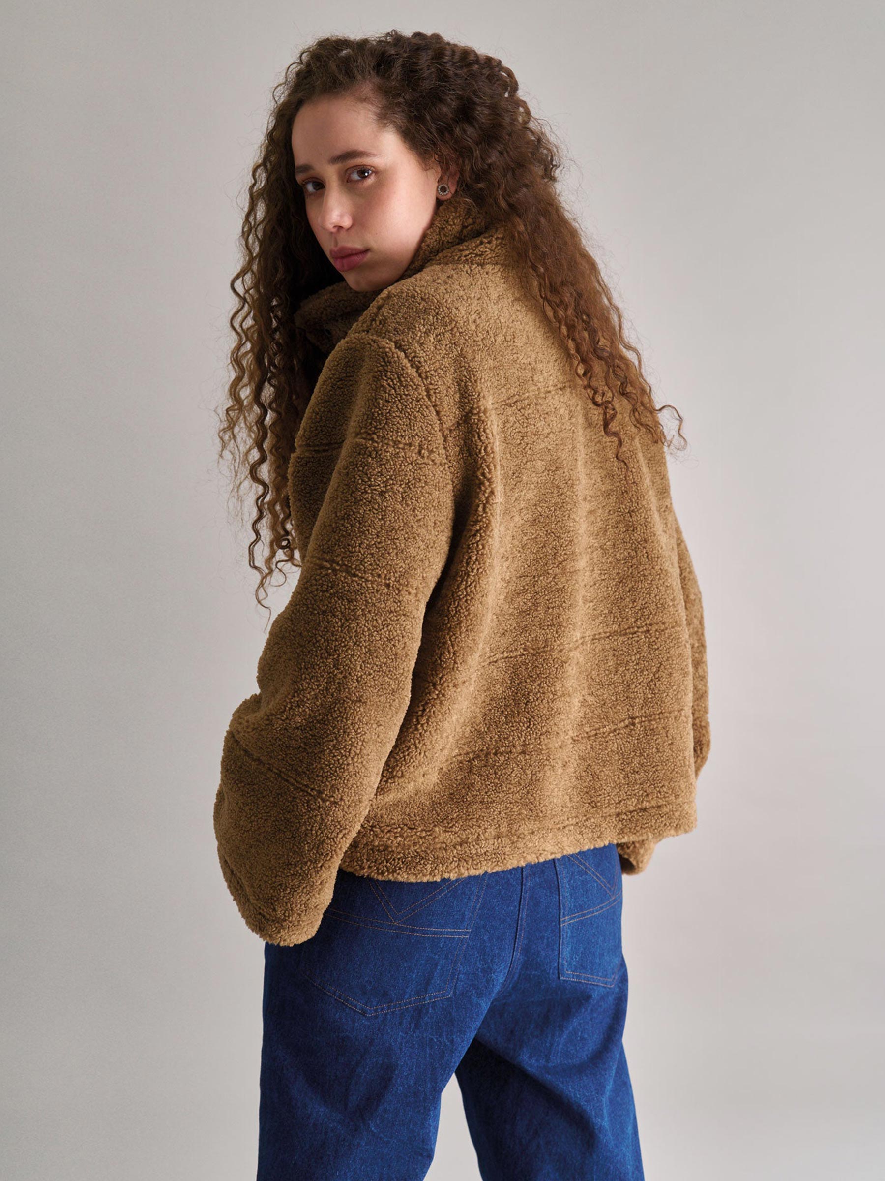 Deze bruine teddy jas van Komodo is perfect voor frisse dagen. De zachte, wollige structuur voelt heerlijk warm aan en geeft elke outfit een cozy uitstraling. Gemaakt van gerecycled PET dus ook een bewuste keuze.