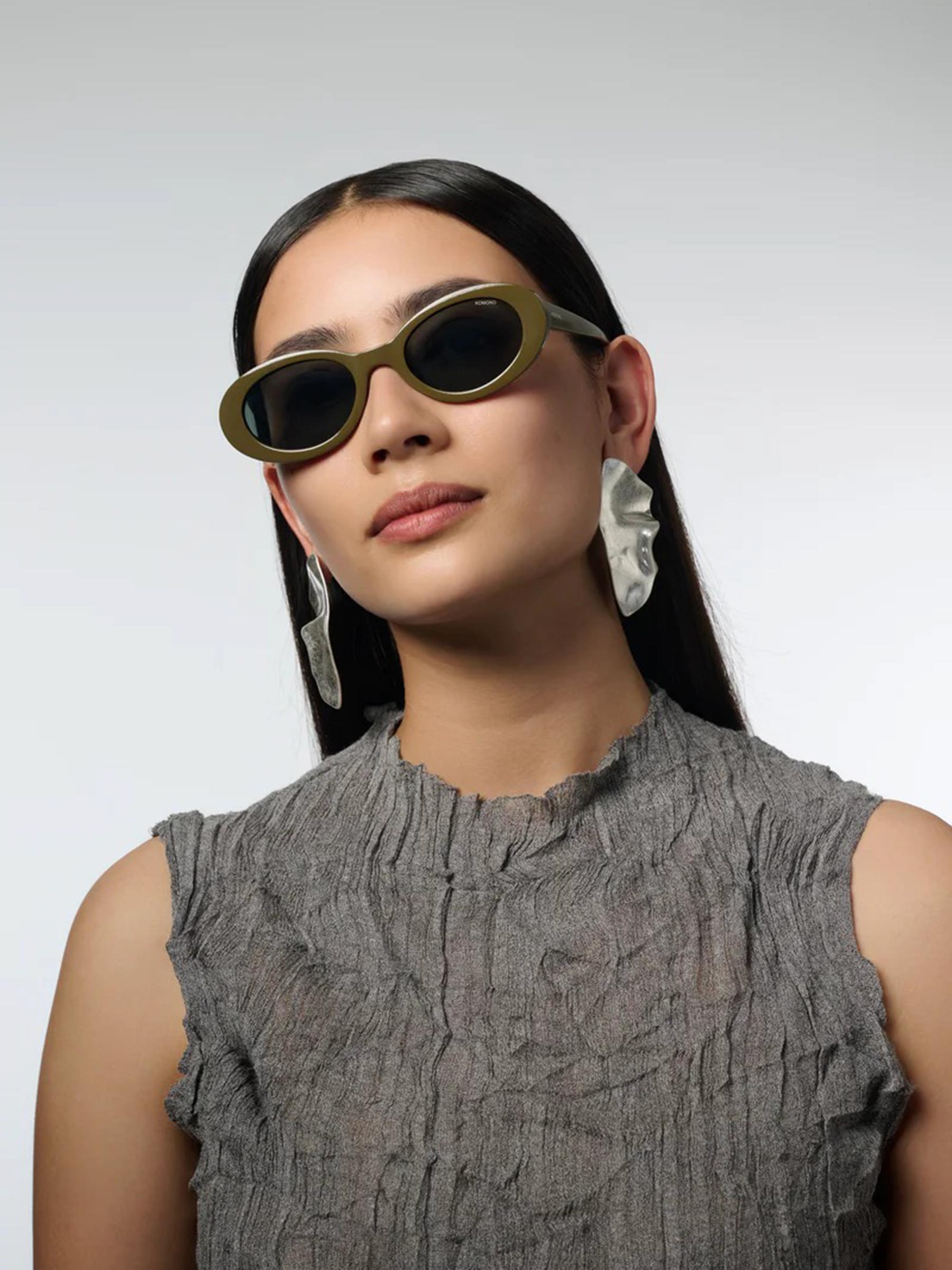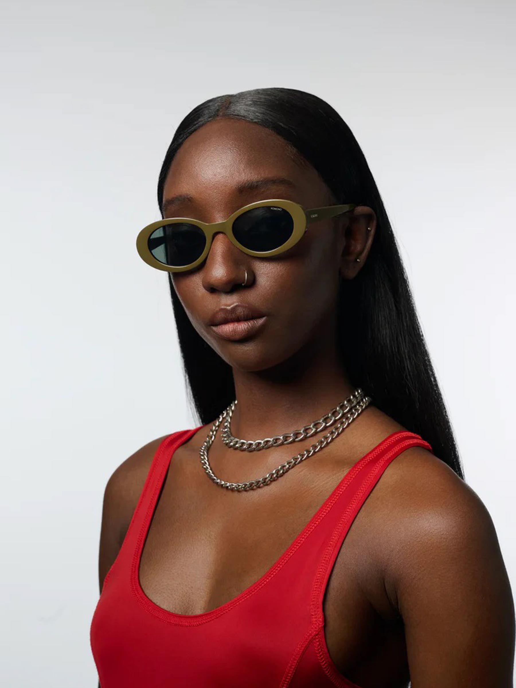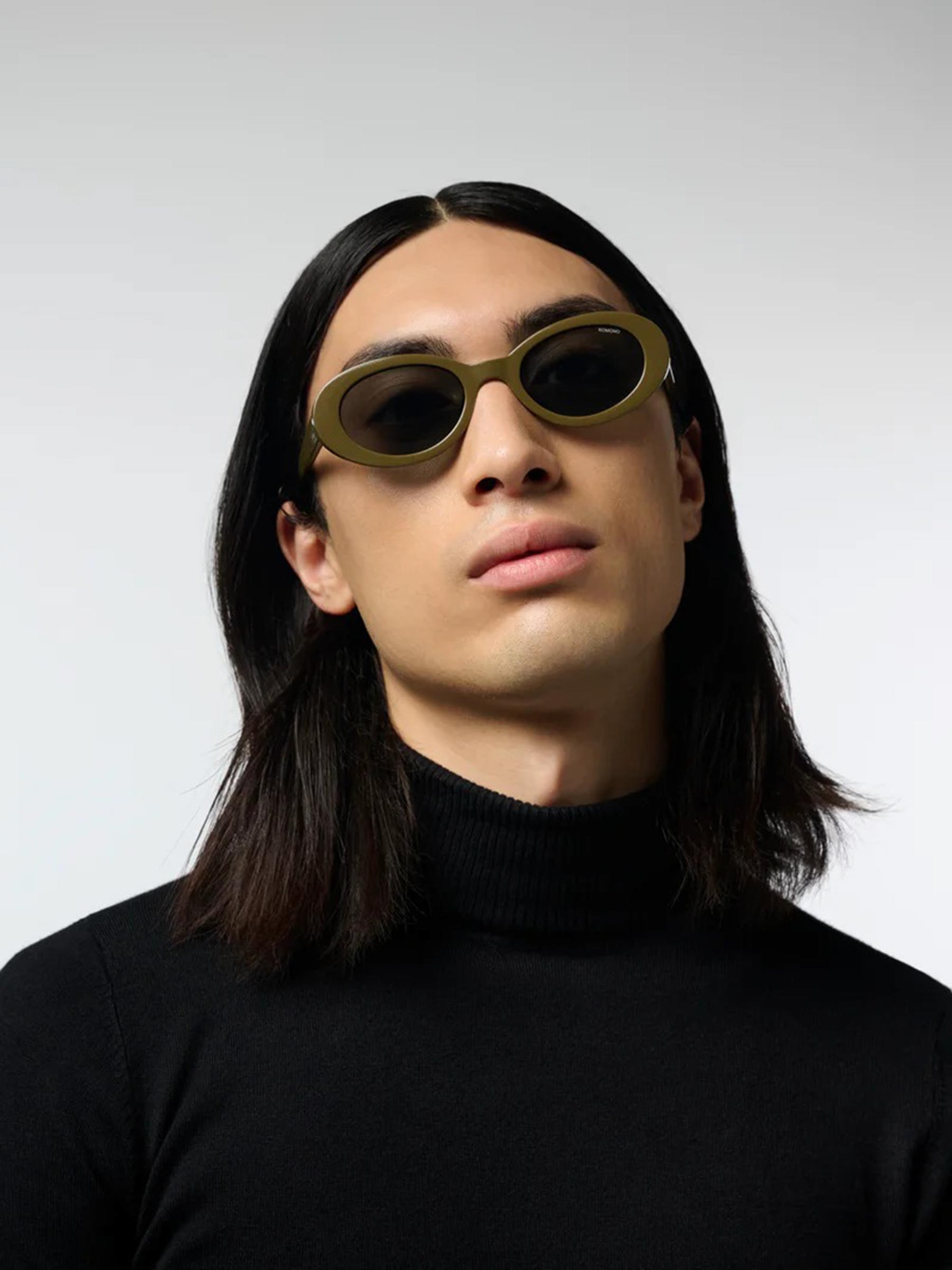 Deze warme zonnebril in donkergroen van KOMONO valt op door de lage, ovale vorm die je gezicht direct iets speels geeft. Het bio nylon montuur voelt licht en zit comfortabel, ook als je ze de hele dag draagt. KOMONO is een Belgisch merk dat duurzaamheid en minimalistisch design combineert zonder in te leveren op stijl.