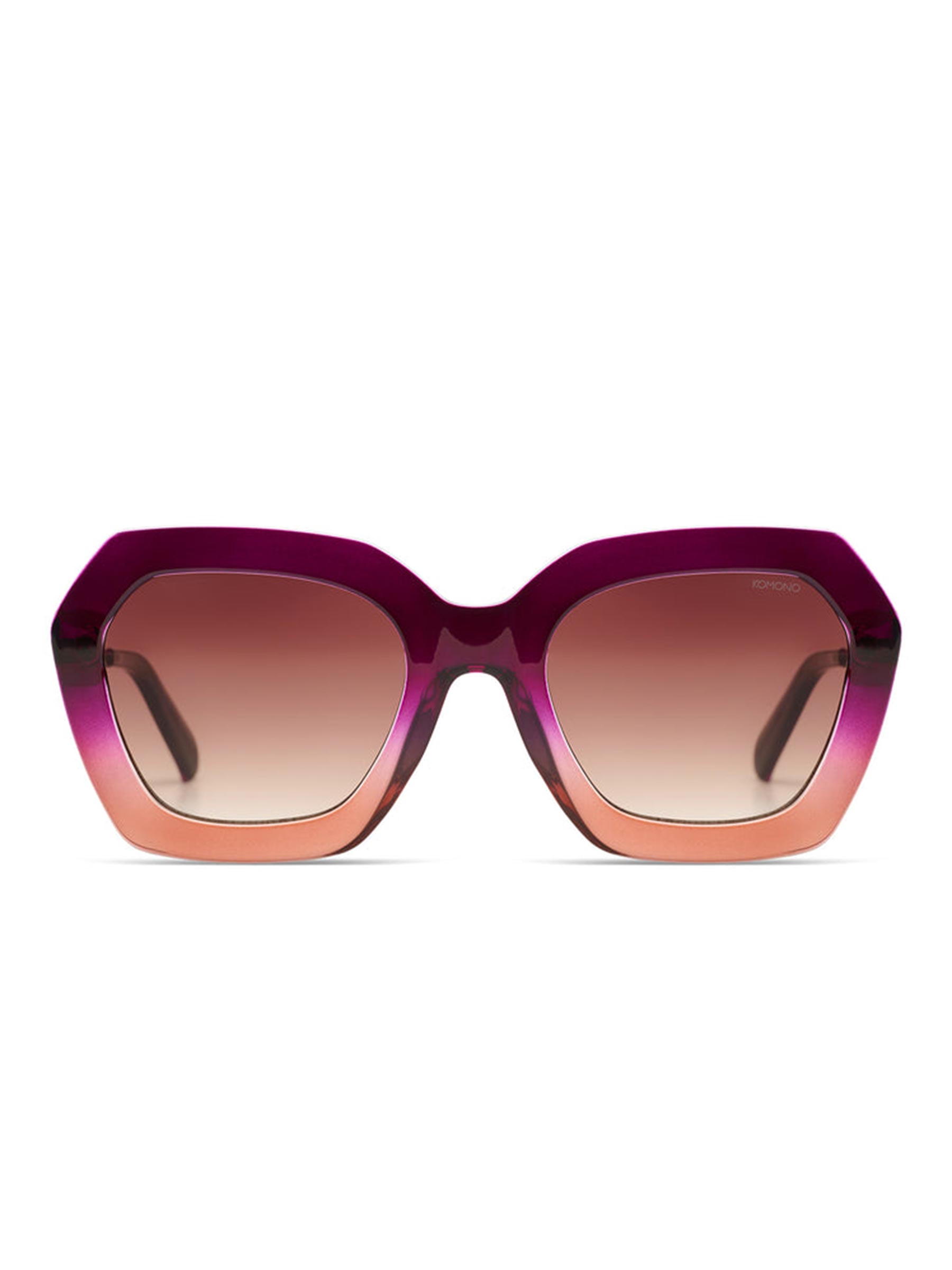 De ombre zonnebril gwen fuchsia bloom van KOMONO is een echte eye catcher met het oversized hexagonale montuur dat verloopt van diep fuchsia naar zacht perzik. De bruine gradient glazen maken het geheel warm en draagbaar.