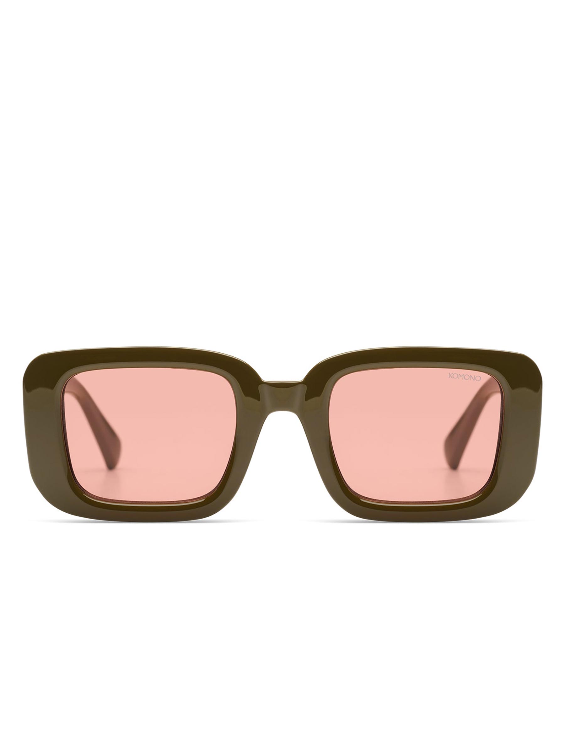 De groene zonnebril Avery Hazel van KOMONO valt op door het dikke, hoekige montuur in een warme olijftint met roze getinte glazen. Een bril die je outfit helemaal afmaakt.