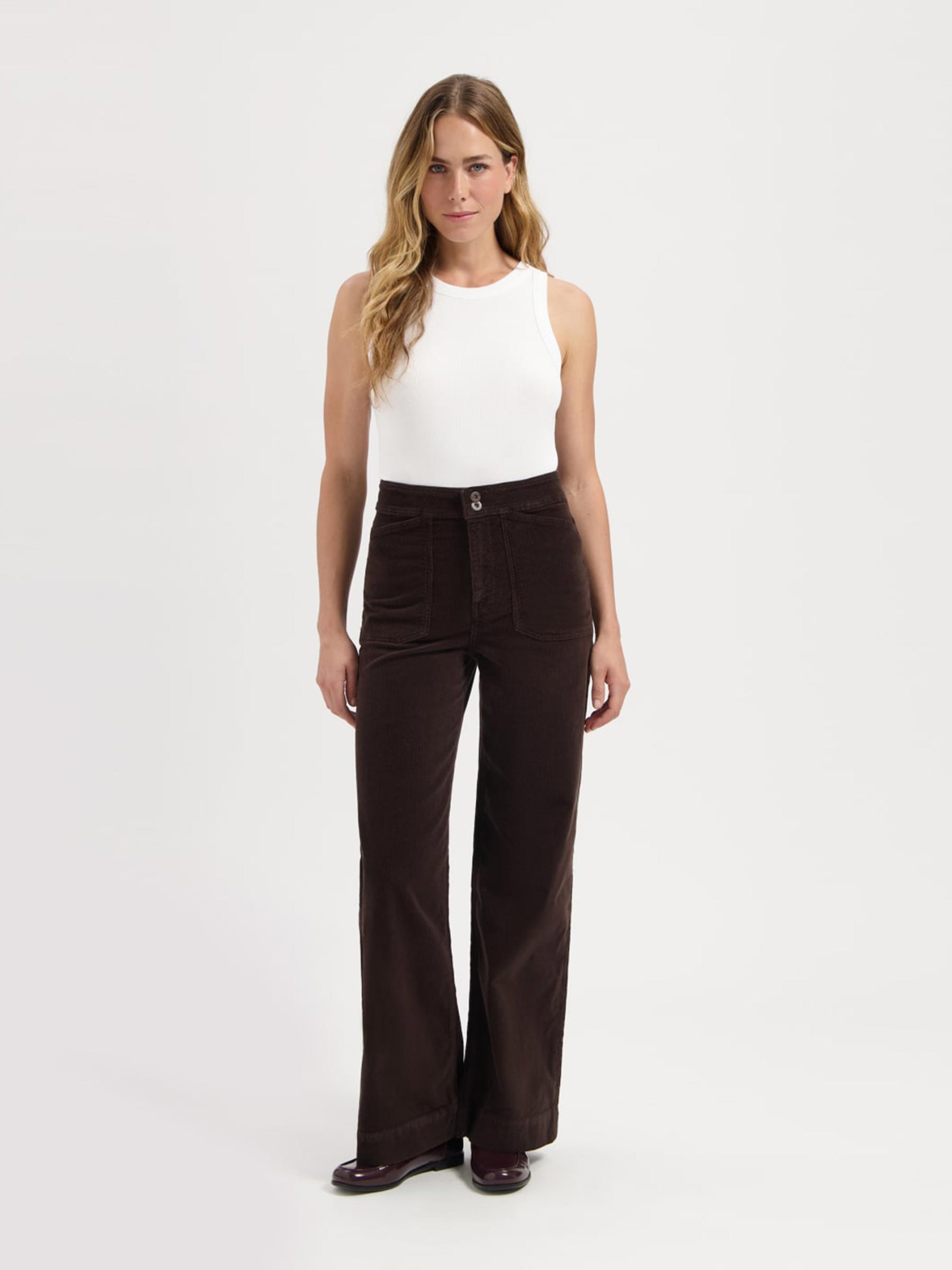 Deze donkerbruine corduroy broek van Kuyichi is gemaakt van zacht ribfluweel en heeft een stoere worker look. De high waist en wide leg fit zorgen voor een flatterend silhouet en maken hem ideaal om te dragen met laarzen of sneakers. Een tijdloos item dat je makkelijk door het seizoen heen styled.