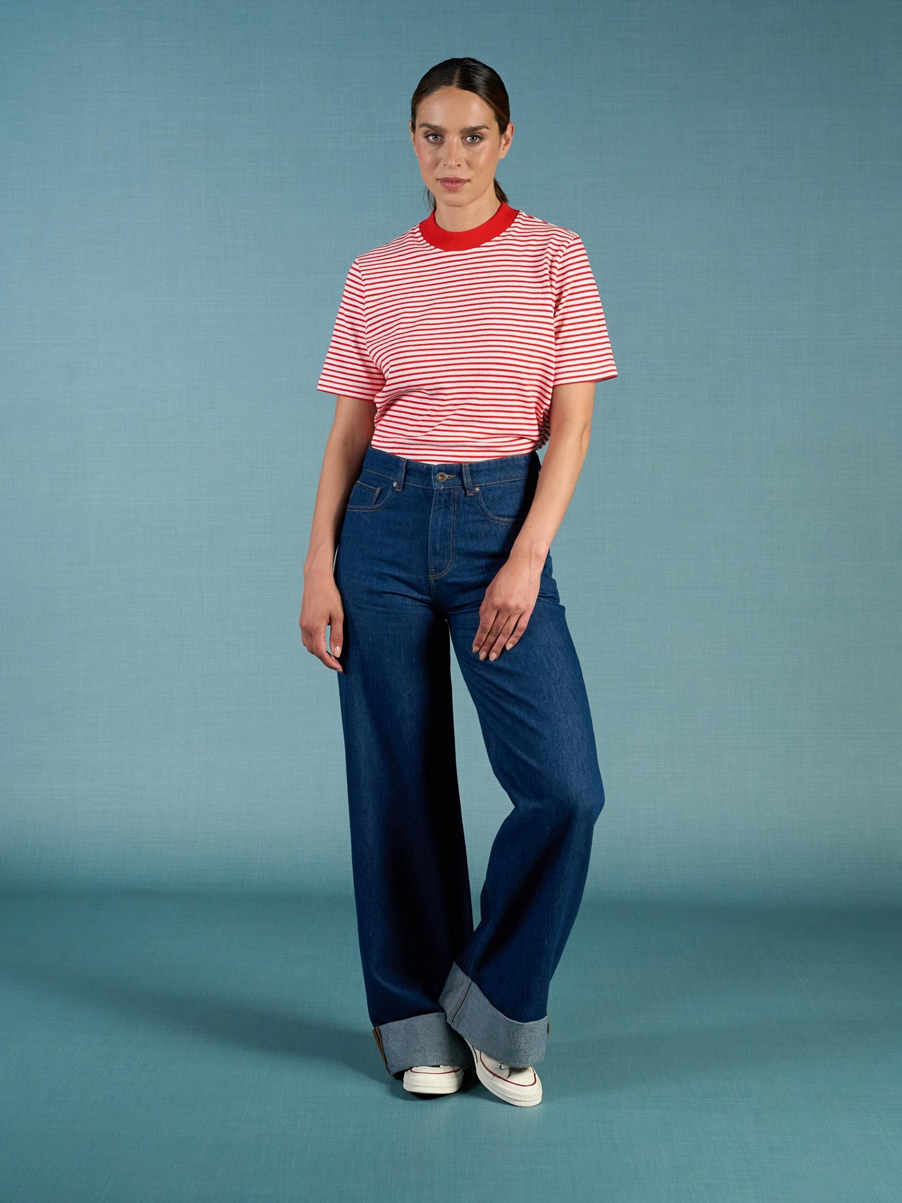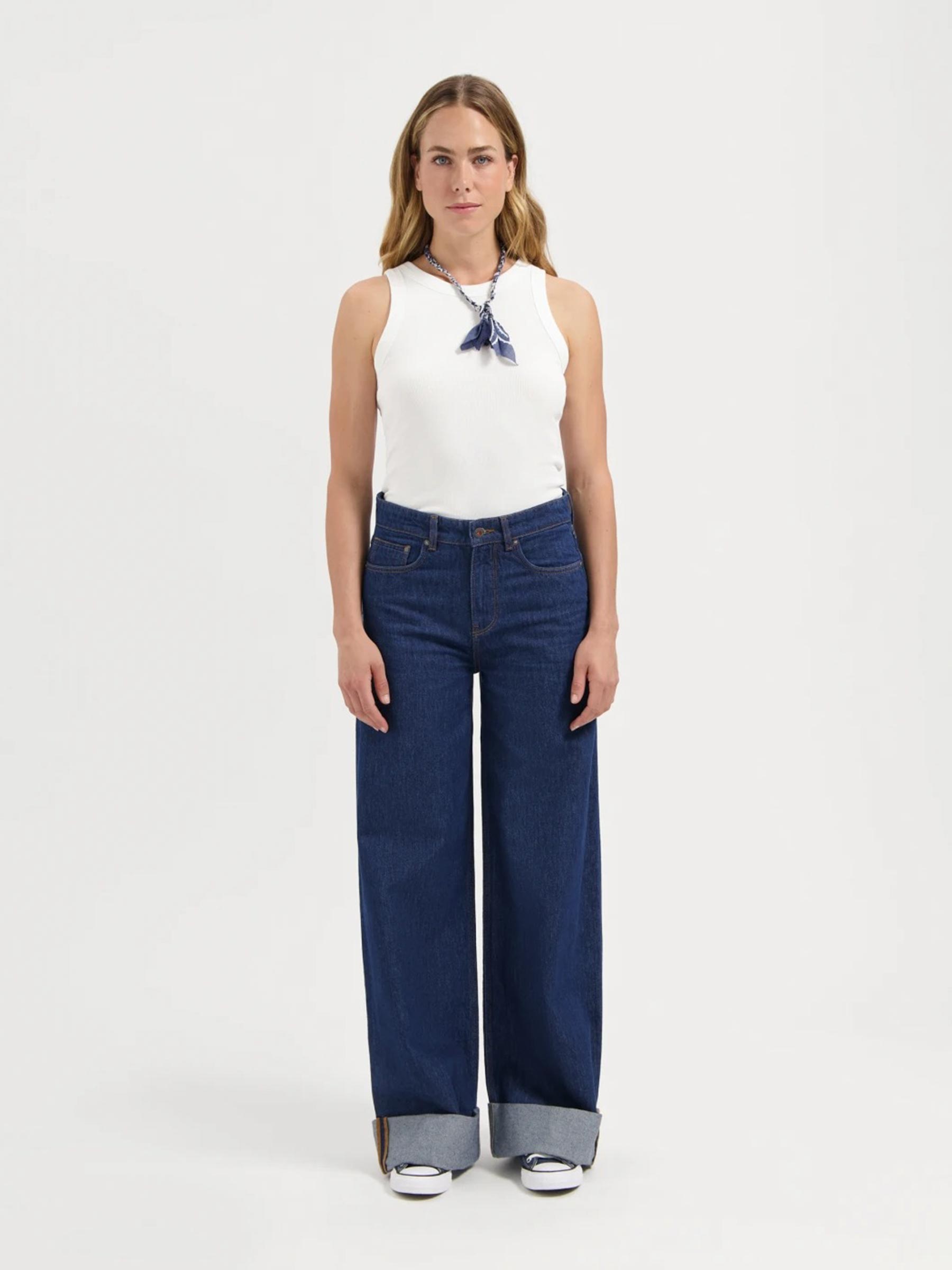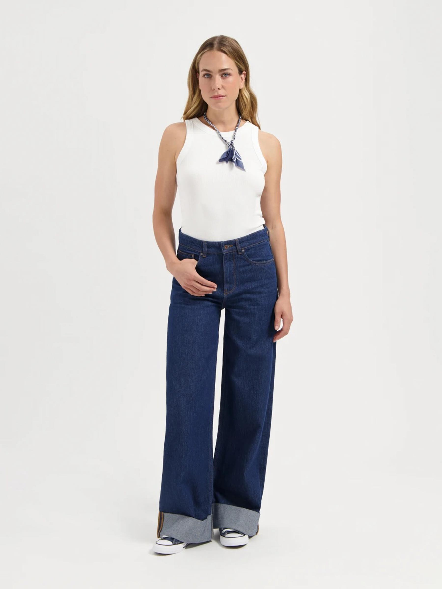 Deze donkerblauwe jeans van Kuyichi heeft een wide leg fit met een stoere opgerolde zoom. De hoge taille en stevige denim geven ‘m een mooie vintage look die perfect combineert met een aangesloten top of blazer. Een tijdloze musthave voor je denimcollectie.