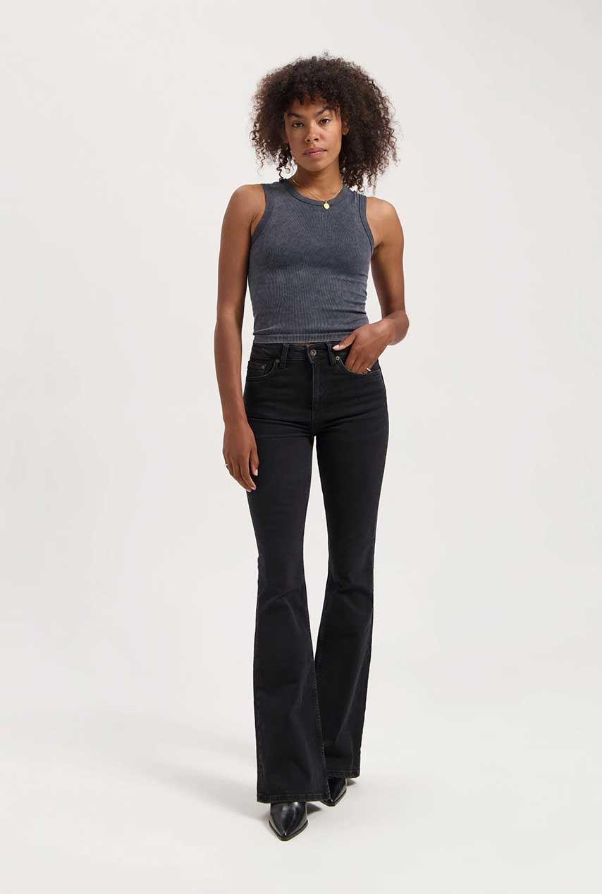 Deze antraciet flared jeans van Kuyichi is een echte favoriet en dat voel je! Extra hoge taille, wijde flare en een fit die mooi aansluit én comfortabel zit. Dankzij de mix van duurzame materialen beweegt deze jeans met je mee, de hele dag door.