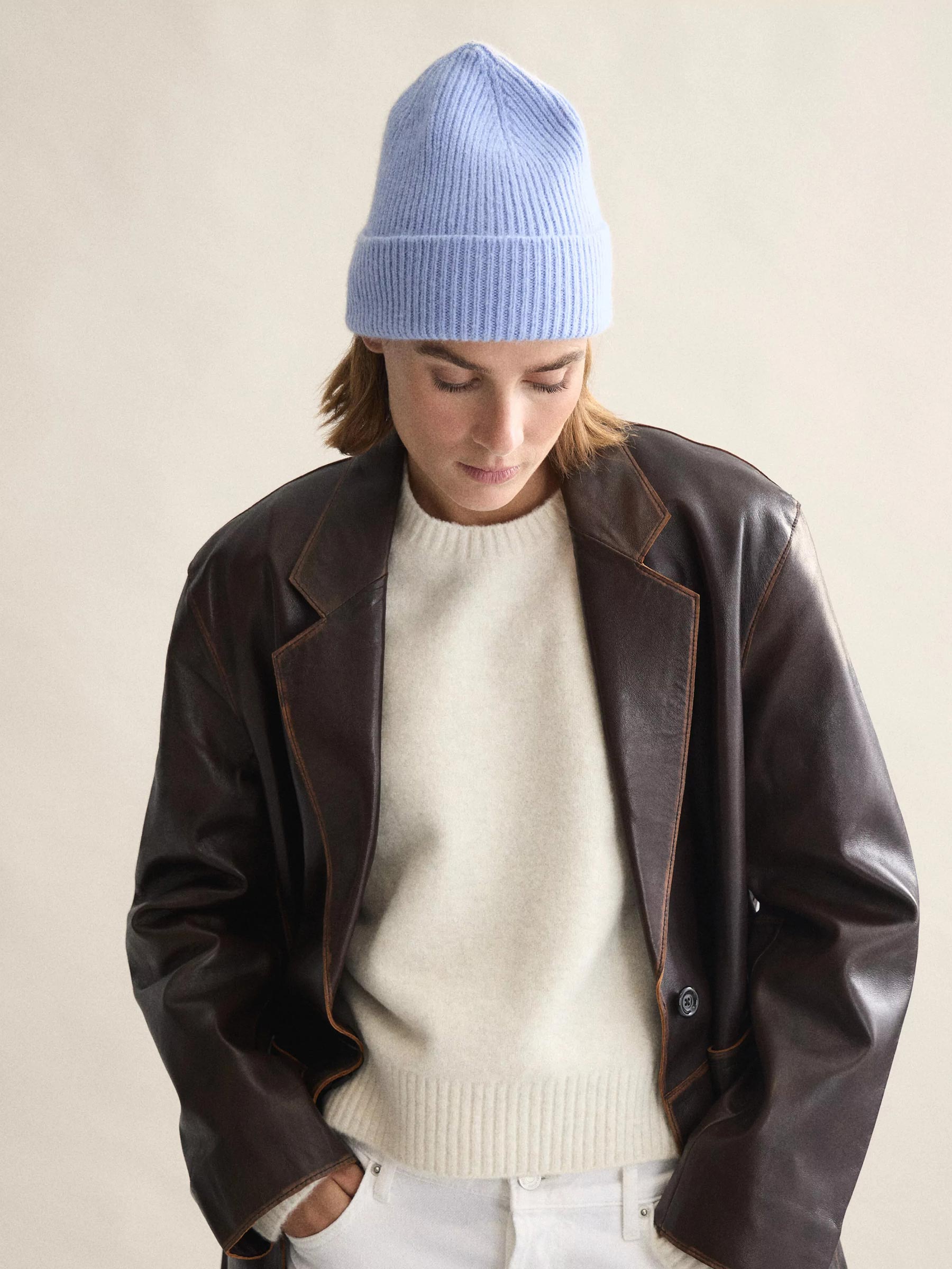 Deze lichtblauwe beanie van Le Bonnet is een frisse kleur die je winterlook kleur geeft. De mix van wol en alpaca voelt heerlijk zacht aan en houdt je hoofd warm op koude dagen. De ribstructuur en omgeslagen rand geven een tijdloze look die bij elke jas past.