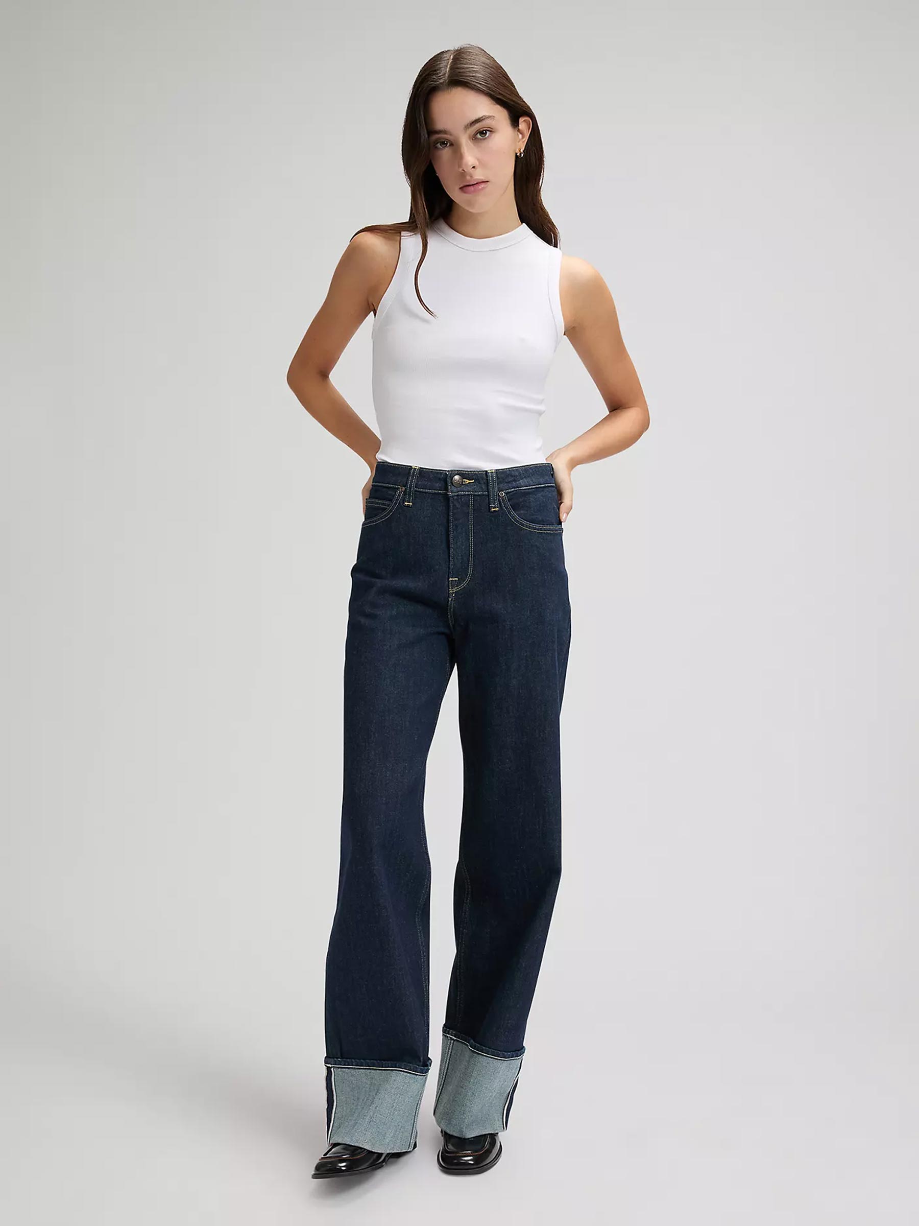 Deze donkerblauwe jeans van Lee is een echte eyecatcher met een stoere uitstraling. De wijde pijpen en omgeslagen zoom geven de broek een nonchalante look en maken dit model perfect voor elke dag. Combineer met een basic top of knit en je outfit staat meteen.