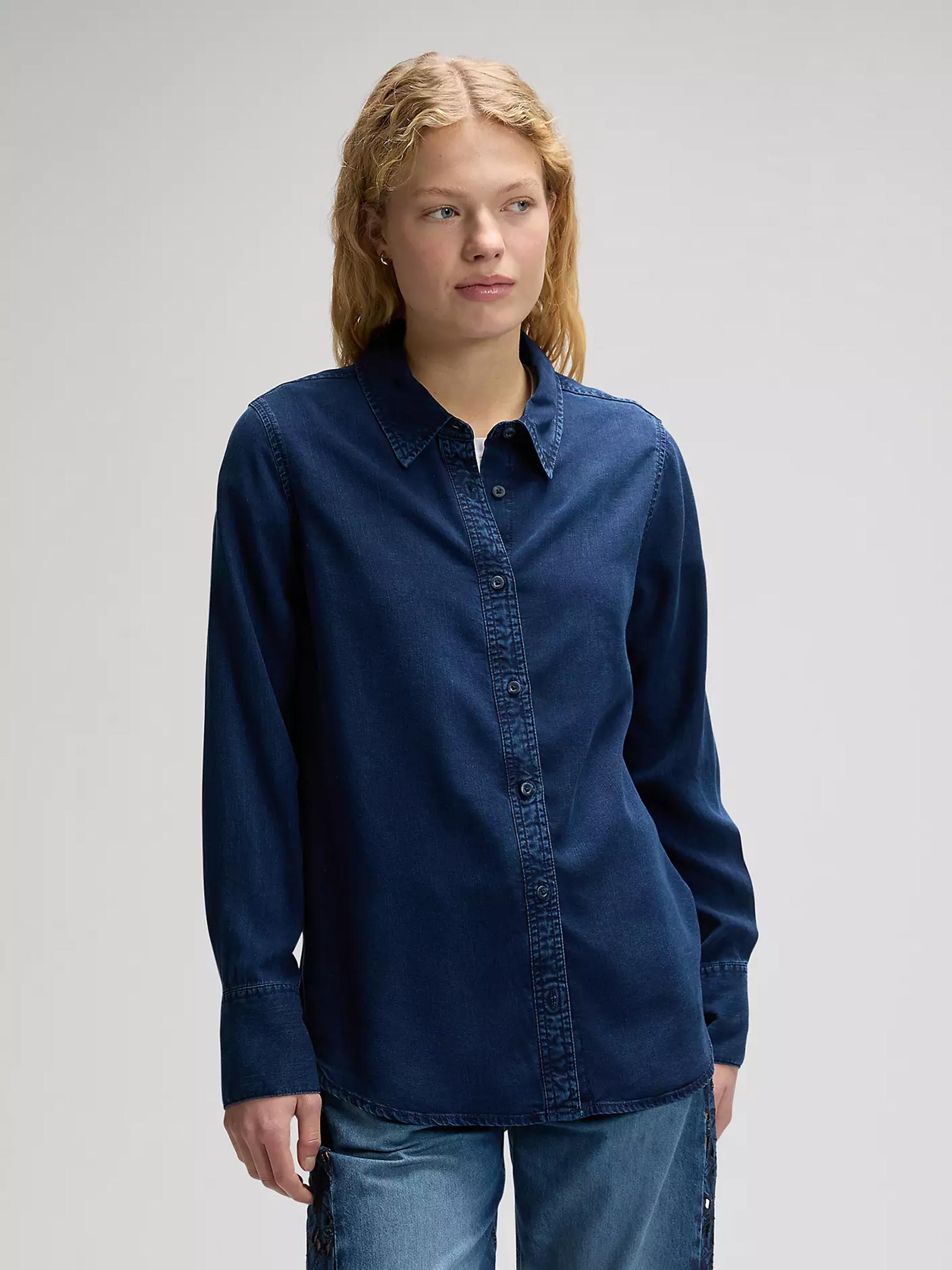 Deze donkerblauwe blouse van Lee is zo’n klassieker die altijd goed voelt. De soepele denim en tijdloze knoopsluiting geven een rustige look die je makkelijk combineert, van jeans tot pantalon. Fijn voor elke dag en net zo leuk wat meer aangekleed.