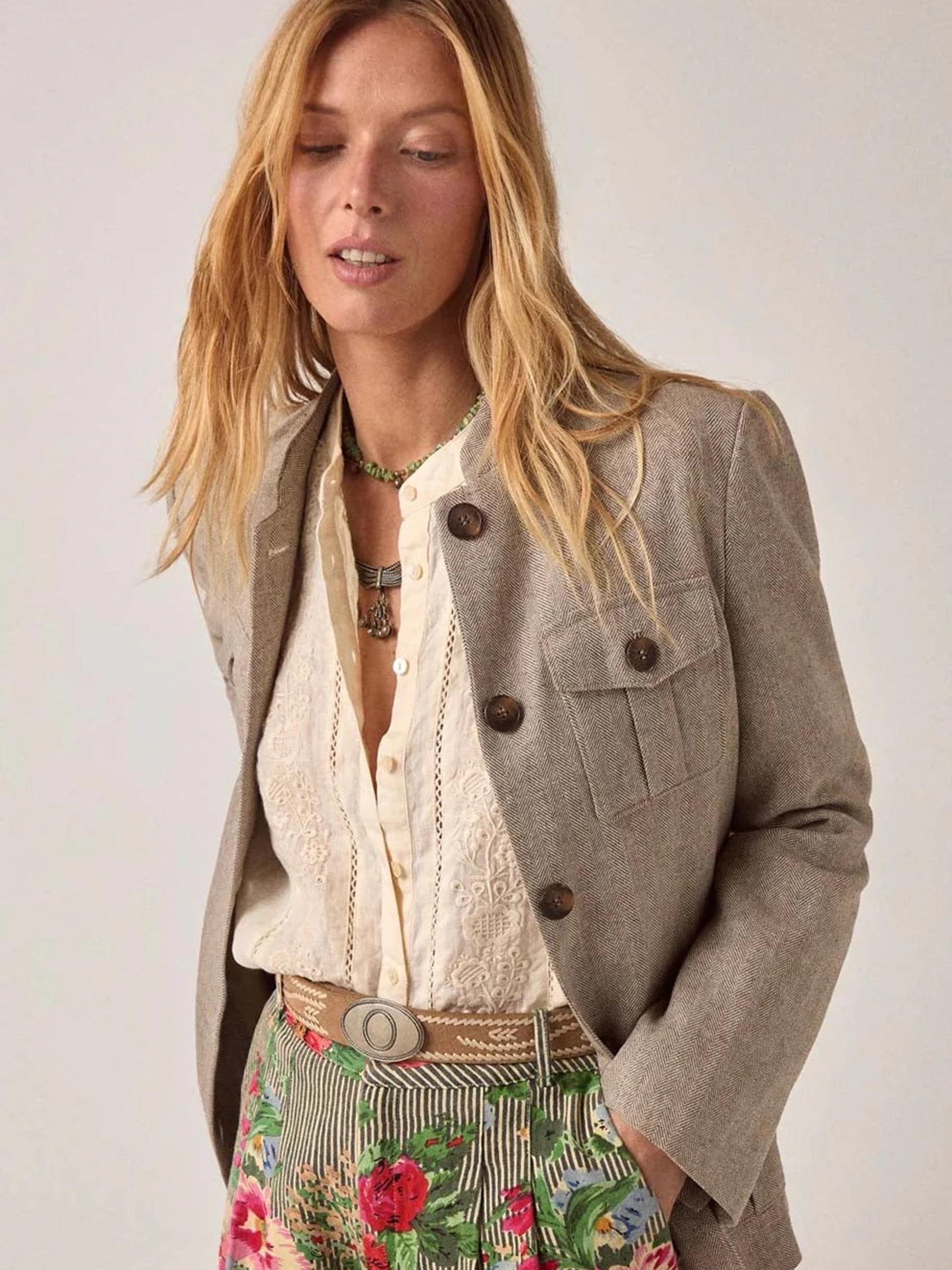 Deze crèmekleurige Virginia blouse van Maison Hotel is op details gebouwd: een rijke borduurband langs de knopenlijst, opengewerkte kantinzetstukken op de mouwen en een zachte katoen-linnenmix die alleen maar mooier wordt naarmate je hem vaker draagt. De kleur Ivory Whisper is warm zand zonder te geel of te wit te zijn, precies die tint die overal bij past. Maison Hotel laat elk stuk met de hand vervaardigen door ambachtslieden in India, wat je in elk detail terugziet.