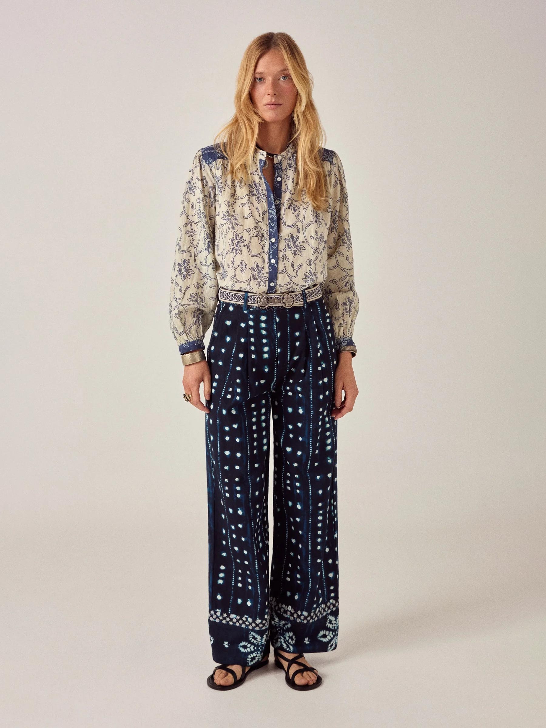 Draag de blouse met donkerblauwe of zwarte jeans om het blauw van de print te herhalen, of juist met een neutrale crèmekleurige broek voor wat rust. Laat hem open met een bandeau eronder voor een relaxte vibe, of knoopt hem helemaal dicht met een gevlochten riem om de taille.