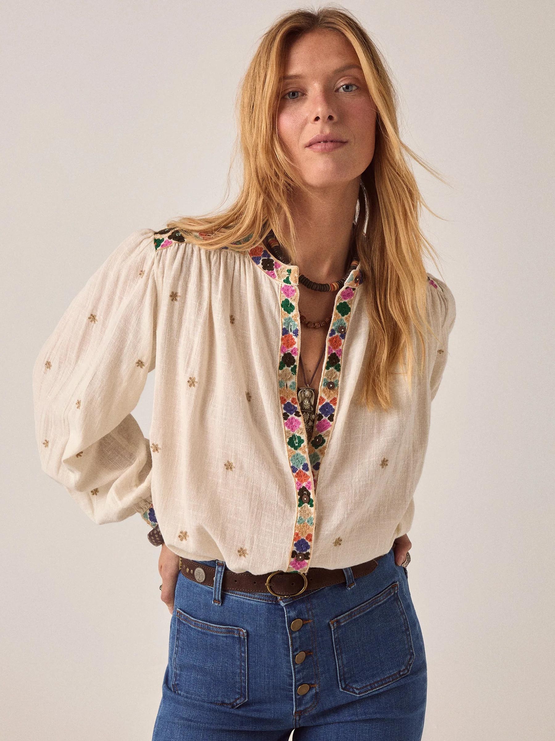 Combineer de blouse met je favoriete jeans en een brede leren riem voor een relaxte, boho-look. Draag er chunky sieraden bij en een gevlochten tas om de sfeer compleet te maken.