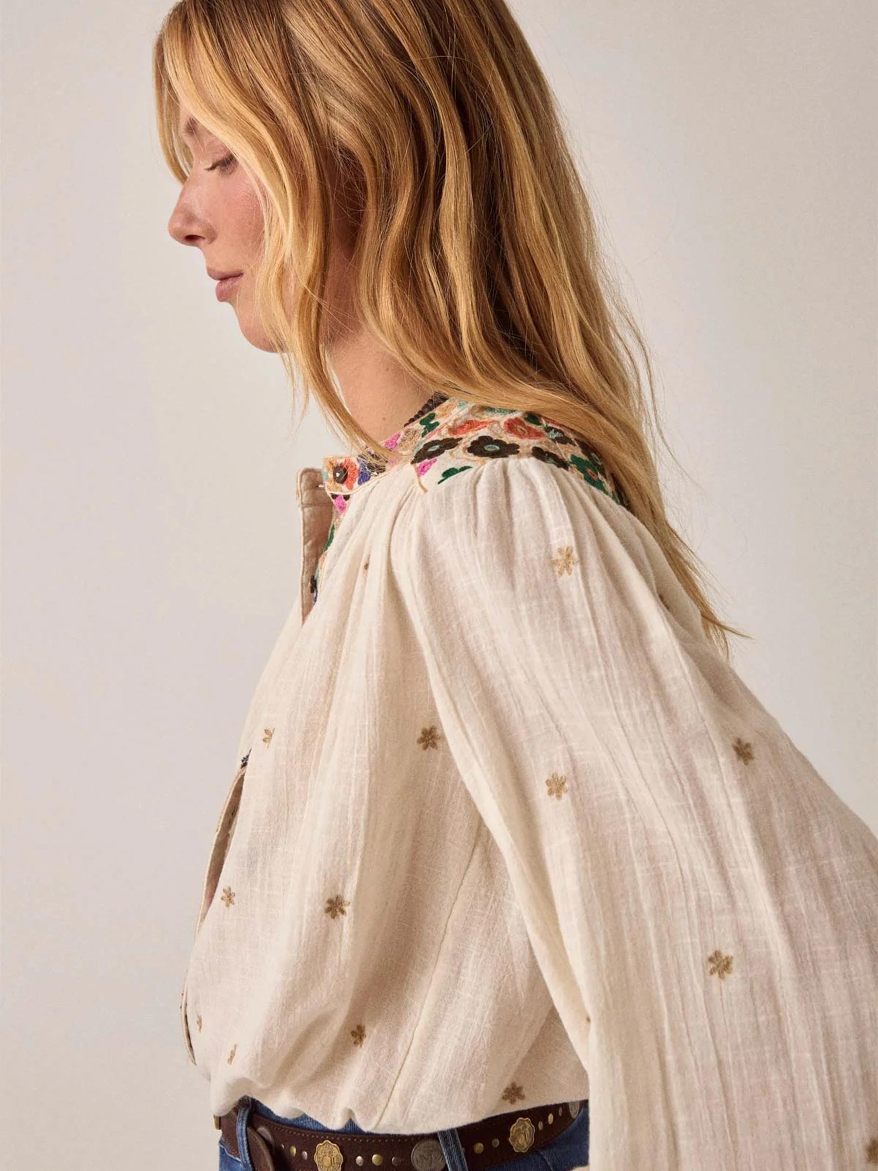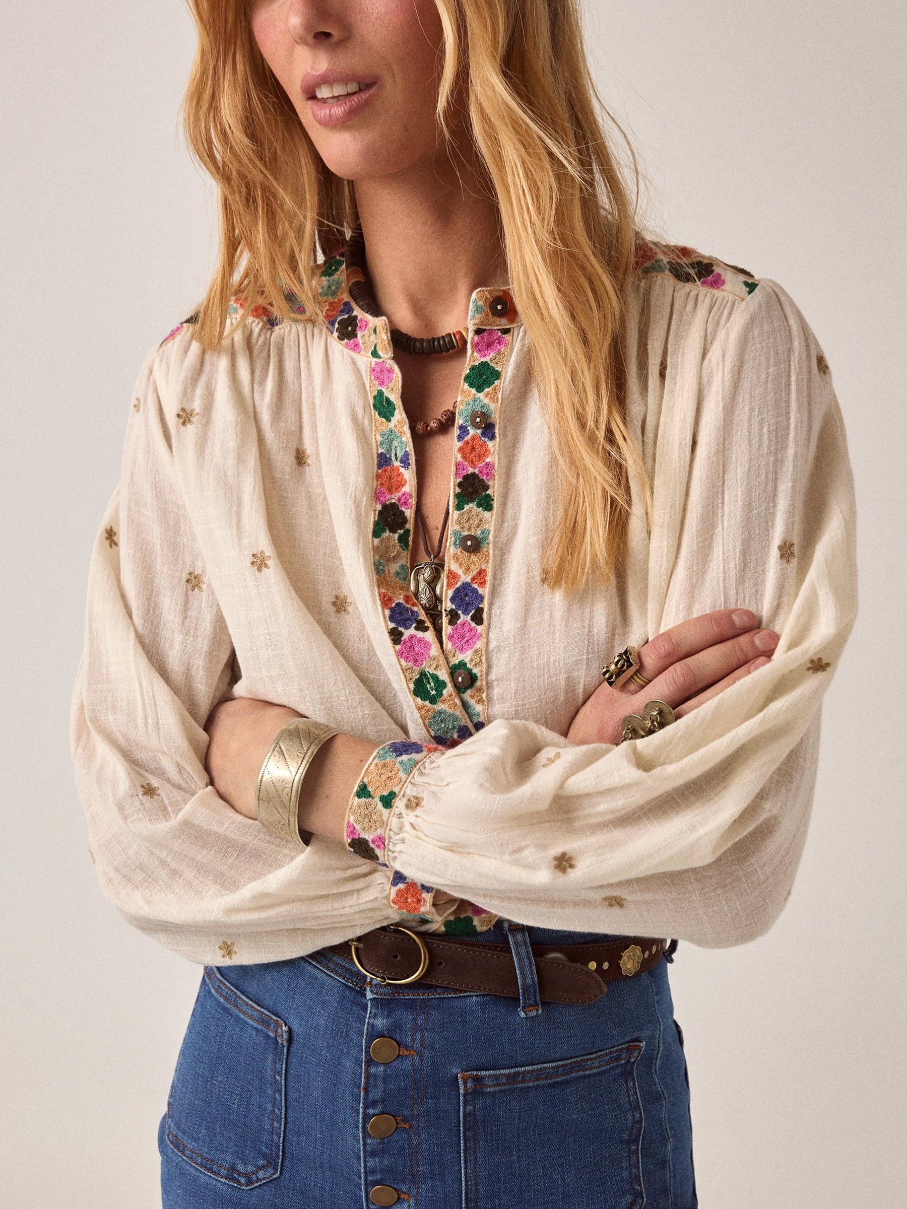Deze beige Cleo Udaipur blouse van Maison Hotel is zo'n stuk dat je steeds weer teruggrijpt. De lichte katoenen stof valt los en luchtig, terwijl de kleurrijke borduurdetails langs de rug meteen het oog trekken. Maison Hotel laat zich inspireren door de bohemienscultuur van de jaren 60 en 70, waarbij elk stuk met de hand is bewerkt door ambachtslieden in India.