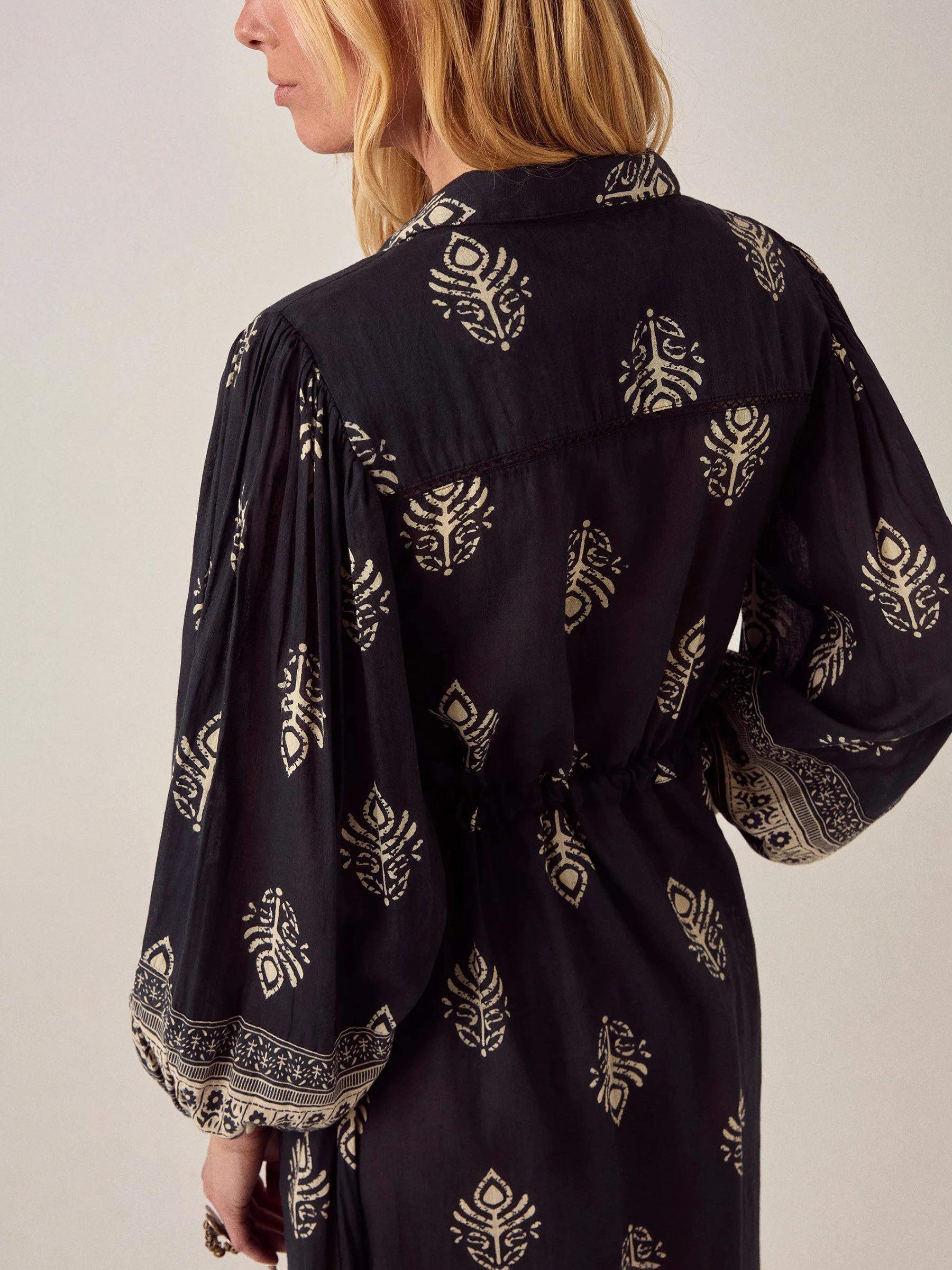 - Zwarte maxi blousejurk met henna-geïnspireerde bladerprint