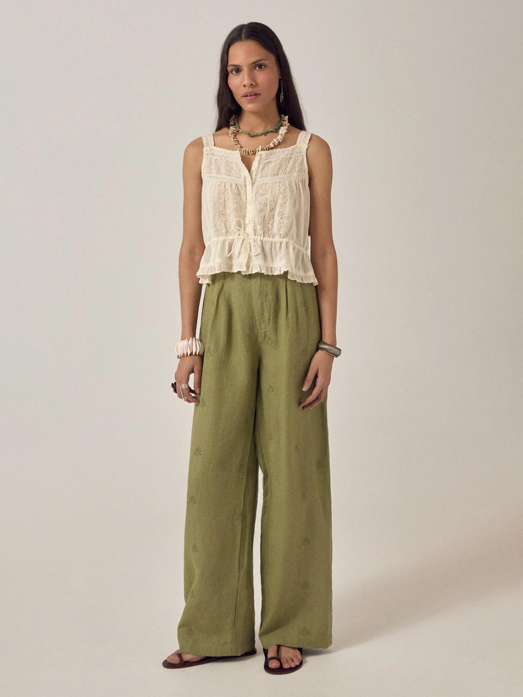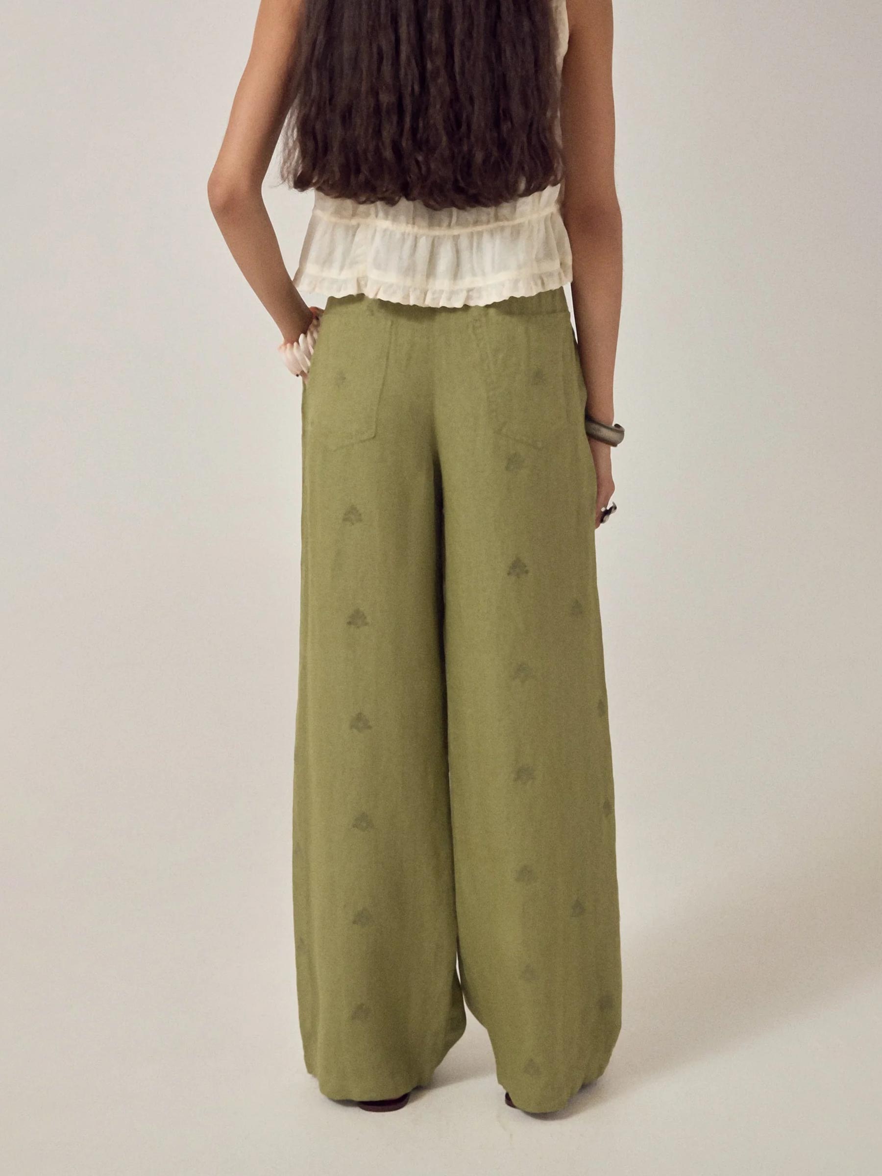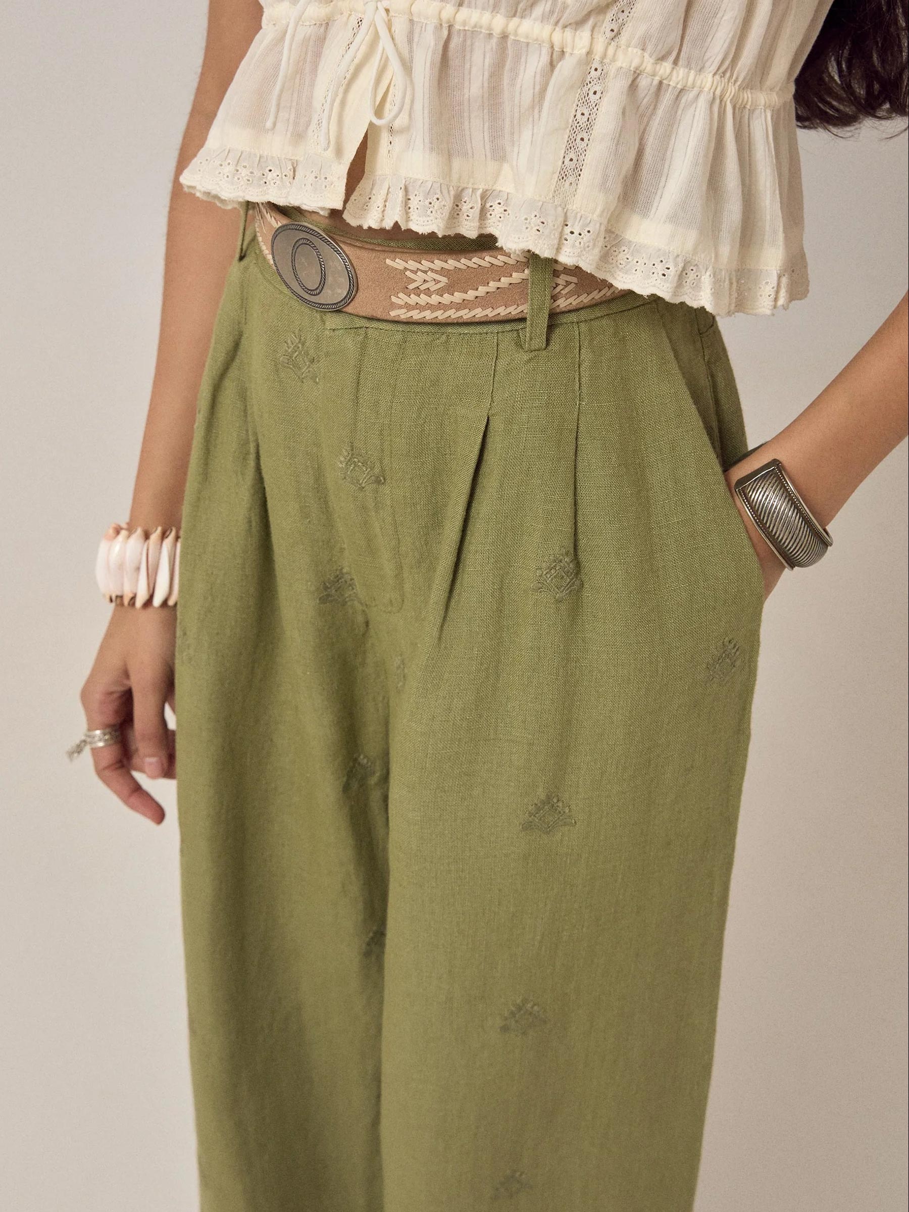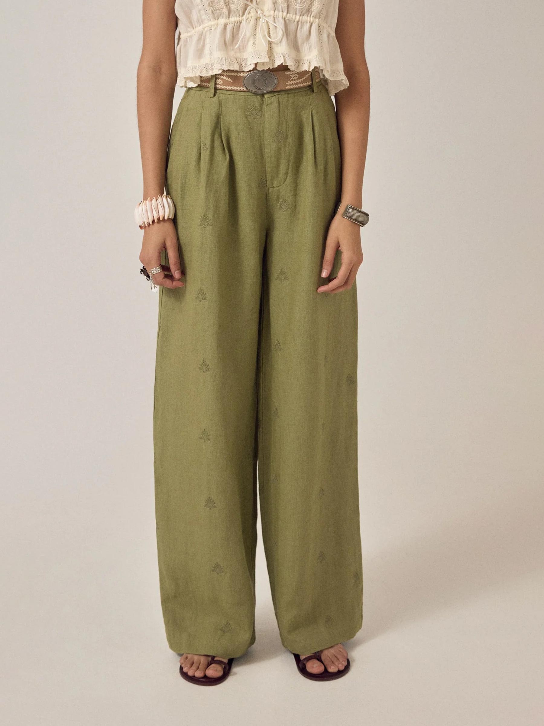 De mosgroene Otto pantalon van Maison Hotel valt op door de subtiele borduurmotiefjes op de stof en die diepe, aardse groentint. De katoen-linnenmix zorgt voor een broek die lekker licht aanvoelt maar toch zijn vorm behoudt, met een rechte, wijde pijp die mooi naar beneden valt. Met plooien aan de voorkant en een hoge taille zit hij ook nog eens heel comfortabel.