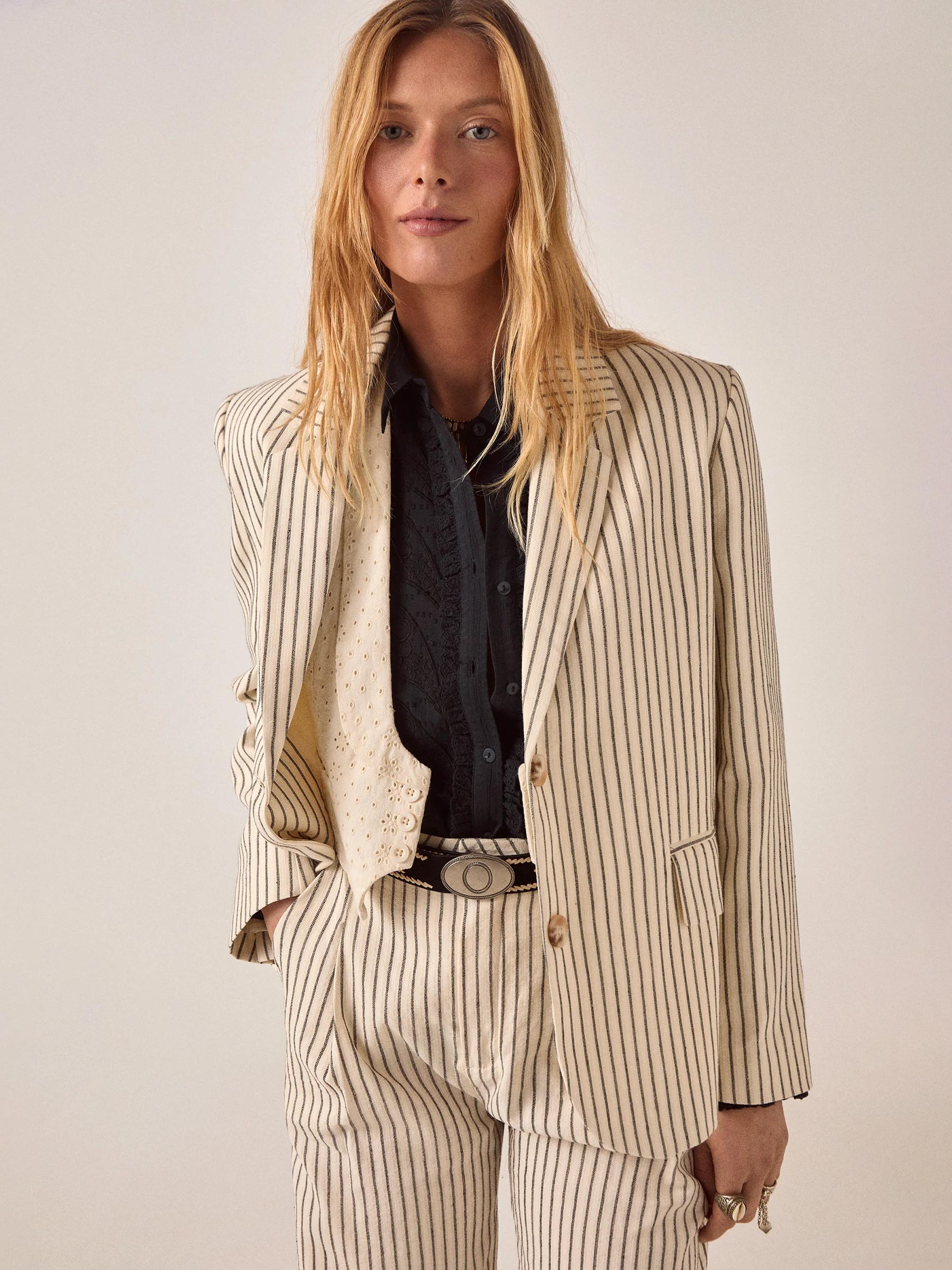 De crème Tomy Pant van Maison Hotel is een wide leg broek met verticale donkere strepen en een hoge taille met knoopsluiting en twee plooien aan de voorkant. De mix van katoen, hennep en linnen zorgt voor een stof die lekker ademt en soepel meegaat. Een broek die je net zo makkelijk combineert op een zomerse dag als op een avond uit.