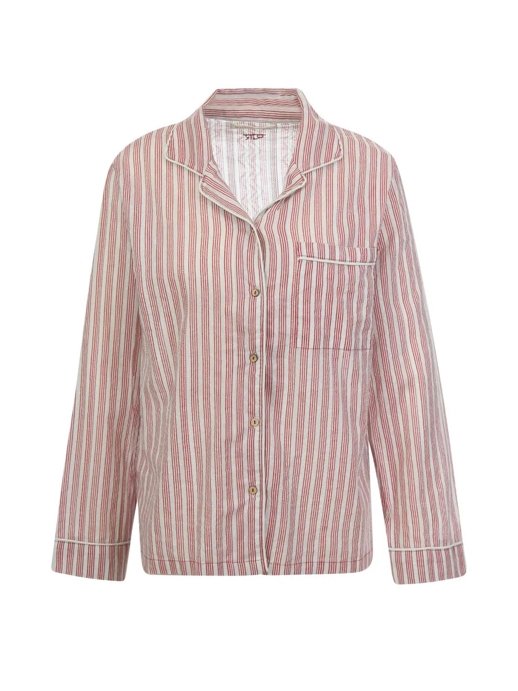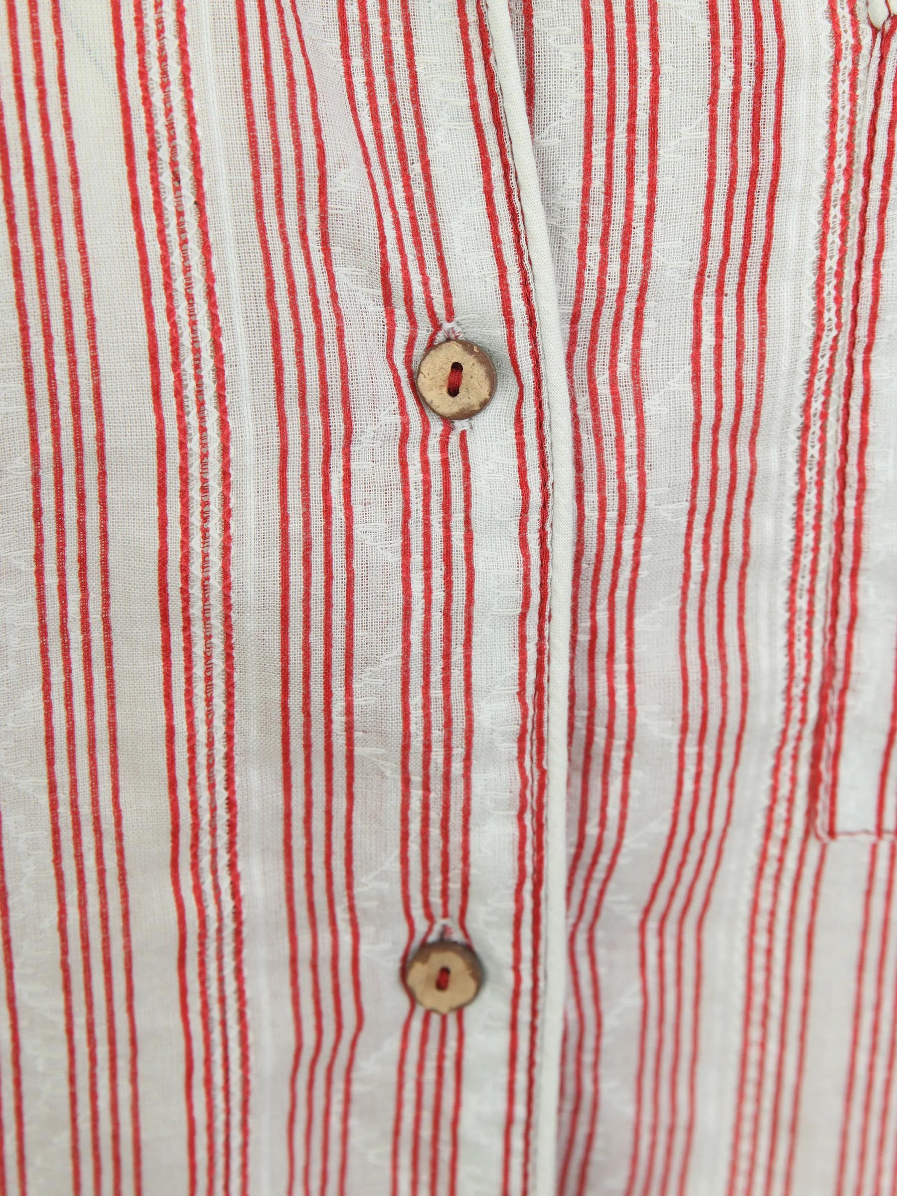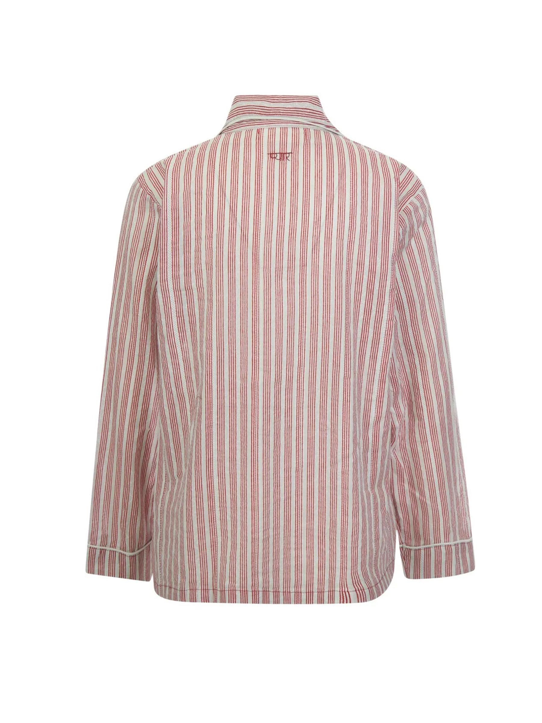 De Dada blouse van Maison Hotel is een eerbetoon aan de zorgeloze uitstraling van vintage pyjamashirts. Dit shirt is uitgevoerd in een luchtige katoenkwaliteit met een subtiele dobby-structuur en dieprode strepen op een offwhite basis. Het merk Maison Hotel brengt met dit ontwerp een stukje nostalgie naar je garderobe, geïnspireerd op dierbare kledingstukken uit het verleden.