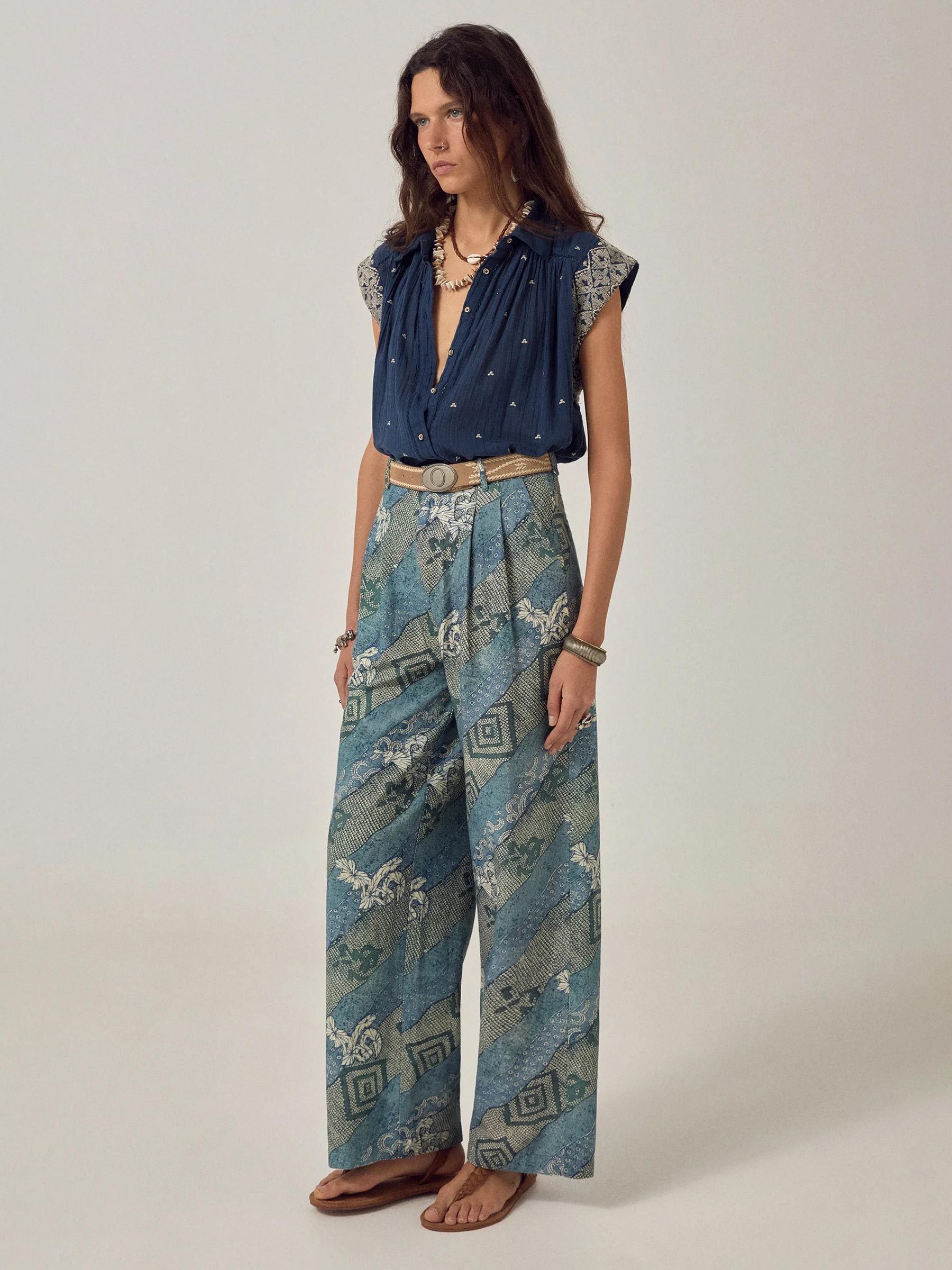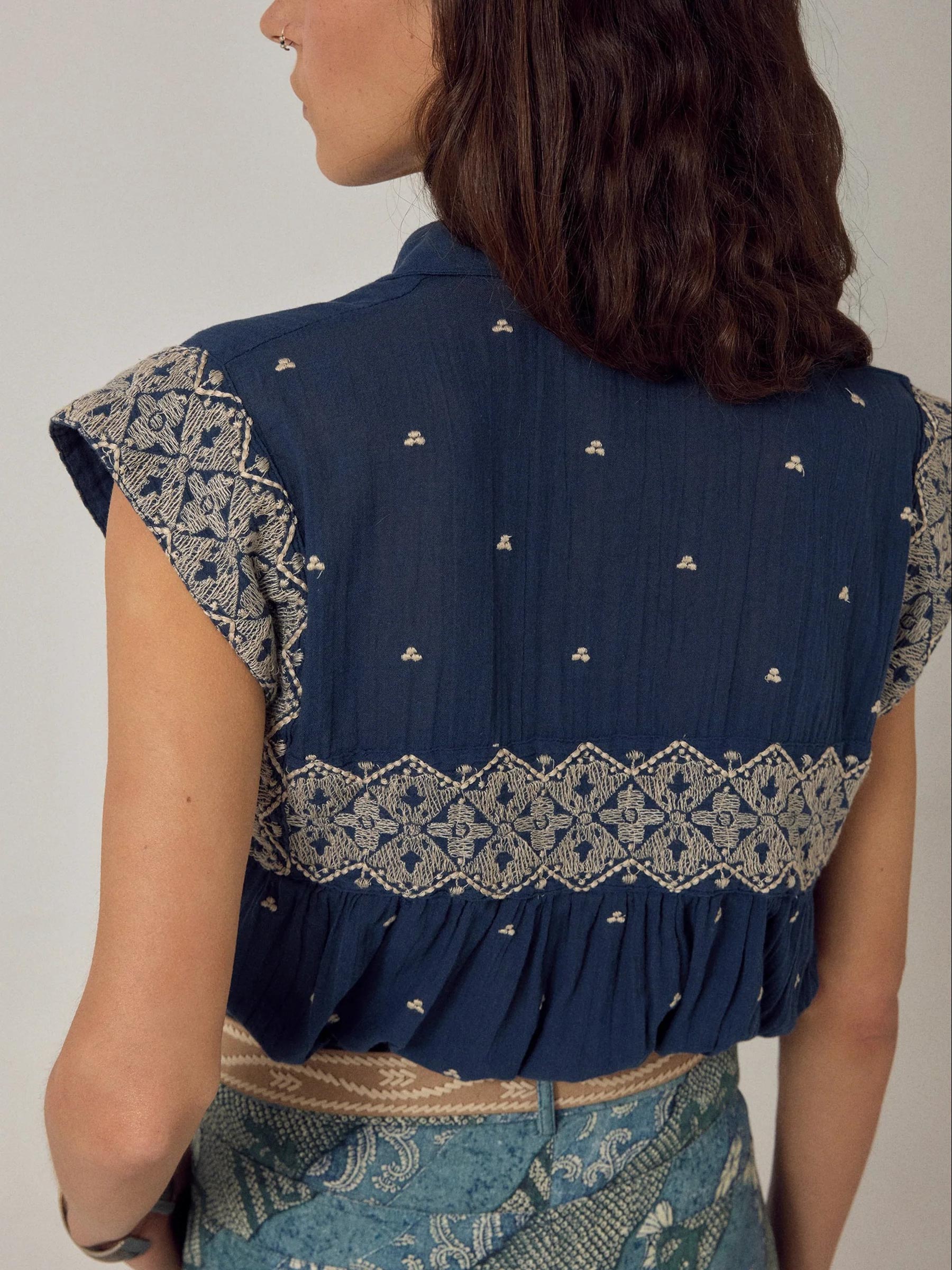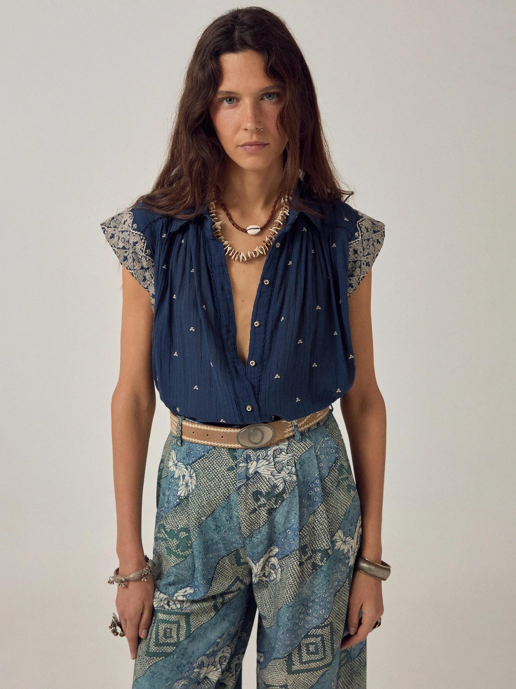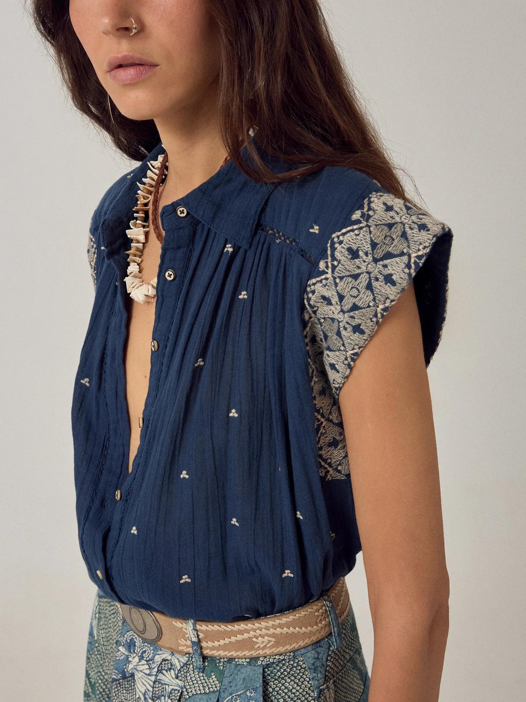 De donkerblauwe Karina blouse van Maison Hotel heeft iets heel eigens: een diepe, bijna inktblauwe kleur met kleine witte borduurmotiefjes verspreid over de stof, en kanten panelen op de schouders die net dat beetje extra textuur geven. De blouse valt goed op het lichaam zonder strak aan te zitten, en de zachte katoenen stof is licht en ademend. Maison Hotel maakt al zijn stukken met ambachtelijke aandacht voor detail, handgemaakt in India.
