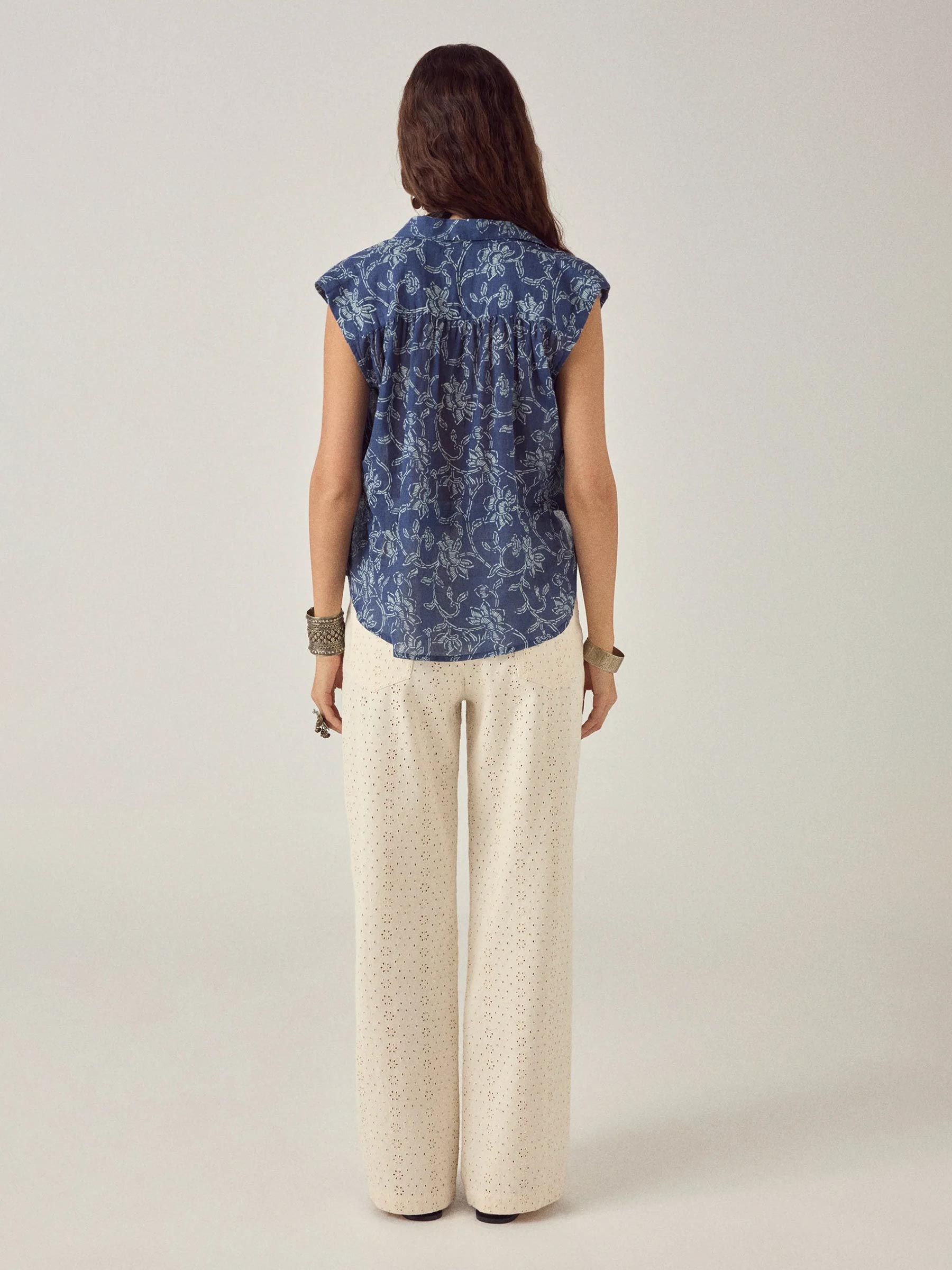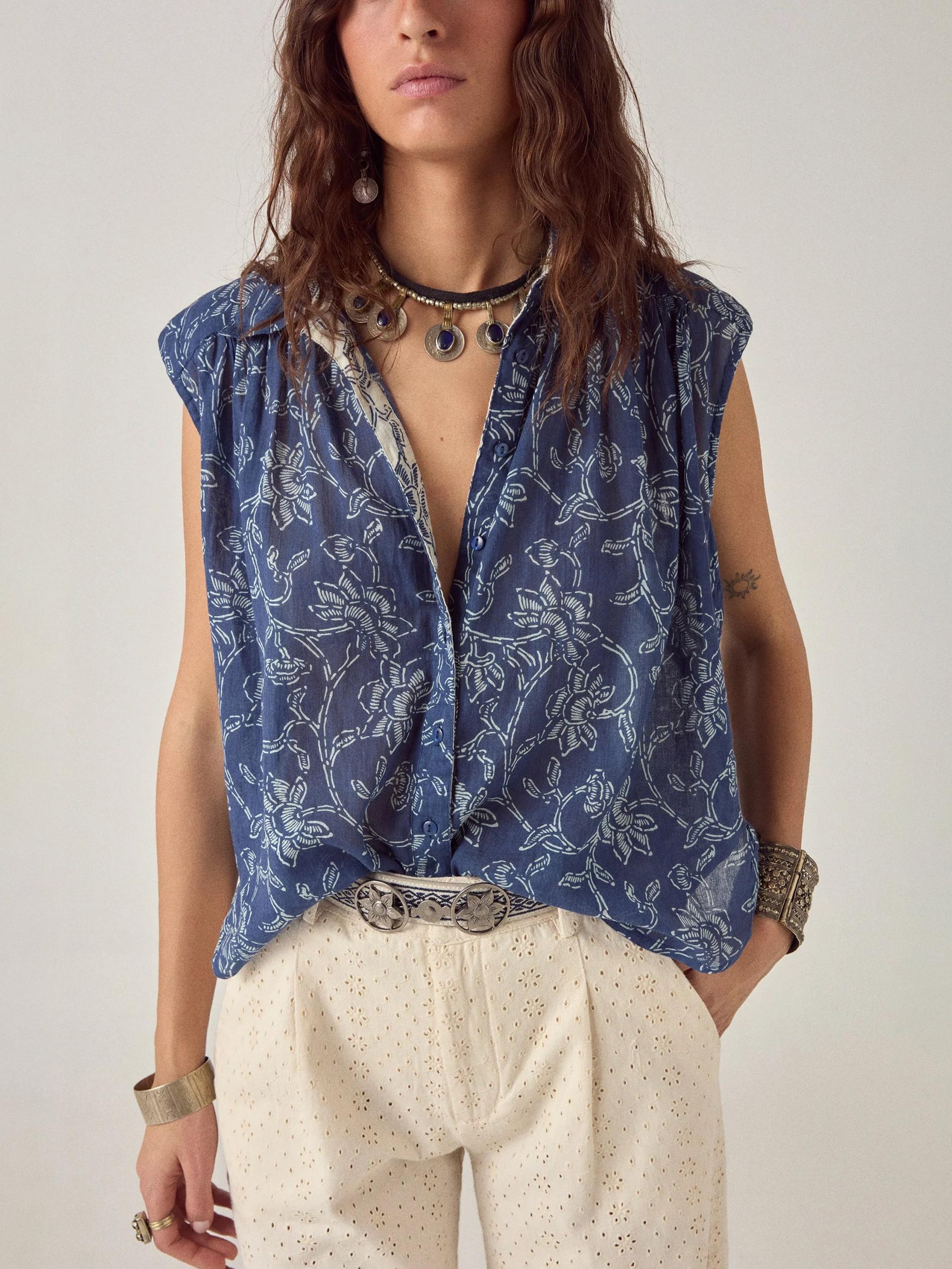 De indigo Mina blouse van Maison Hotel heeft een all-over print van sierlijke crème bloemenranken op een diepe blauwe fond. De plooitjes op de schouders geven net wat volume zonder dat het druk wordt, en de lichte katoenen stof valt soepel en beweegt mooi mee. Maison Hotel maakt elk stuk met de hand in India, wat je terugziet in de details.