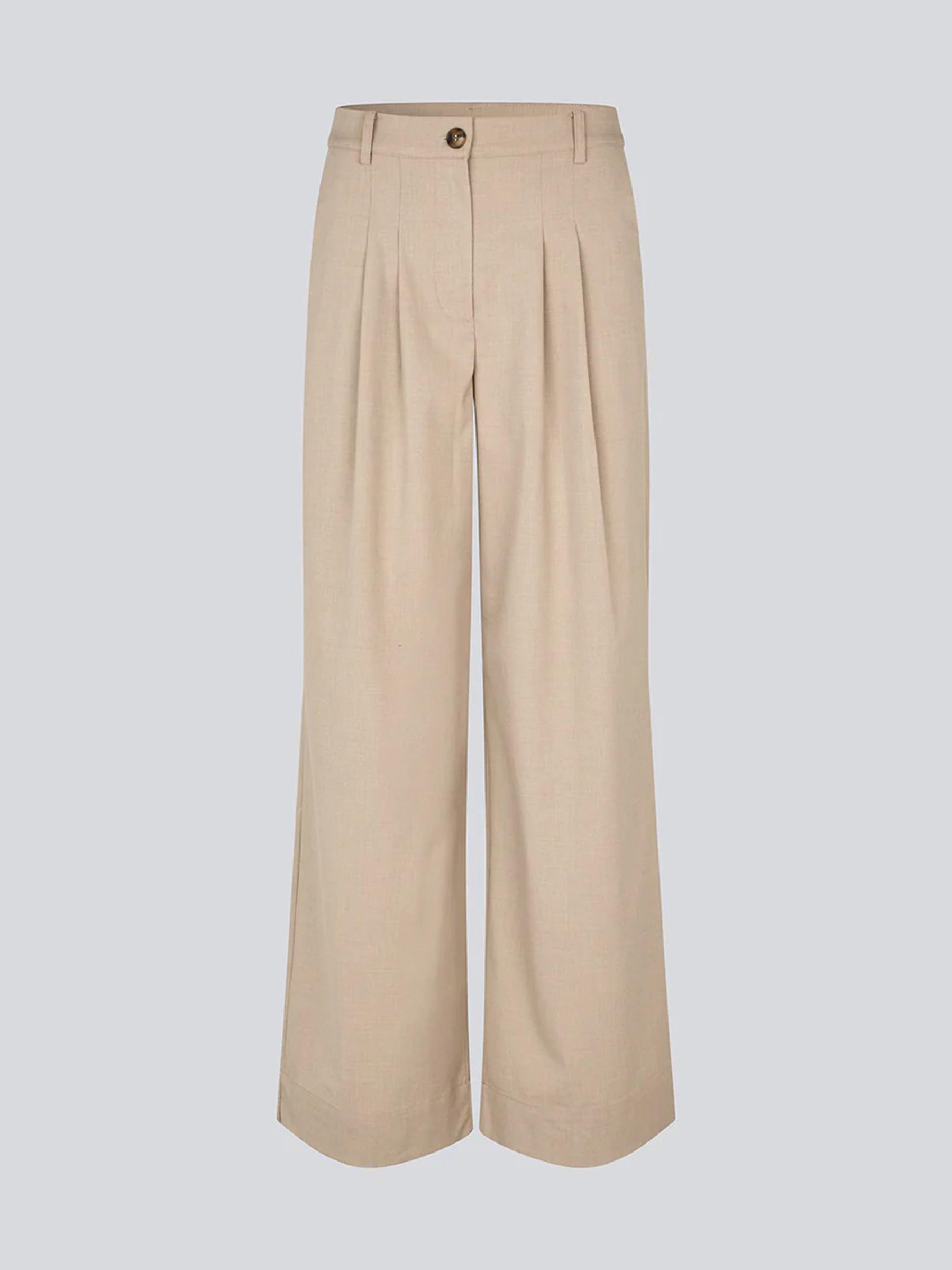 De beige TuesdayMD pantalon van Modström is de broek die je keer op keer pakt omdat hij overal bij te combineren is. De brede pijpen met nette plooien vooraan geven hem een strakke look, terwijl de soepele stof zorgt dat hij de hele dag comfortabel blijft. Combineer hem met de bijpassende TuesdayMD SS blazer voor een compleet pak dat echt staat.