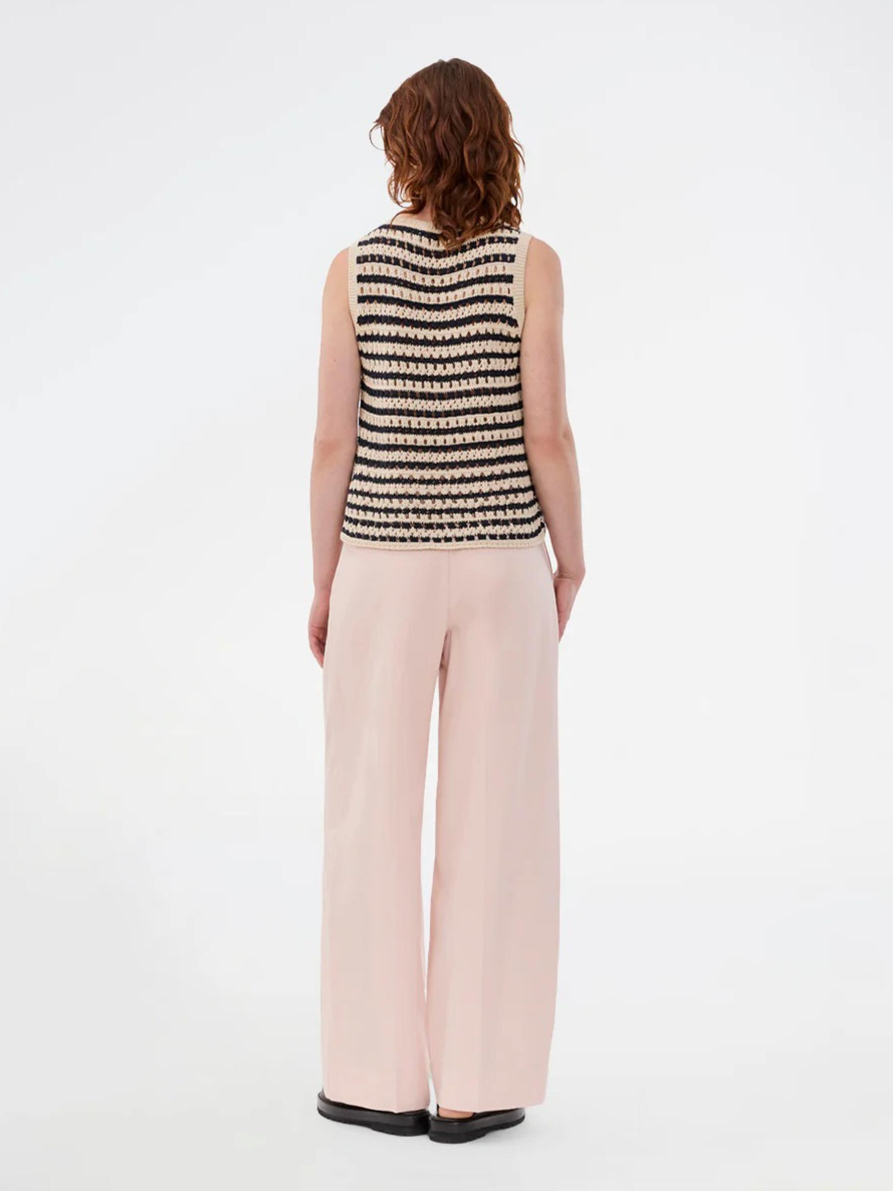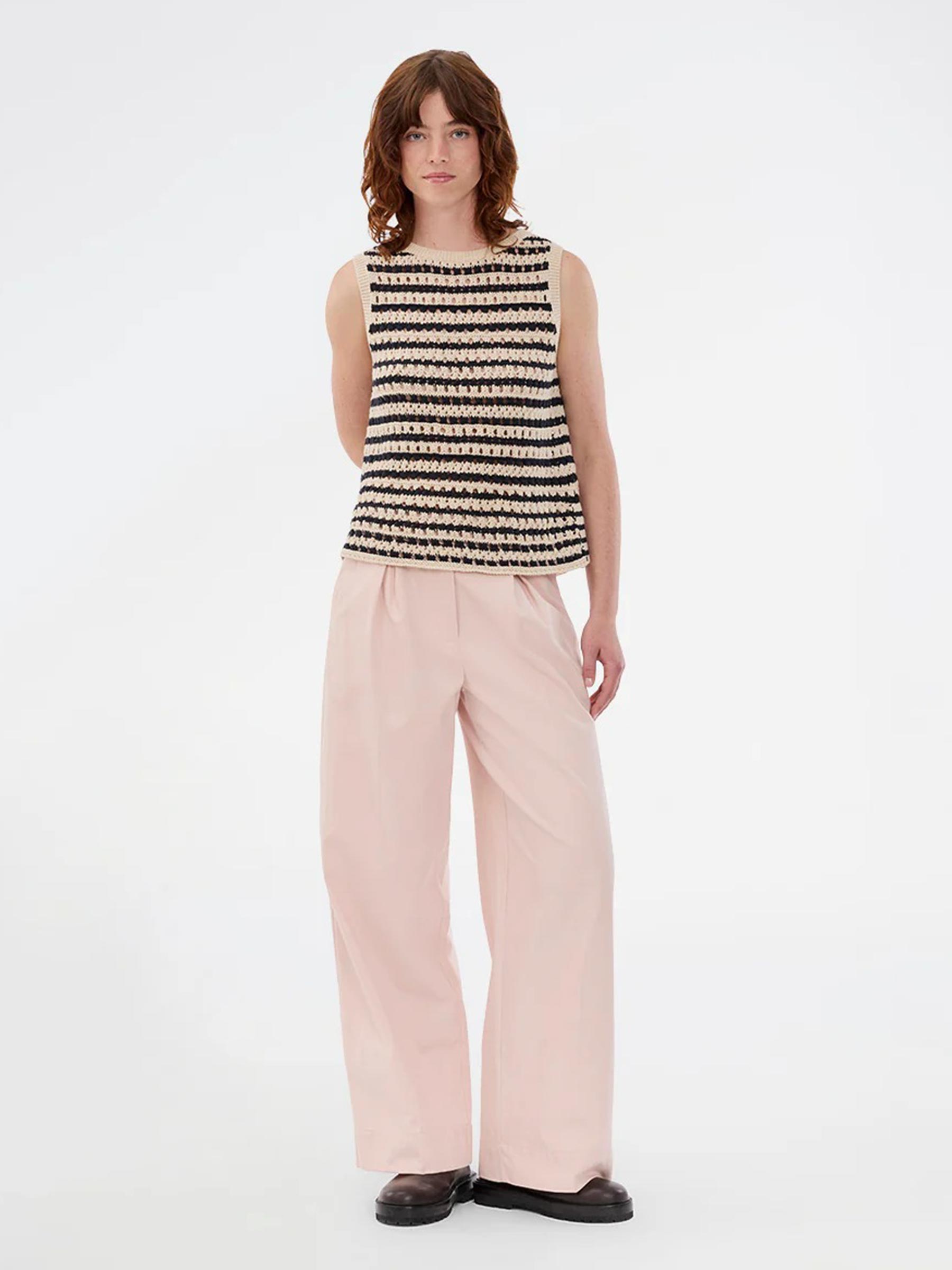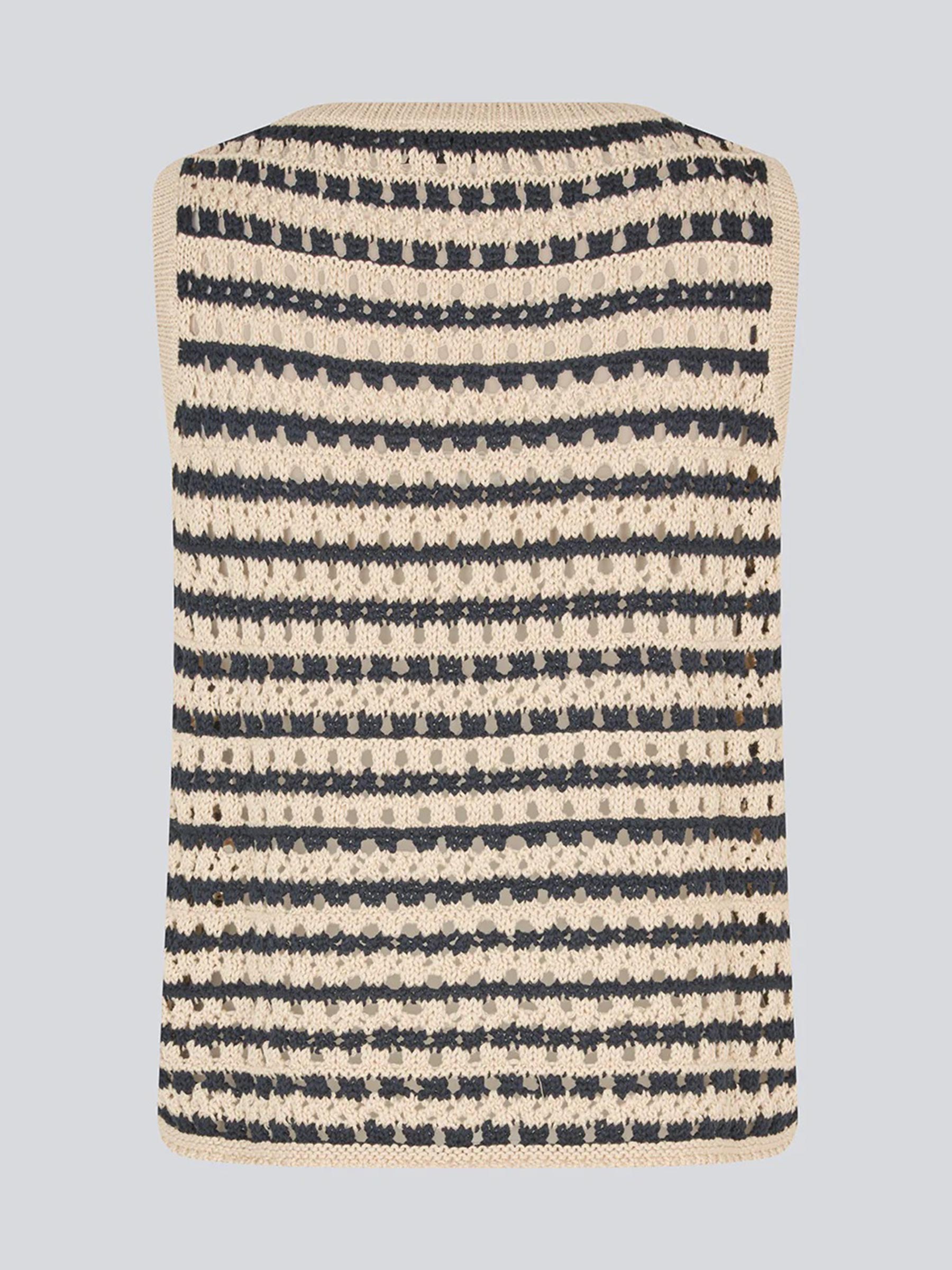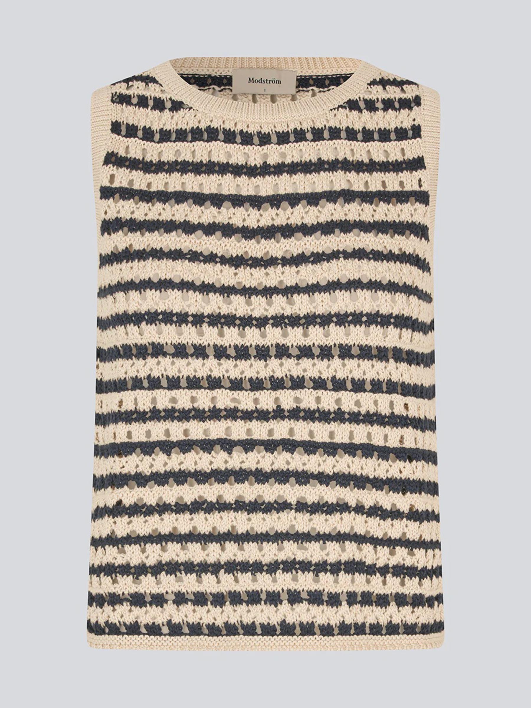 De beige VesterMD stripe top van Modström is zo'n top die meteen opvalt door zijn open breiwerk en grafische streep print. Hij combineert het warme van gebreid met de luchtigheid die je nodig hebt, want het opengewerkte patroon laat deze top ademen. Gemaakt van 100% biologisch katoen, dus ook nog eens bewust gekozen.