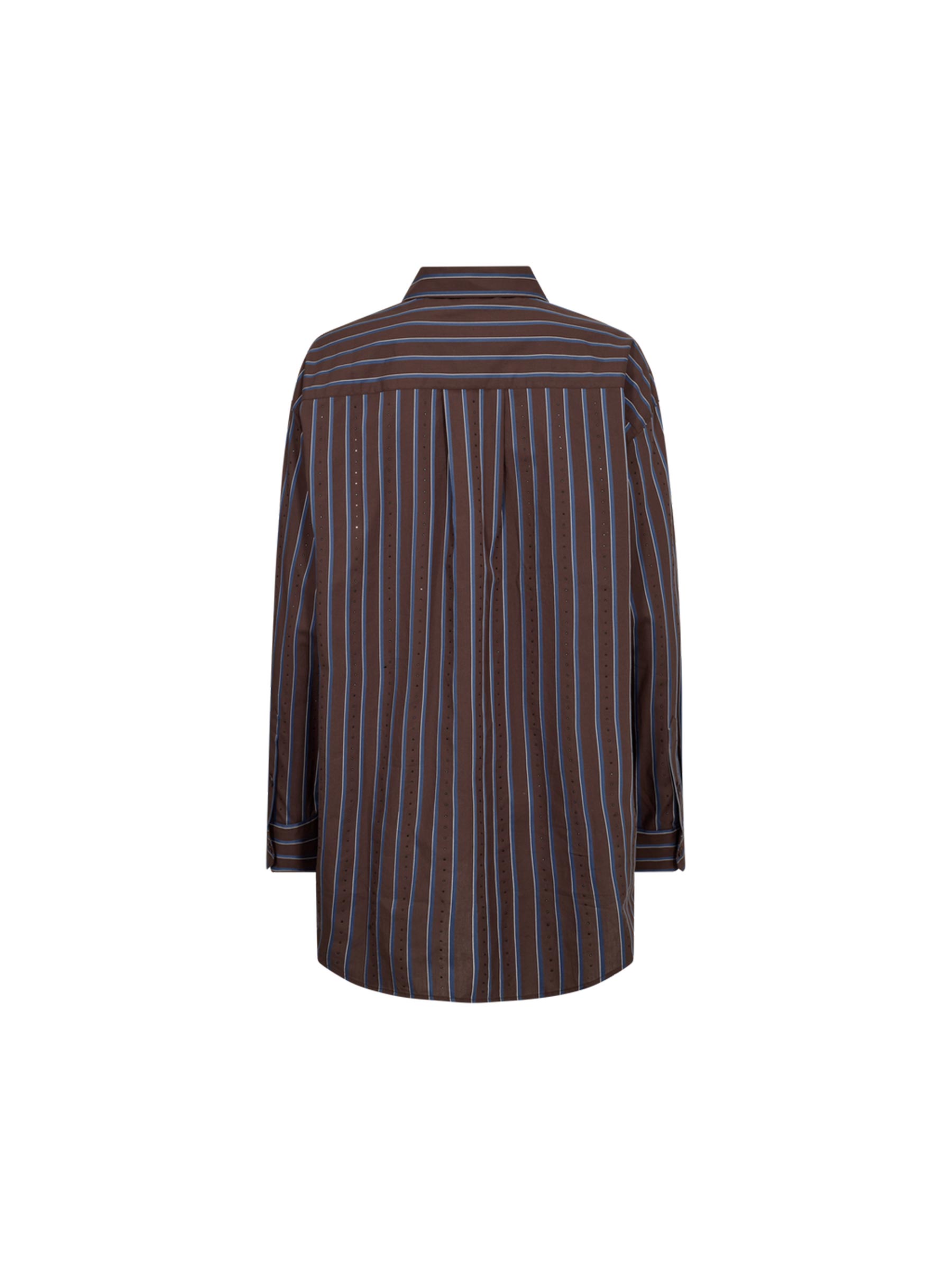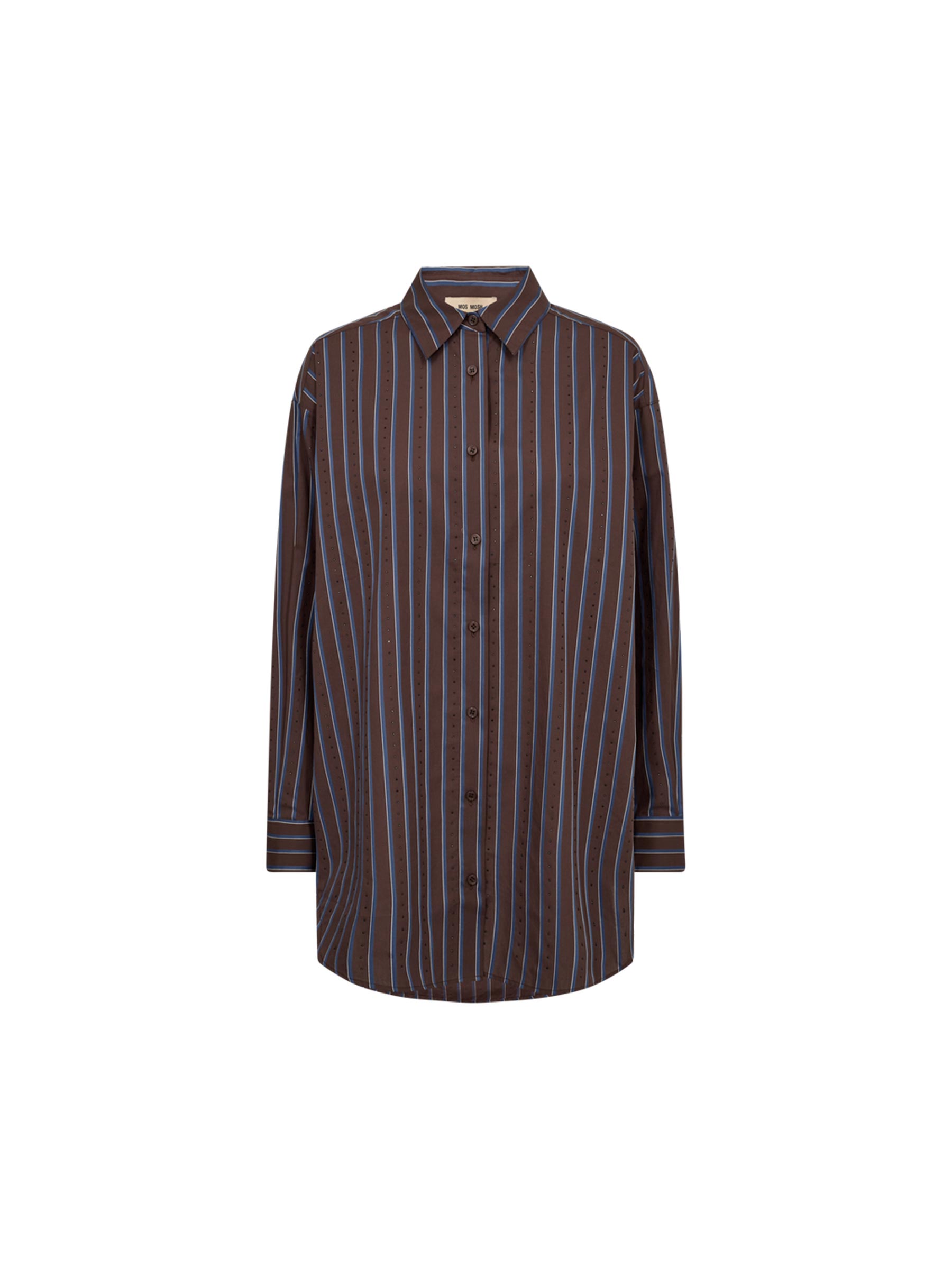 Deze donkerbruine gestreepte blouse van Mos Mosh combineert een klassieke look met subtiele glam. De verticale strepen worden afgewisseld met kleine steentjes die een luxe glans geven. Draag hem nonchalant over een jeans of ingestopt in een pantalon voor een vrouwelijke twist aan je everyday look.