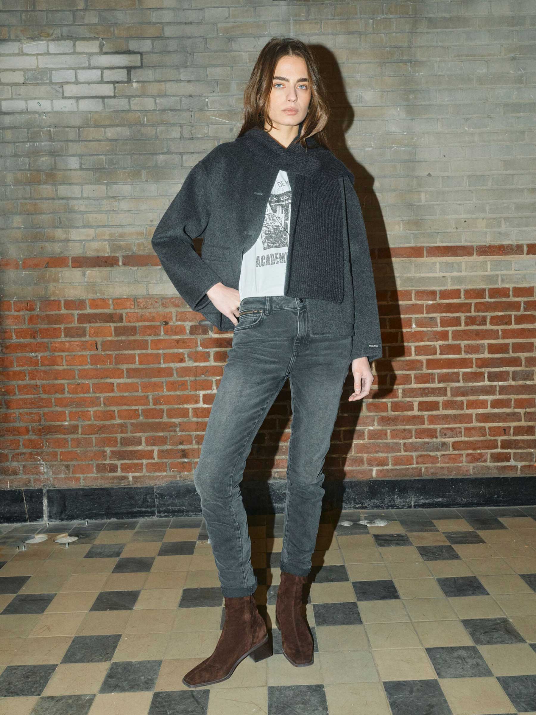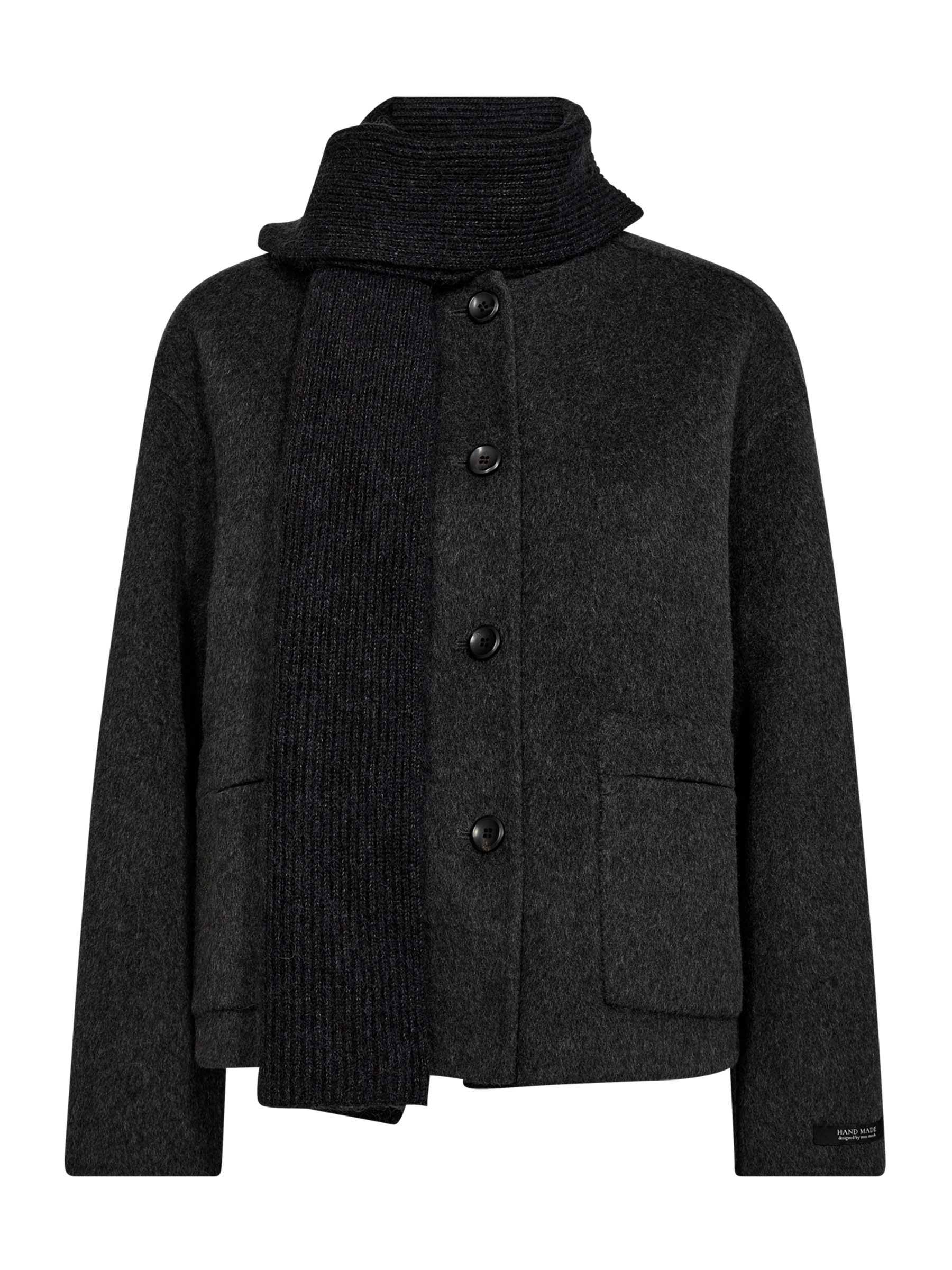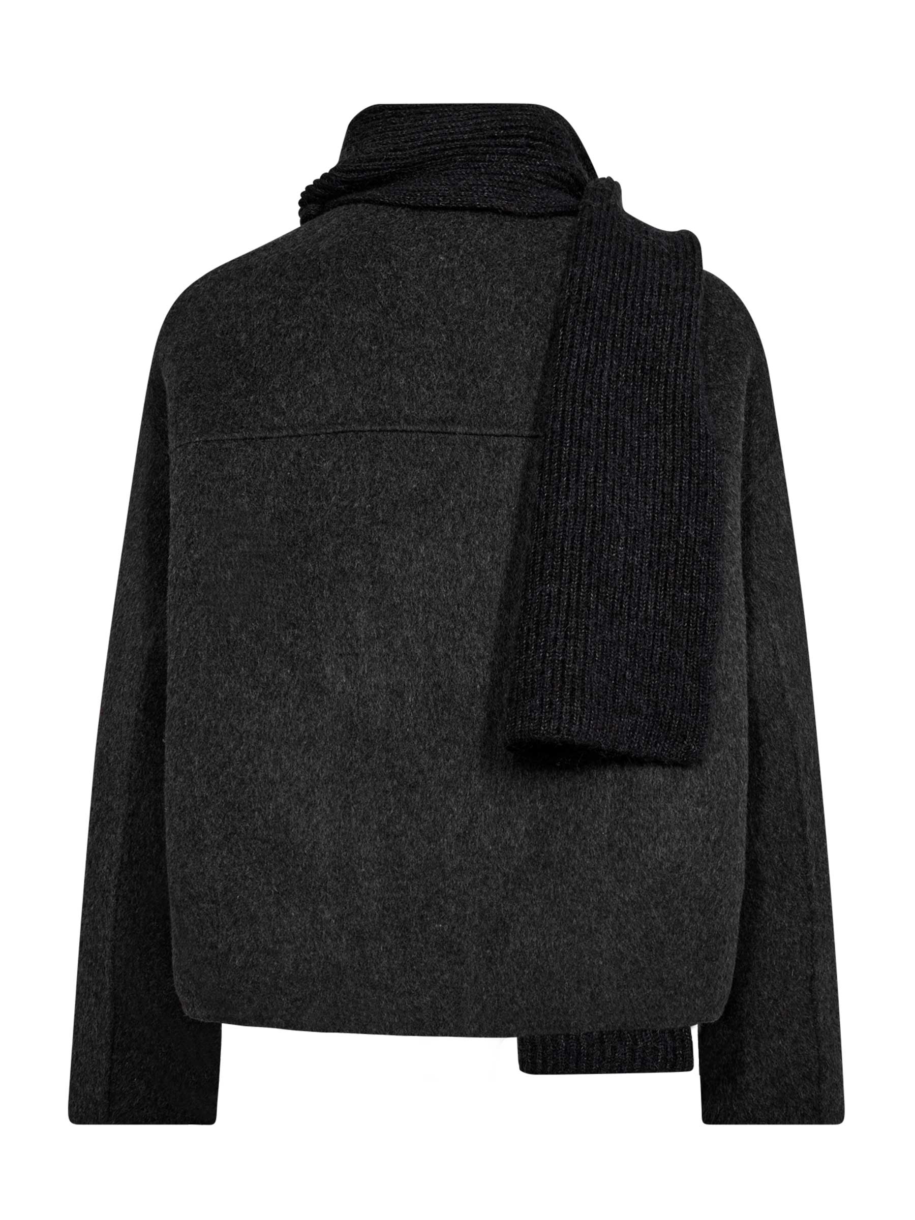 Dit donkergrijze wollen jas van Mos Mosh combineert warmte en stijl in één item. Het korte model met knoopsluiting en bijpassende sjaal geeft een moderne, cozy uitstraling en is ideaal voor frisse dagen. Draag hem over een knit en wide leg jeans voor een tijdloze look.