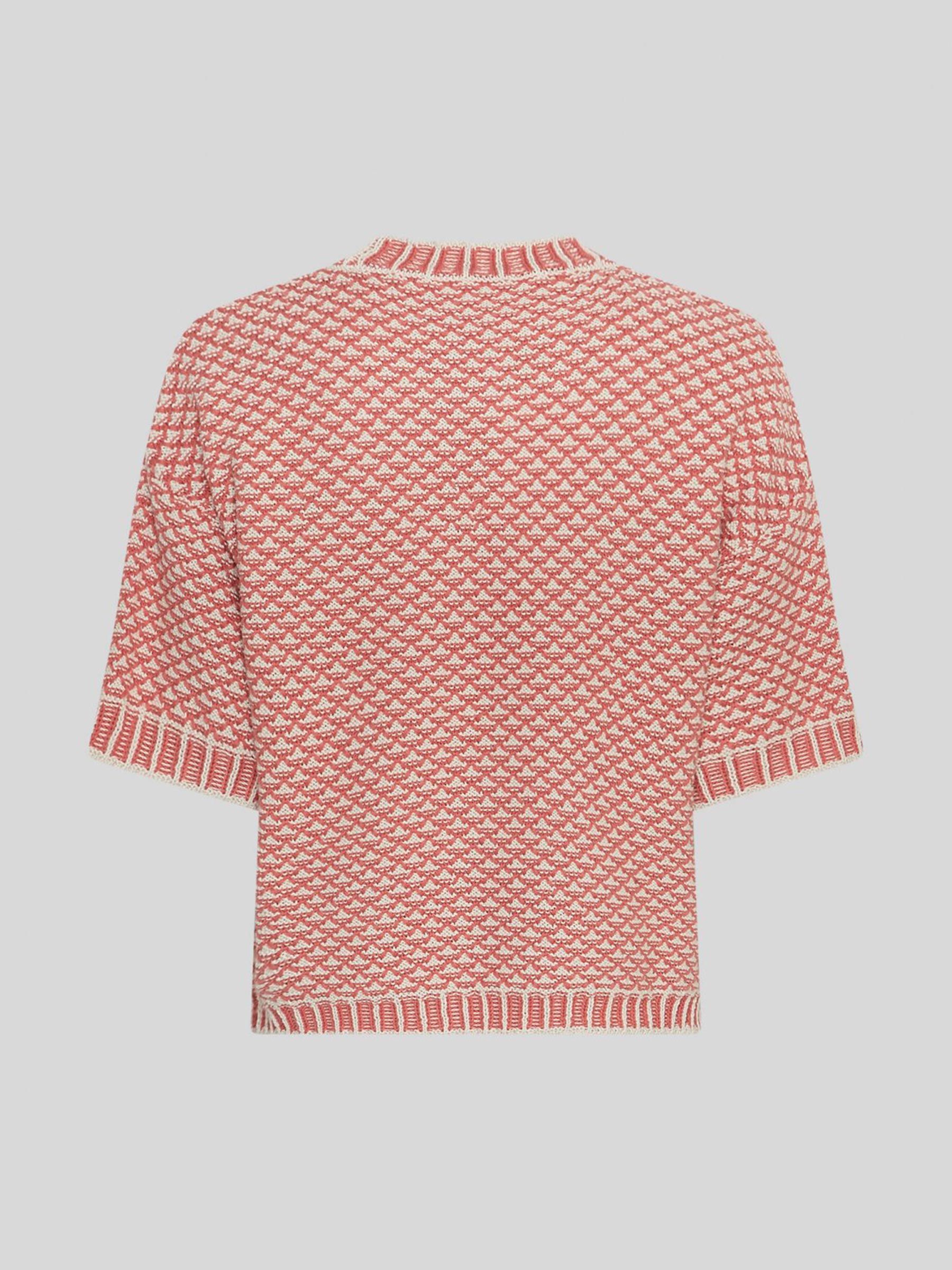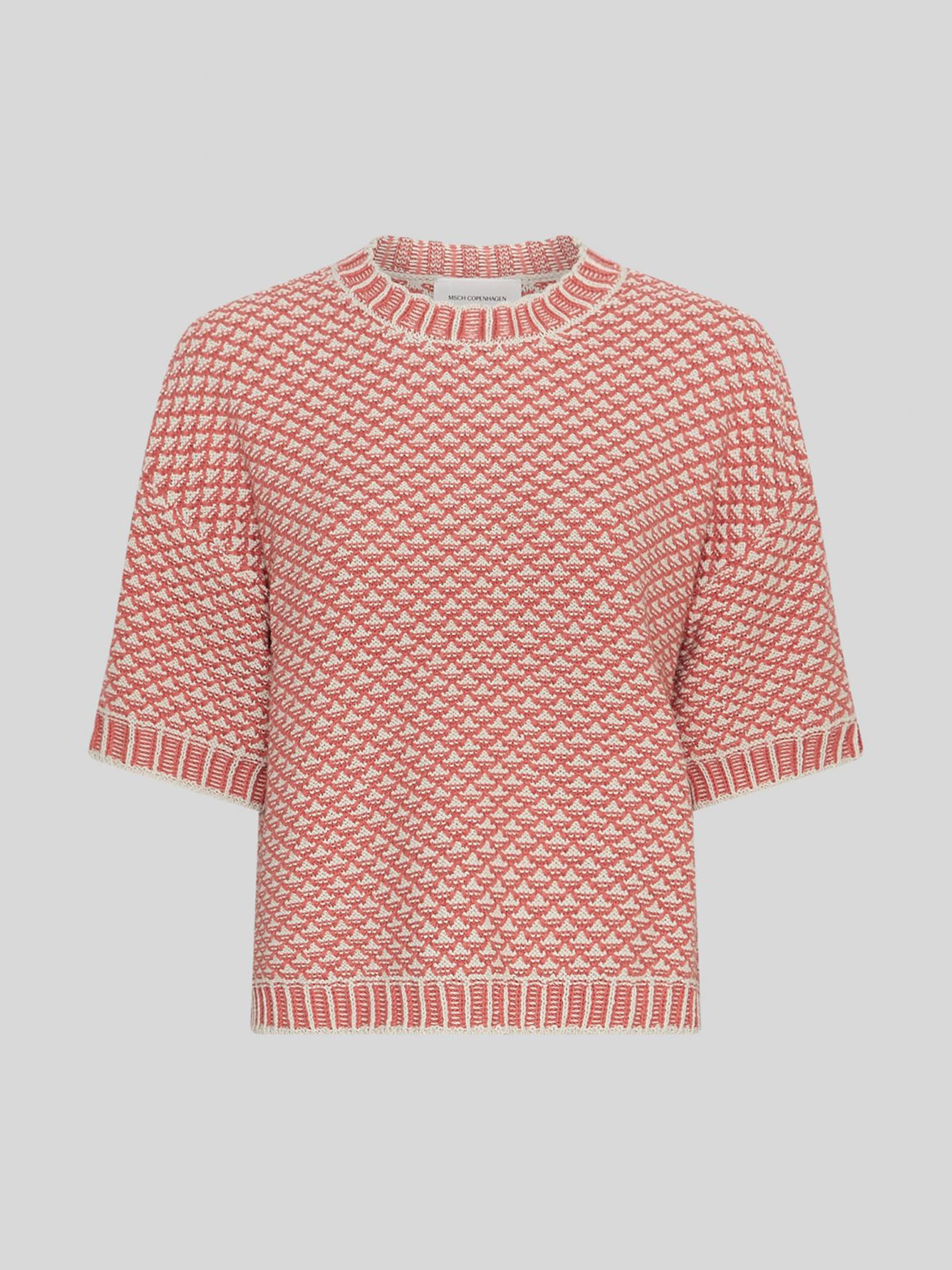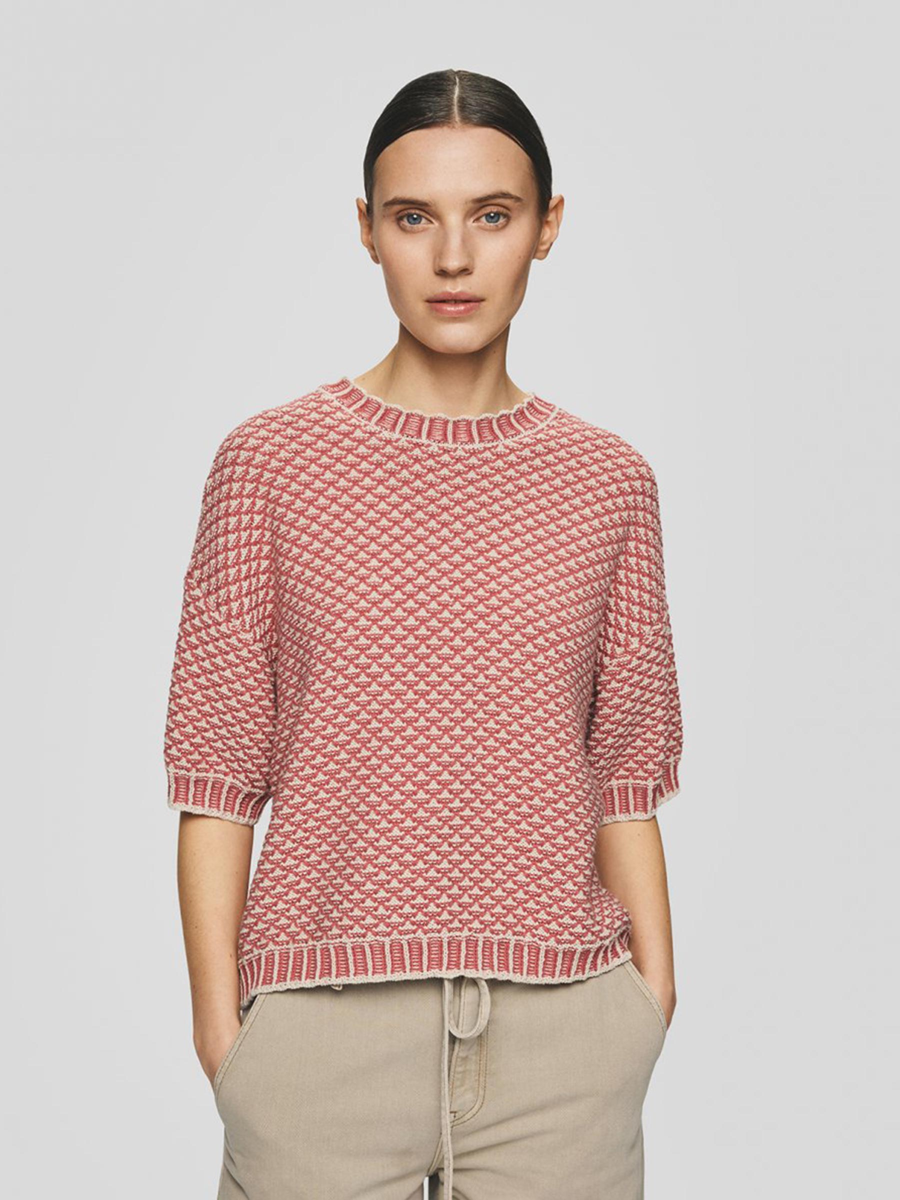 De roze gebreide pullover Catina Pilla 2/4 van MSCH Copenhagen valt direct op door het speelse grafische patroon in roze en gebroken wit. Je draagt hem en het voelt meteen goed, die relaxte pasvorm doet zijn werk zonder dat je er over na hoeft te denken.