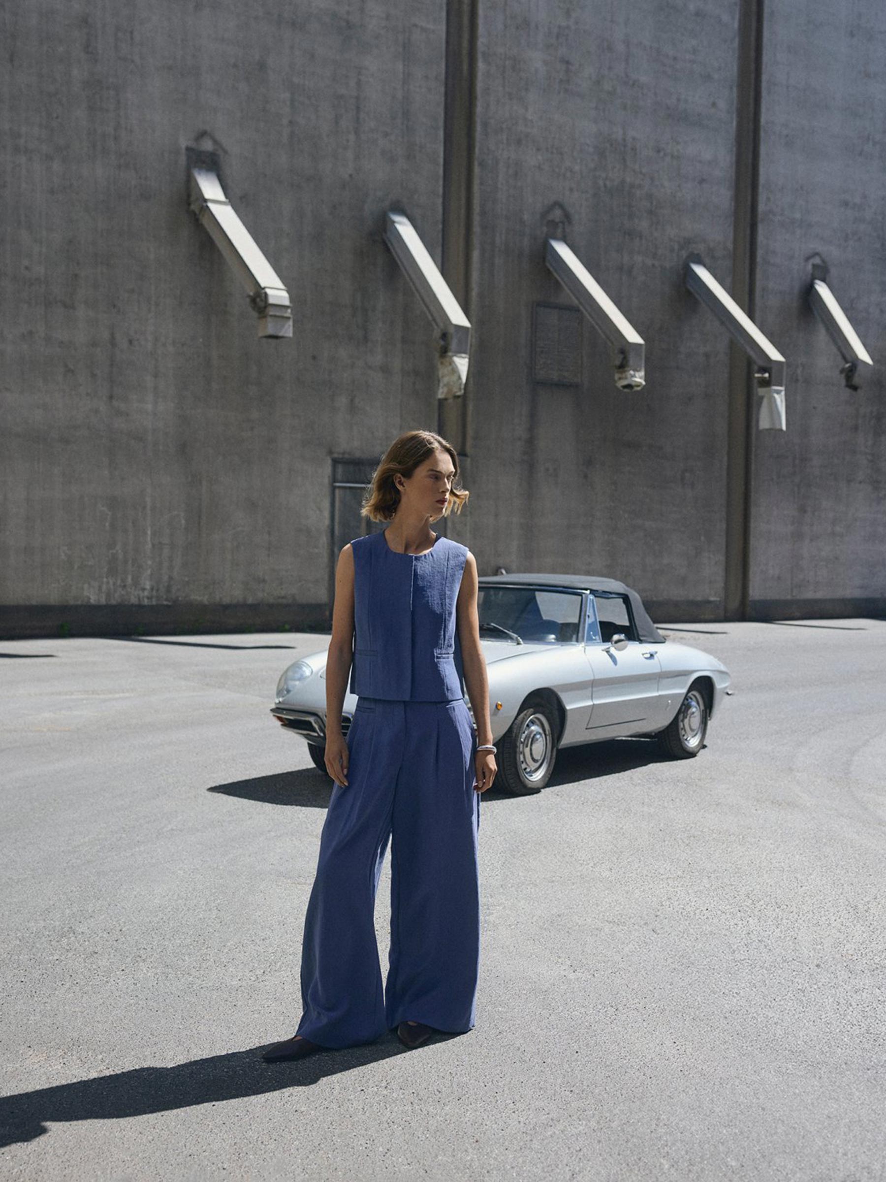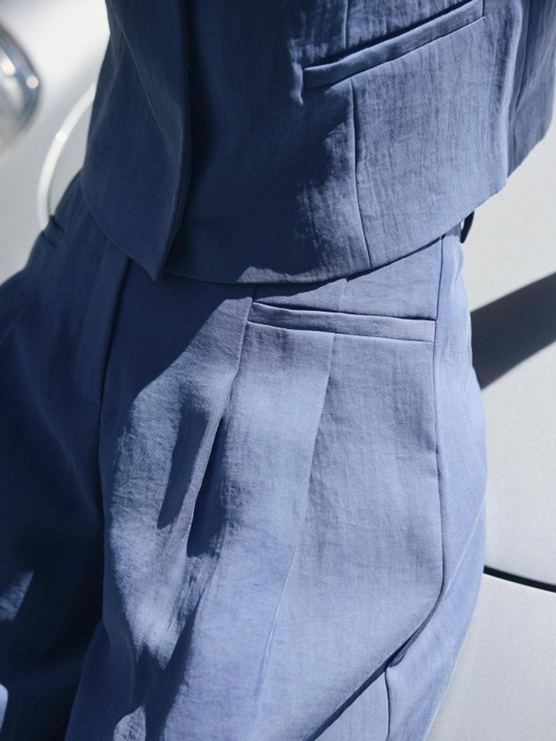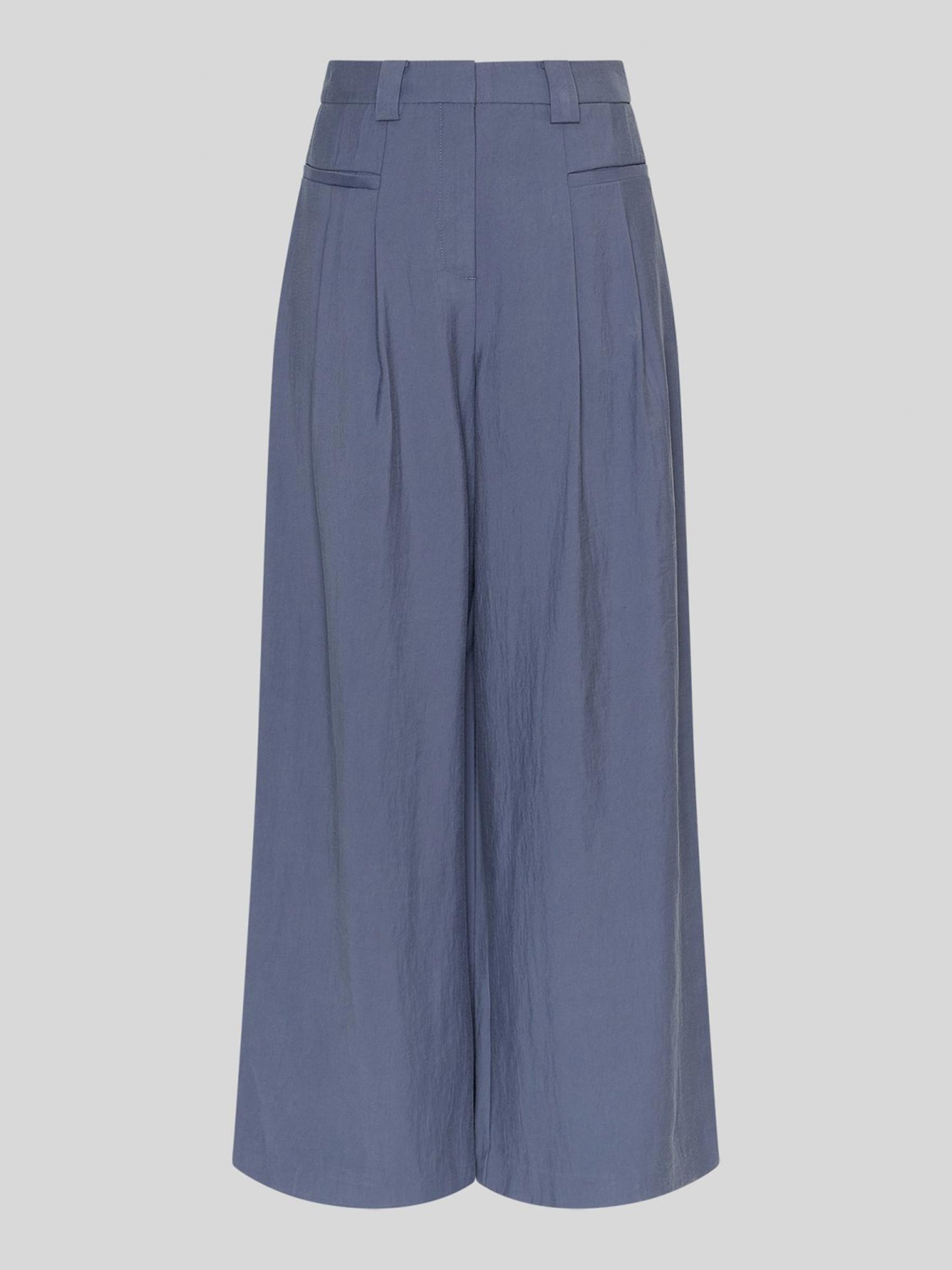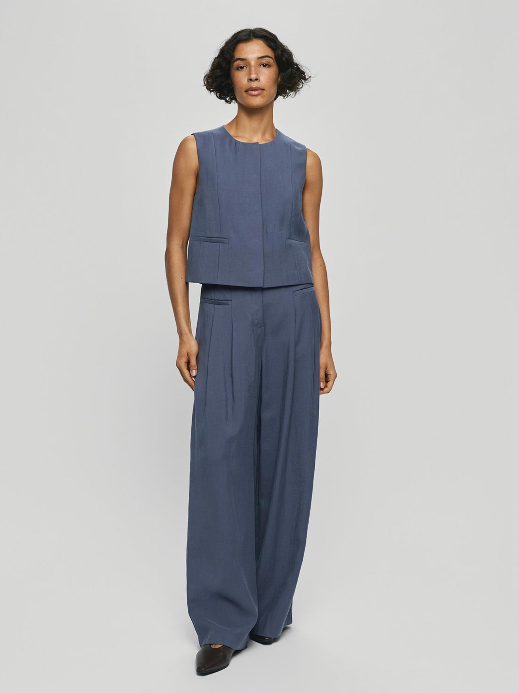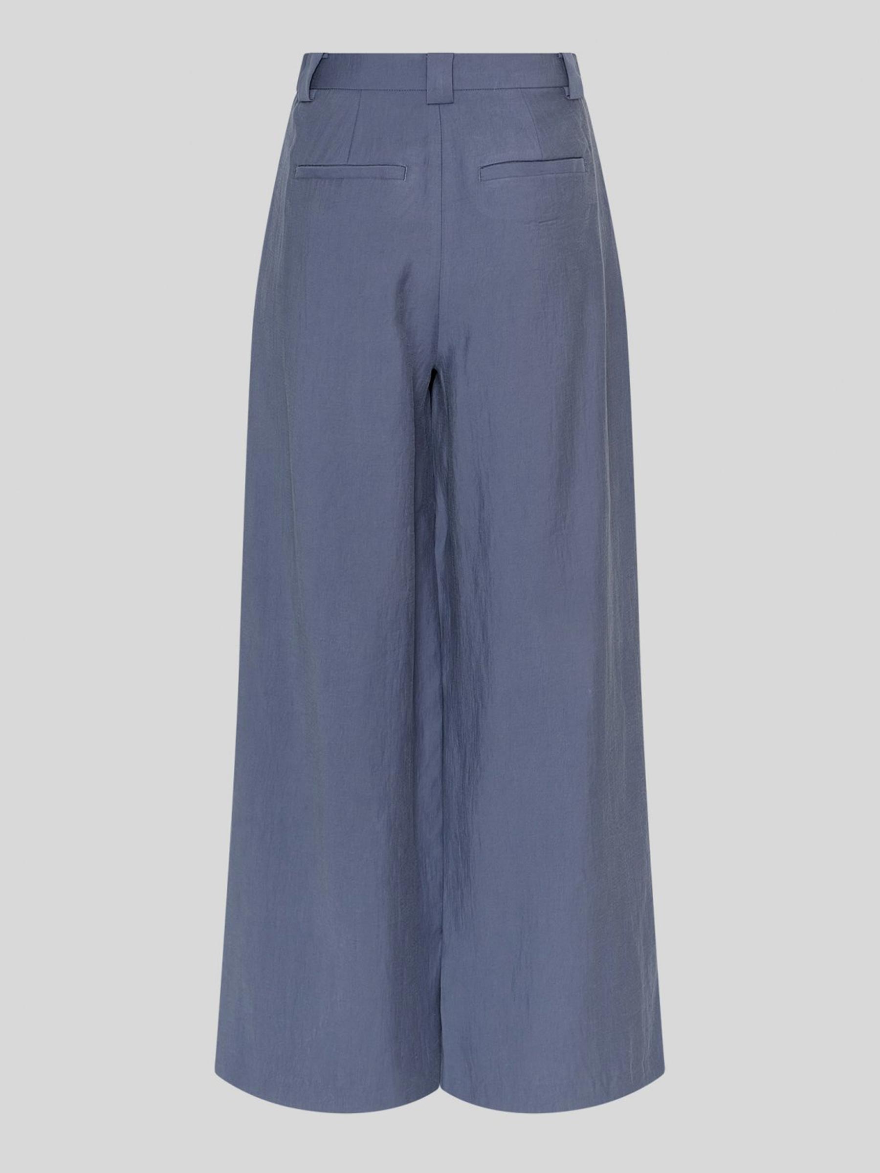 Deze blauwe broek van MSCH Copenhagen geeft je outfit meteen een elegante en relaxte uitstraling. De soepelvallende stof en wijde pijpen zorgen voor een mooi silhouet en dragen heerlijk comfortabel, of je nu voor casual gaat of een meer geklede look kiest. Perfect te combineren met het bijpassende gilet voor een complete set.