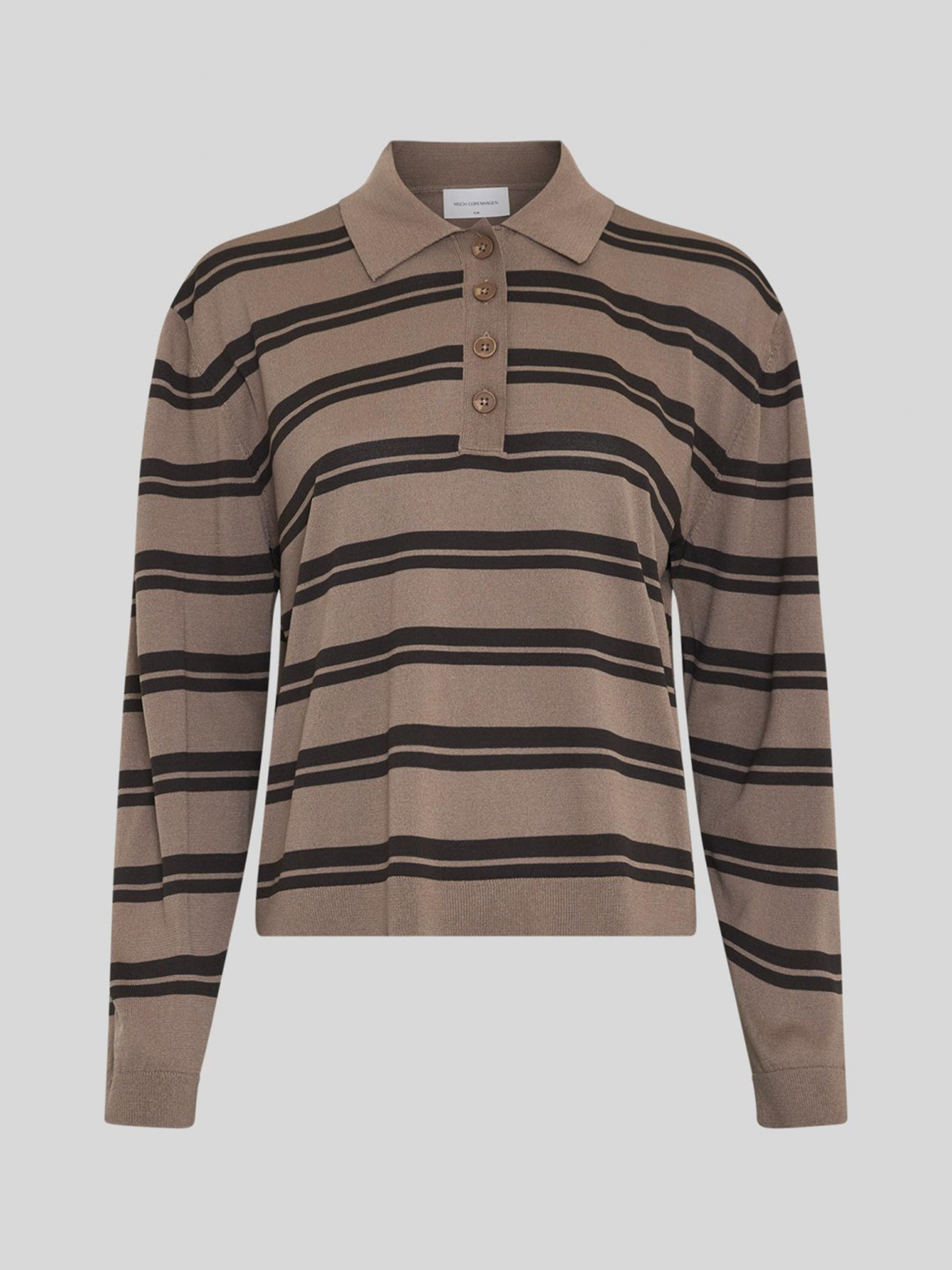 Deze gebreide polo van MSCH Copenhagen in bruin met donkerbruine strepen is precies het soort trui dat je elke week terug wil pakken. De zachte, lichtgewichte kwaliteit voelt fijn aan op de huid en de strakke ribgeribbelde afwerking geeft het geheel een nette uitstraling. Het merk kiest bewust voor LENZING™ ECOVERO™ viscose en gerecycled polyester, gecertificeerd door GRS.