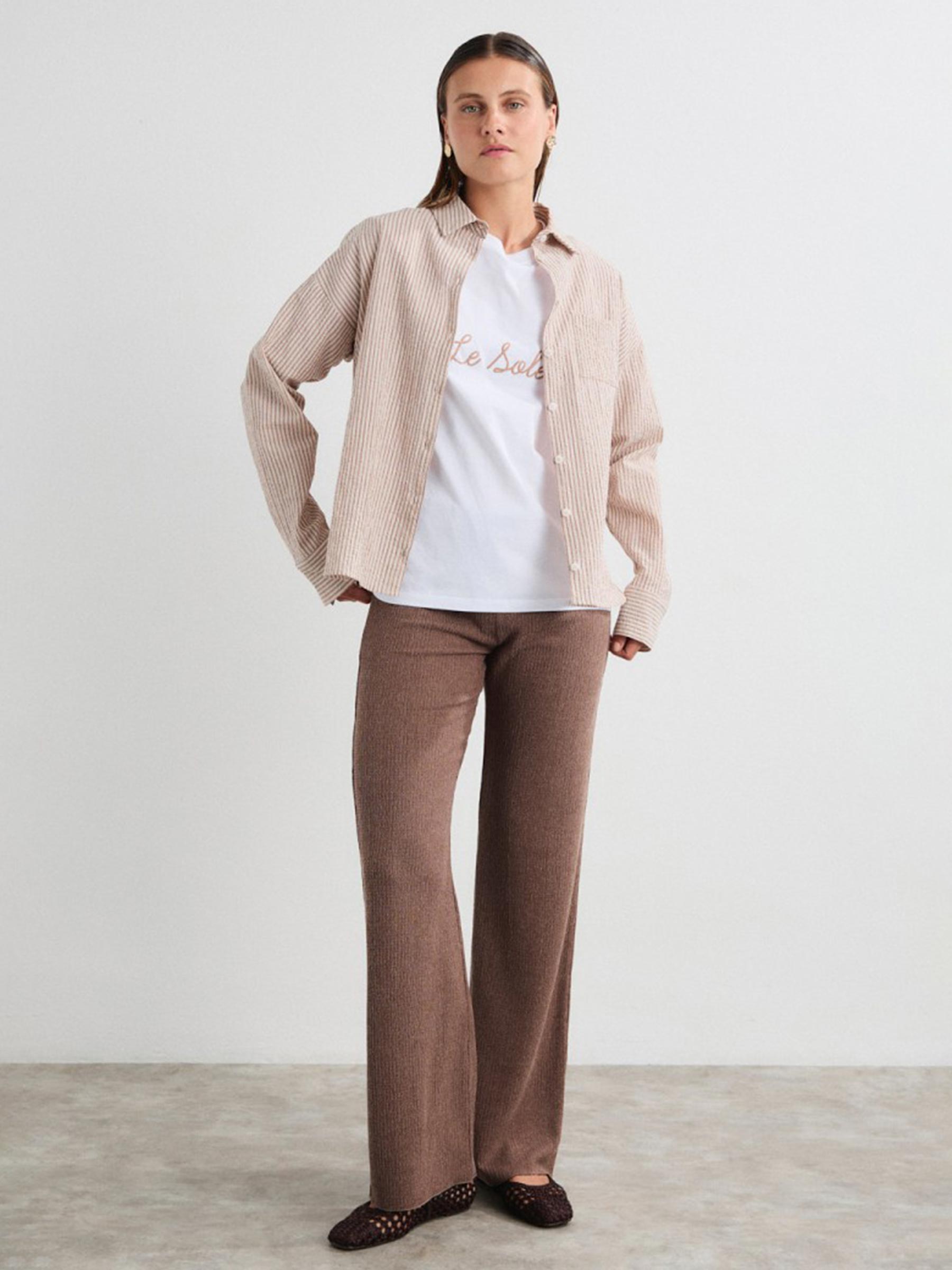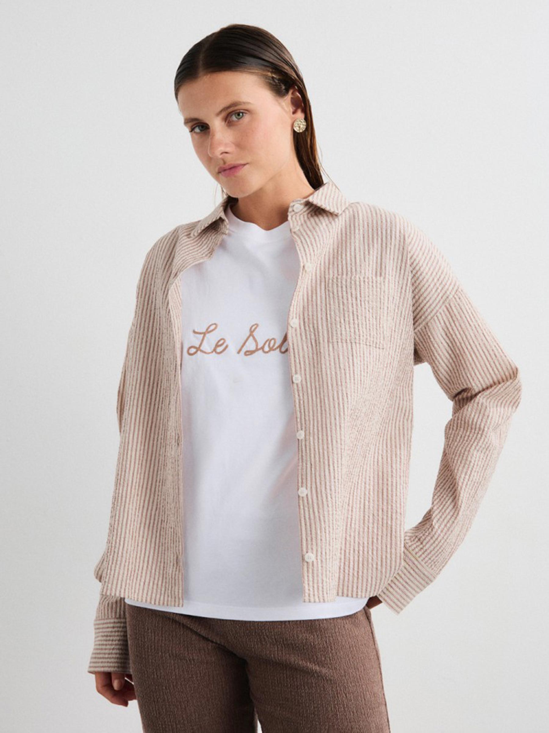 De eclipse blouse van Mus & Bombon is een oversized blouse in een zand-wit streepje met een opvallend gestructureerde stof. Hij voelt net zo relaxed aan als hij eruitziet, en is perfect om open te dragen over een basic wit t-shirt. Mus & Bombon is een Spaans duurzaam modemerk dat alles lokaal produceert in Spanje en Portugal.
