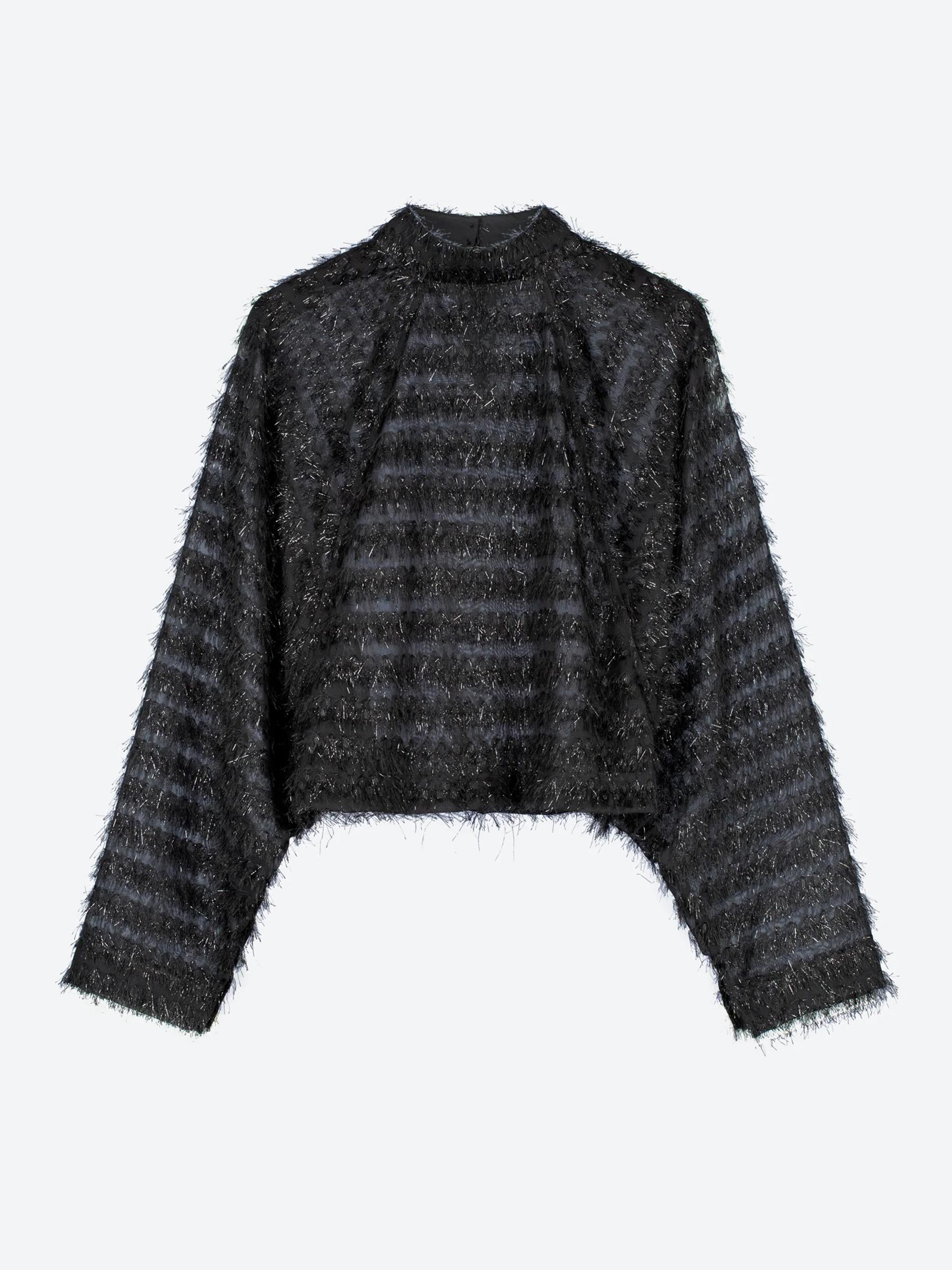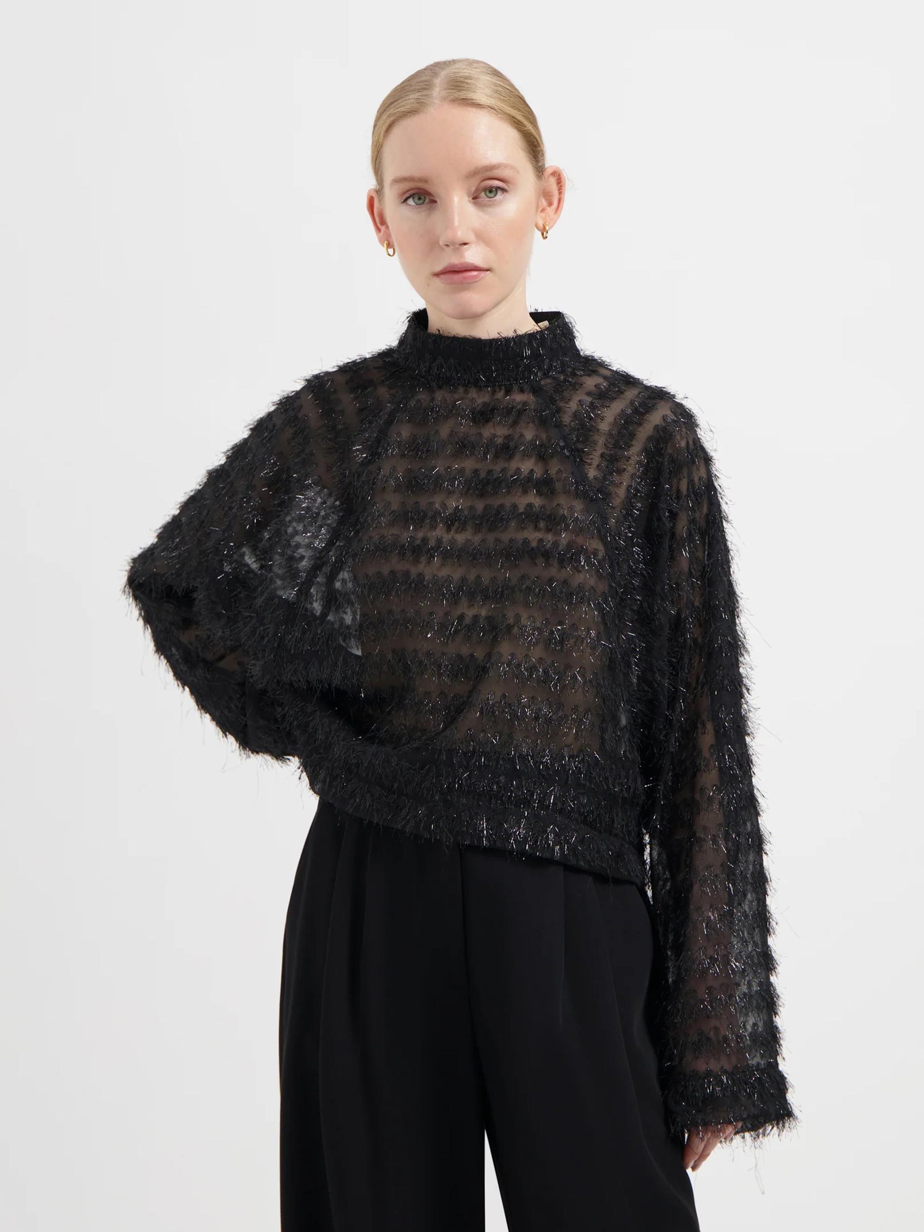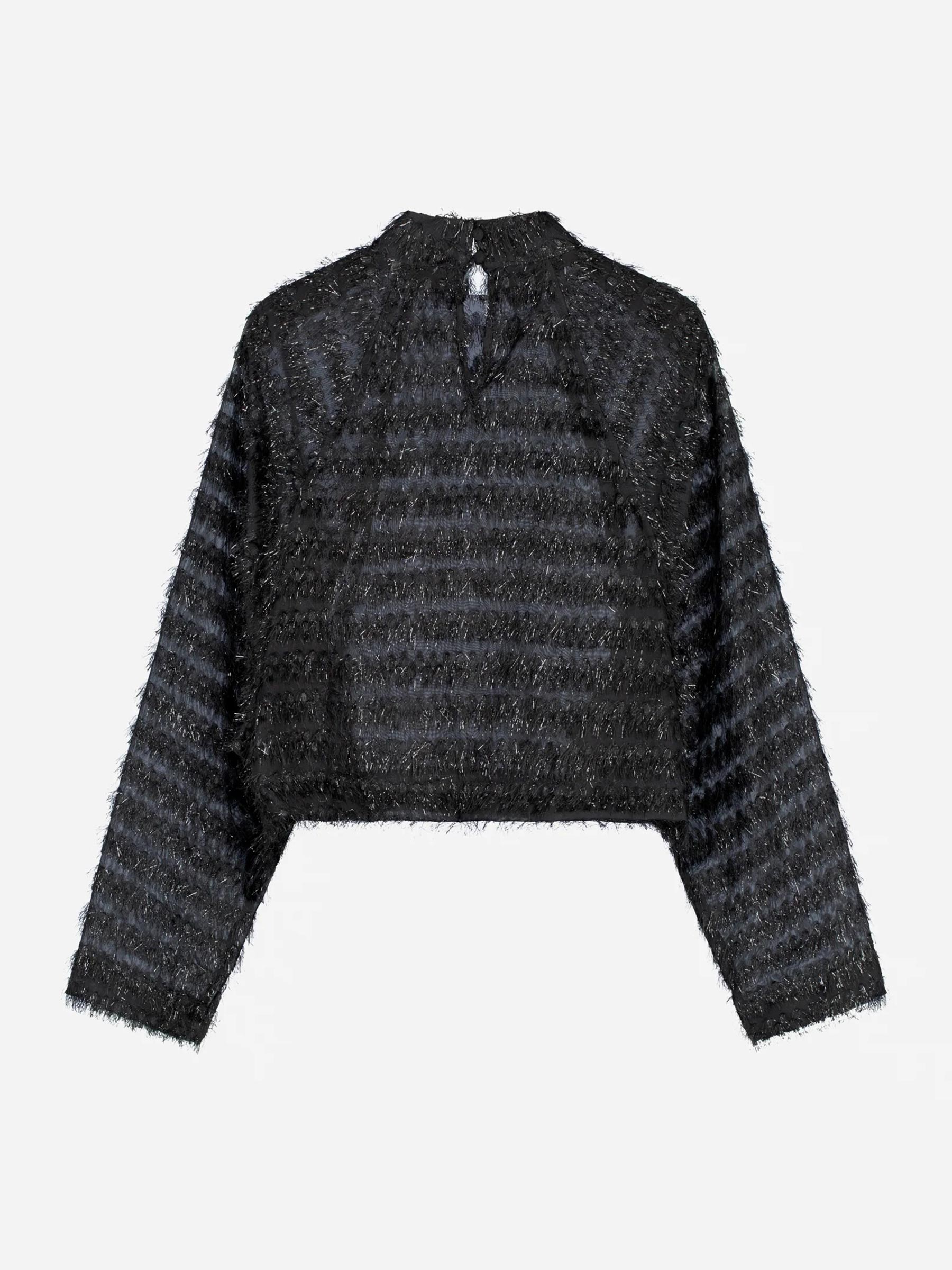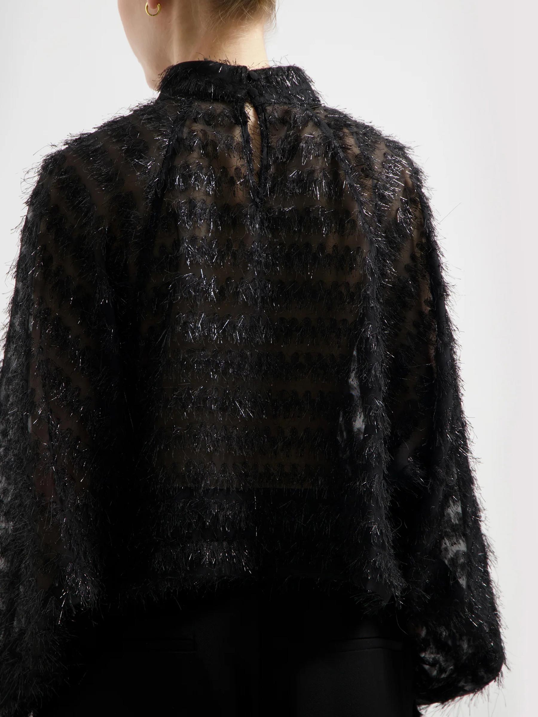 Deze zwarte top van Nous Sommes Labels is een echte eyecatcher. De semi-transparante stof met glanzende details geeft de top dat chique gevoel! Draag met een mooie bralette of top eronder voor een feestelijke look.