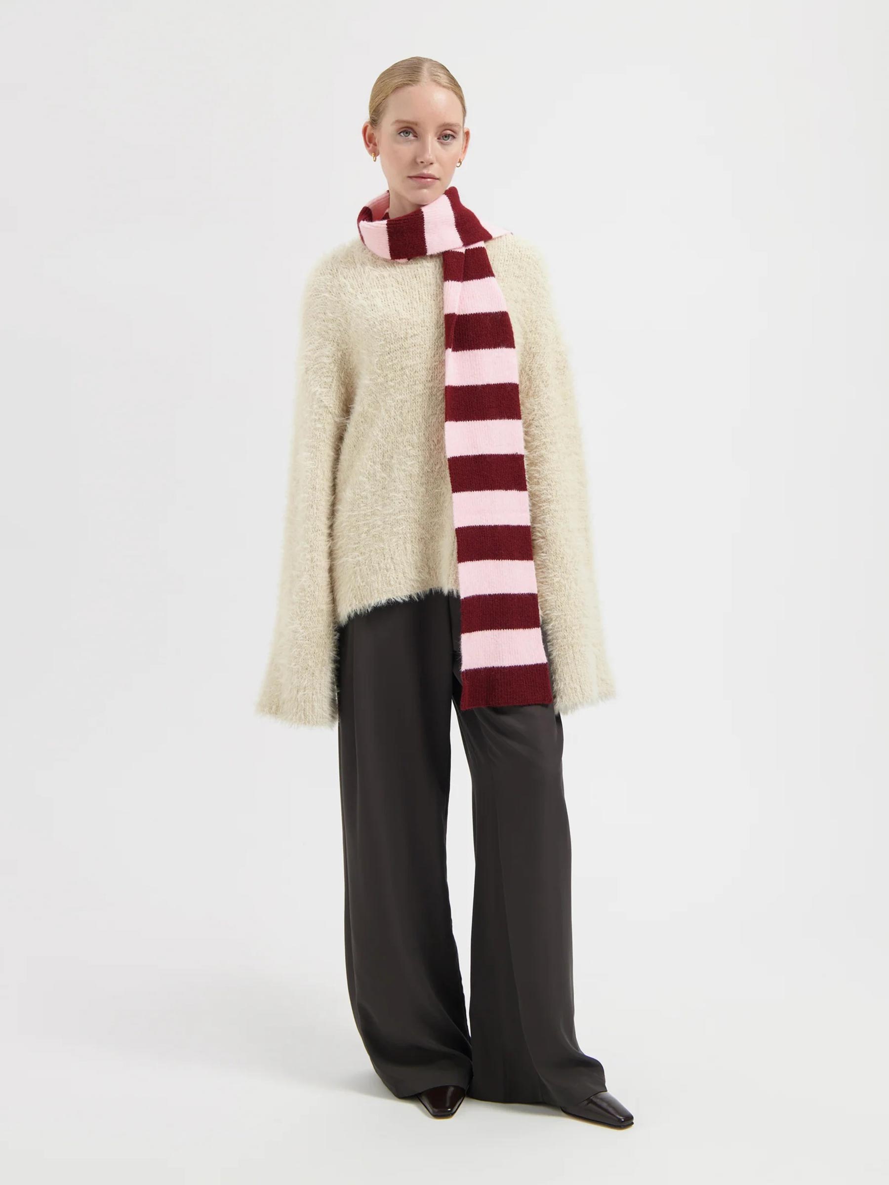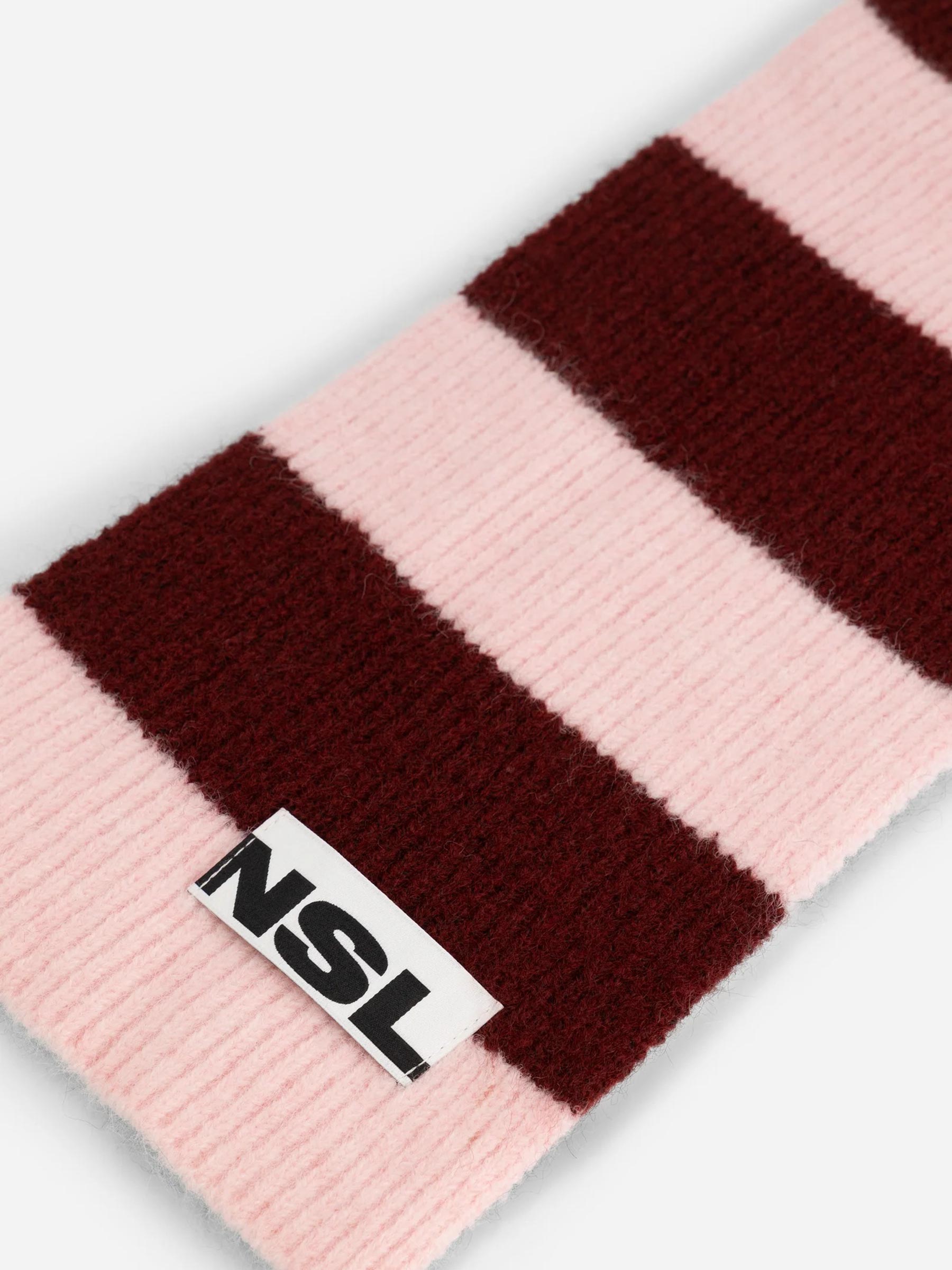 Deze roze-bordeaux sjaal van Nous Sommes Labels brengt kleur in elke winterdag. De brede strepen geven een frisse, moderne look en de zachte wolblend houdt je heerlijk warm. Combineer met een neutrale jas of knit om je outfit compleet te maken.