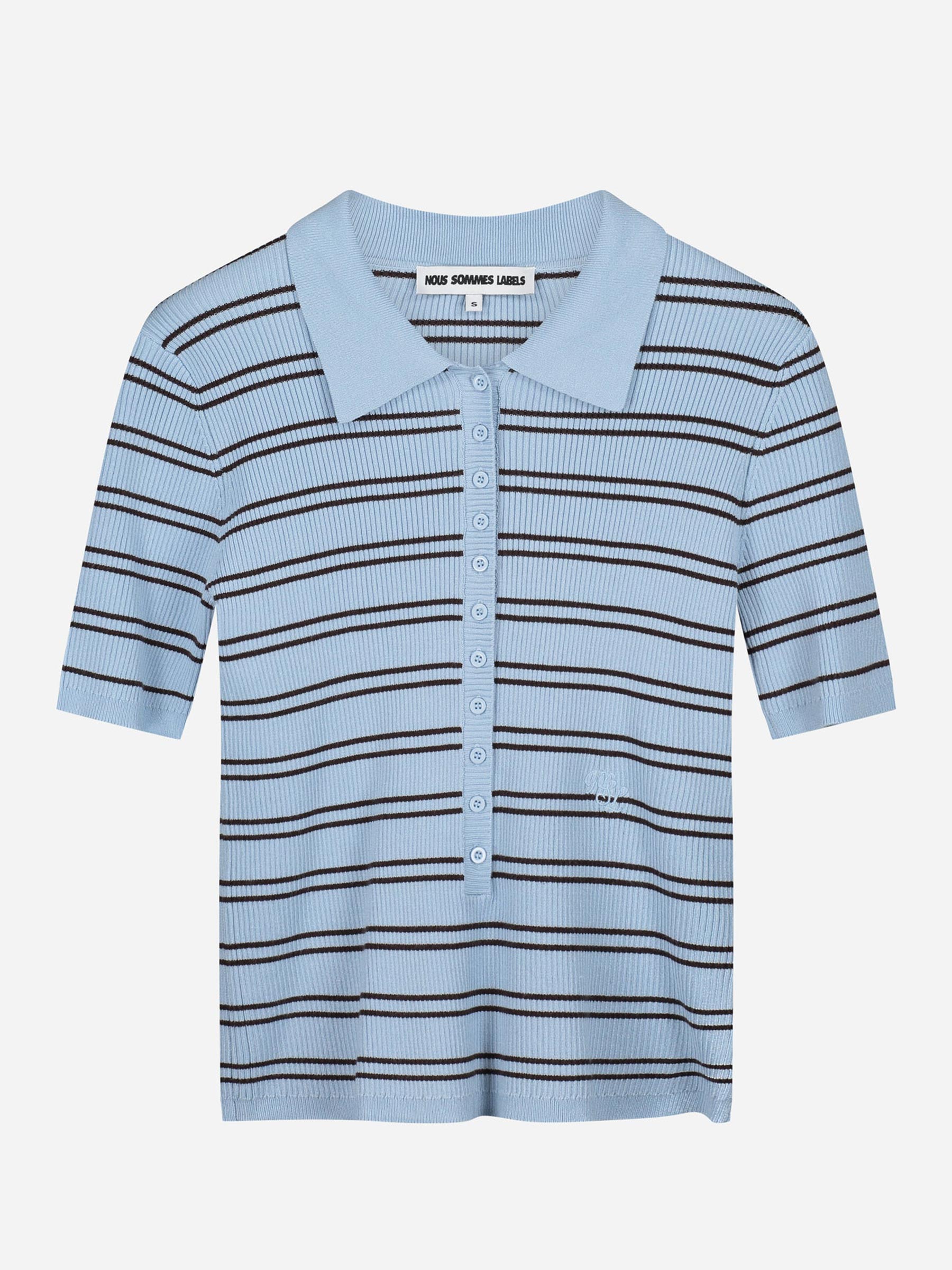 Deze lichtblauwe Liz SS polo knit van Nous Sommes Labels valt op door de mooie kleuren, ribgebreid materiaal en de rij knoopjes over de volle lengte. De aansluitende pasvorm zit als gegoten zonder te strak te voelen. Een vrouwelijke top die zowel casual als chique te dragen is.