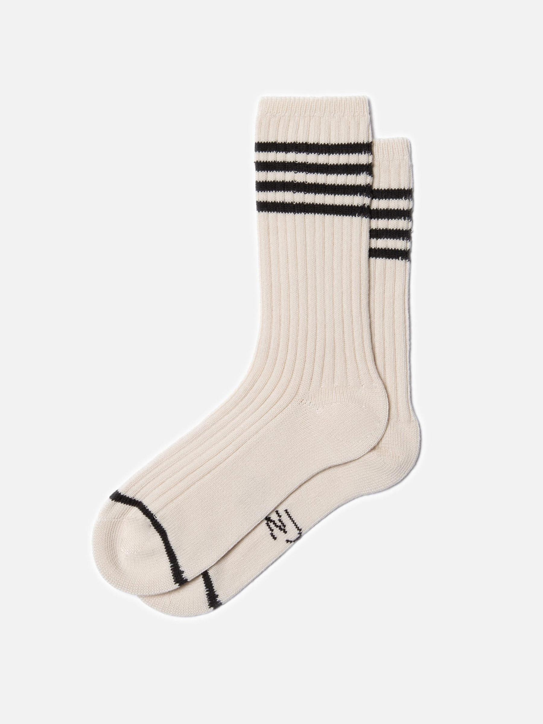 Dit offwhite sokkenpaar van Nudie Jeans is gemaakt van biologisch katoen en voelt heerlijk zacht aan. De ribstructuur en subtiele zwarte strepen geven ze een sportieve look, terwijl het logo op de zool voor een herkenbare Nudie touch zorgt. Gemaakt in Portugal van een midweight knit die lekker stevig aanvoelt.