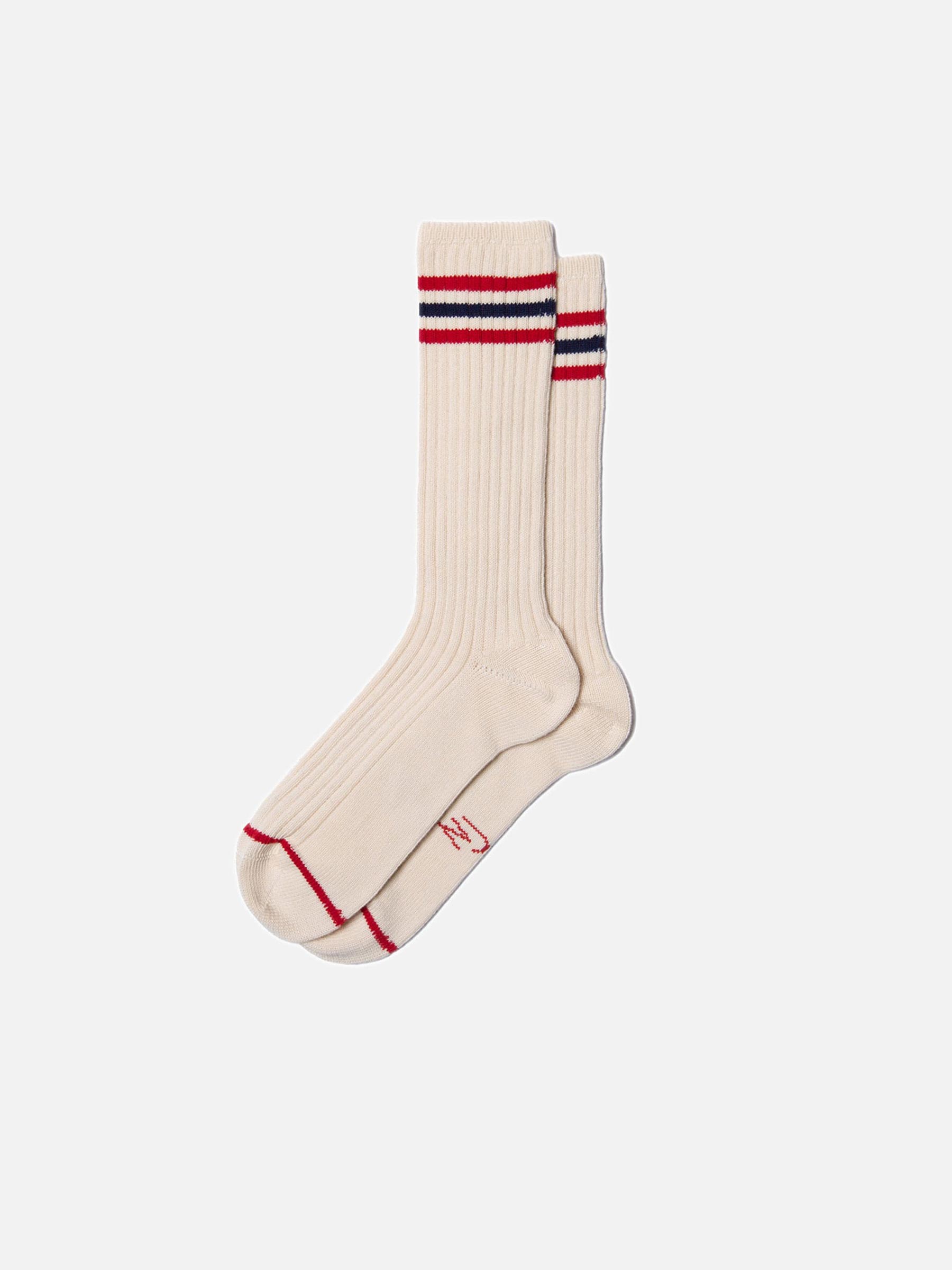 Deze beige sokken van Nudie Jeans geven je outfit een retro vibe. Het ribgebreide design met rode en blauwe strepen maakt ze speels en sportief, ideaal in sneakers of juist zichtbaar boven je favoriete boots. Comfortabel en duurzaam, precies zoals je van Nudie gewend bent.