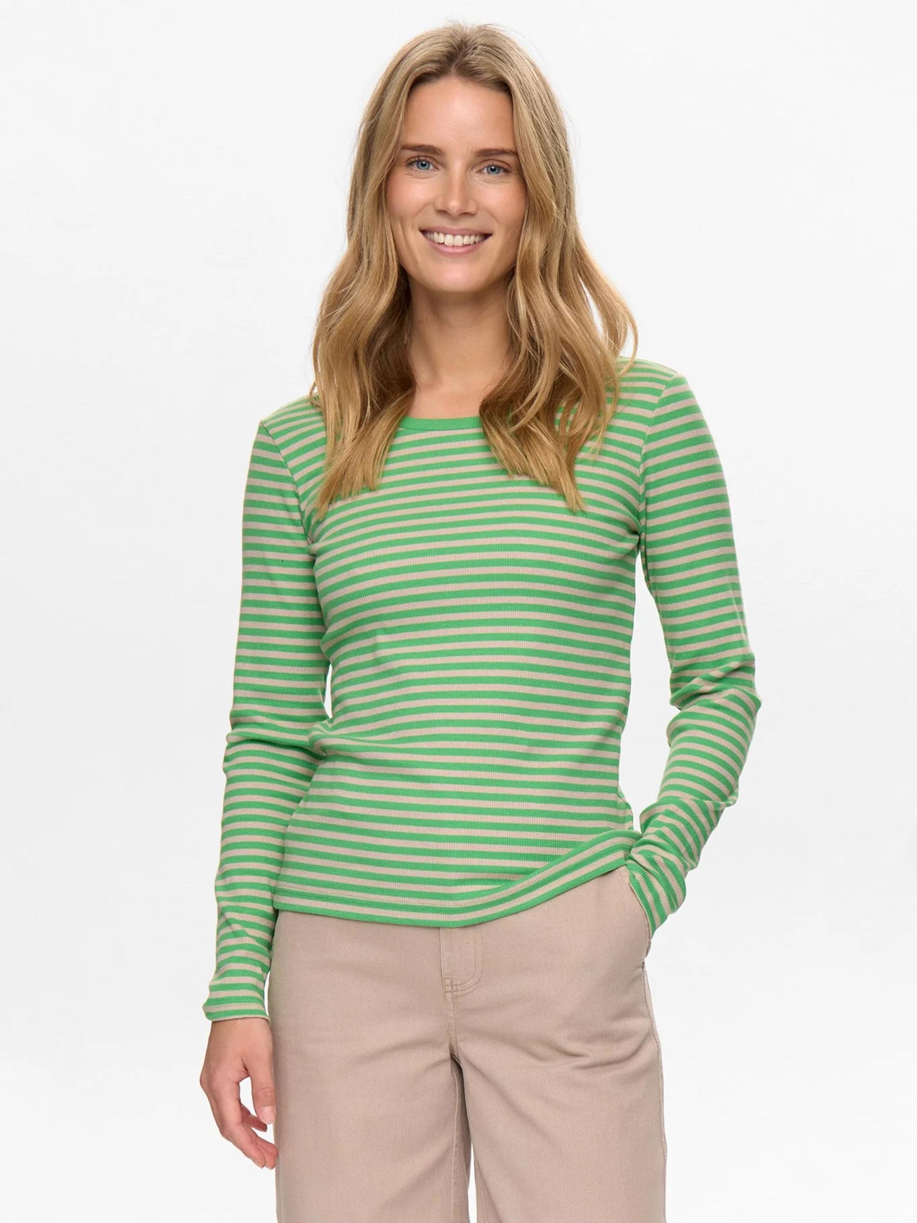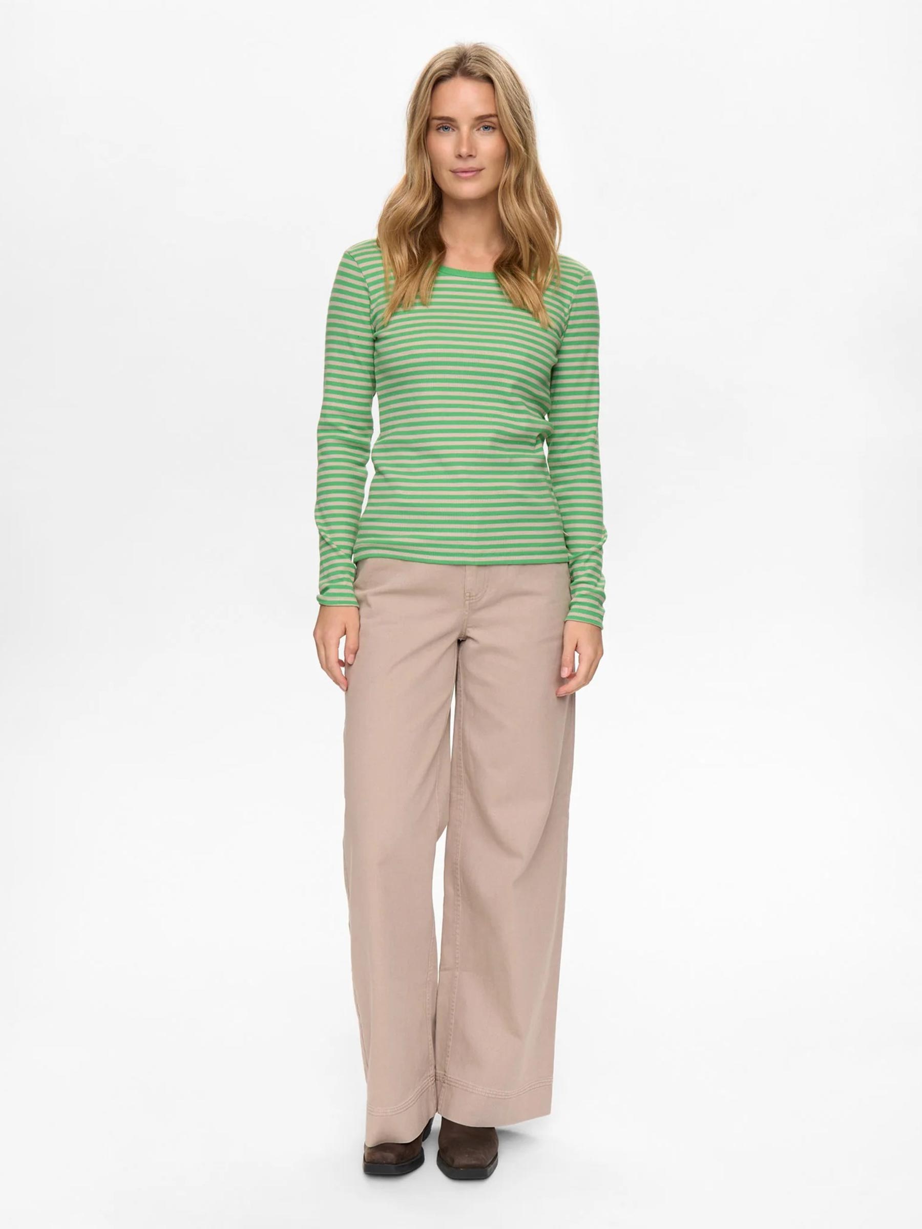 Deze groene gestreepte longsleeve van Nümph is zo eentje die je er steeds weer bij pakt. De frisse strepen geven direct kleur aan je look en de fijne stretch zorgt dat het lekker zit, de hele dag door. Mooi op een lichte broek of juist onder een blazer voor een casual laagje.