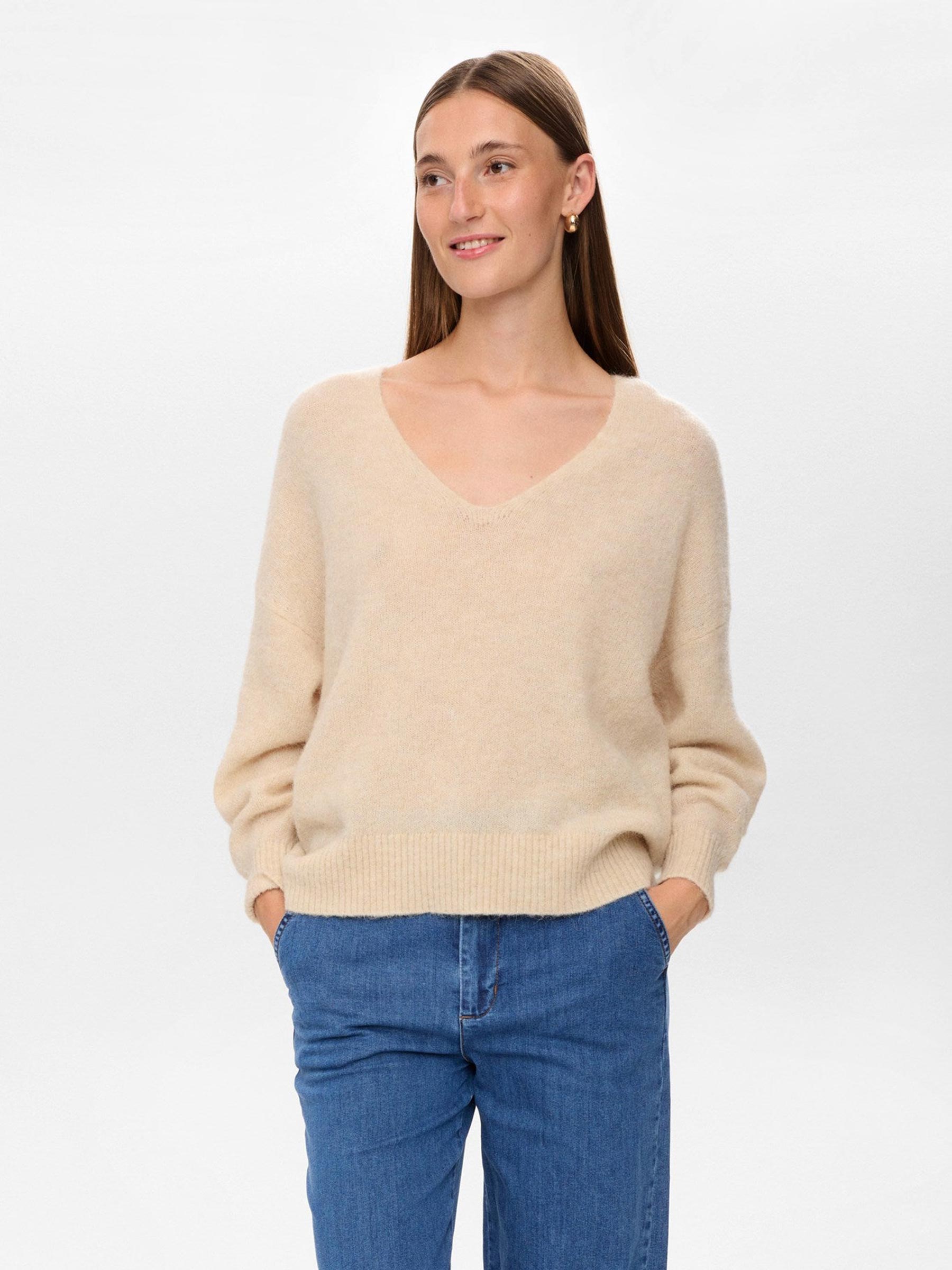 Deze lichtbeige trui van Nümph is heerlijk zacht en geeft elke outfit een warme uitstraling. De diepe V-hals maakt hem vrouwelijk en luchtig, terwijl de relaxed fit hem super comfortabel maakt. Mooi met jeans of over een blouse voor een gelaagde look.