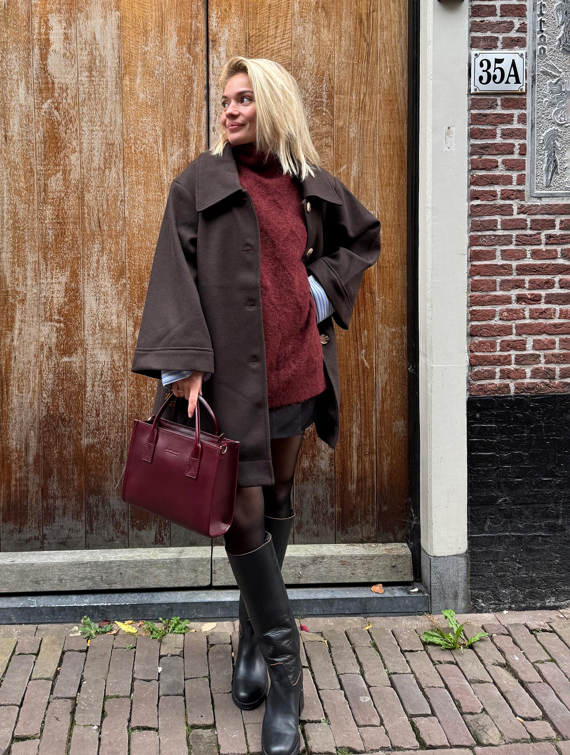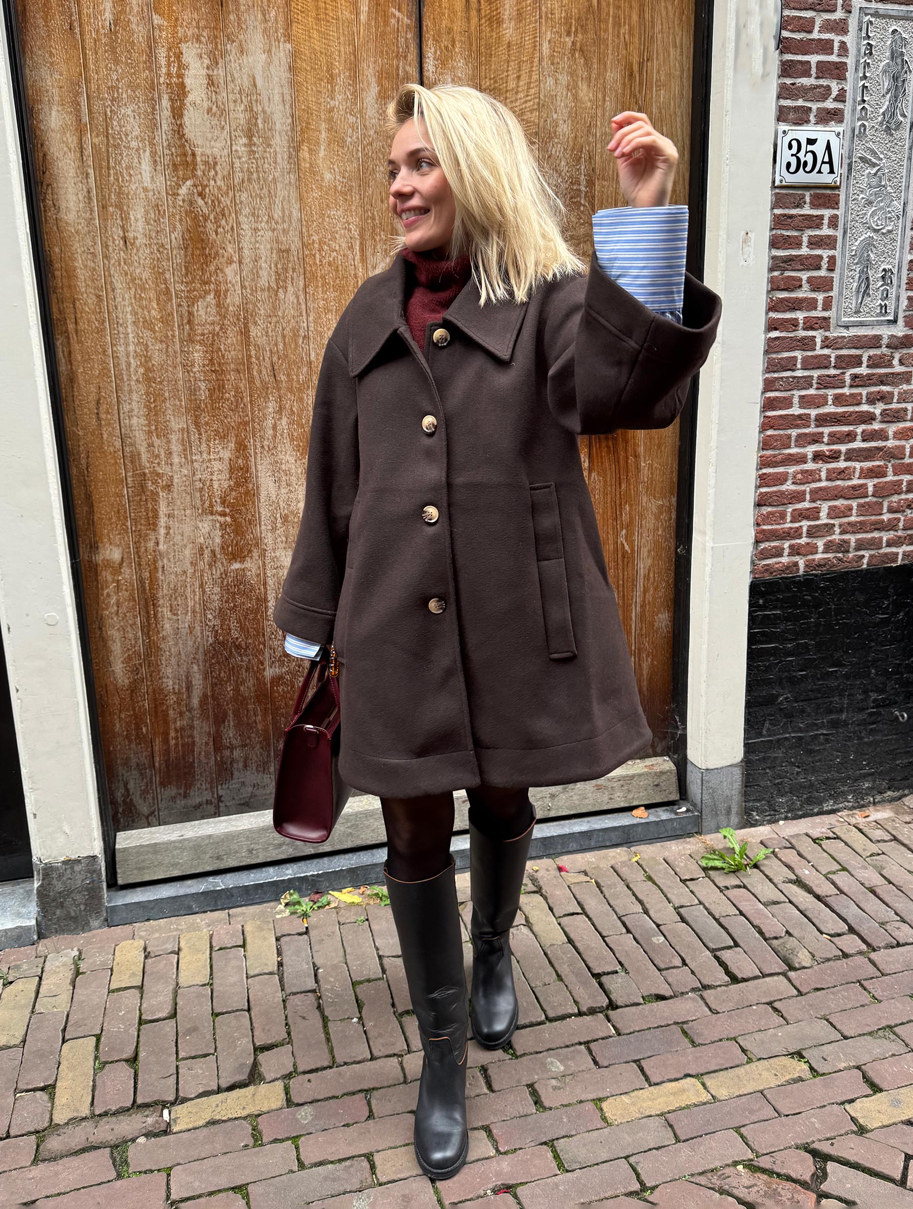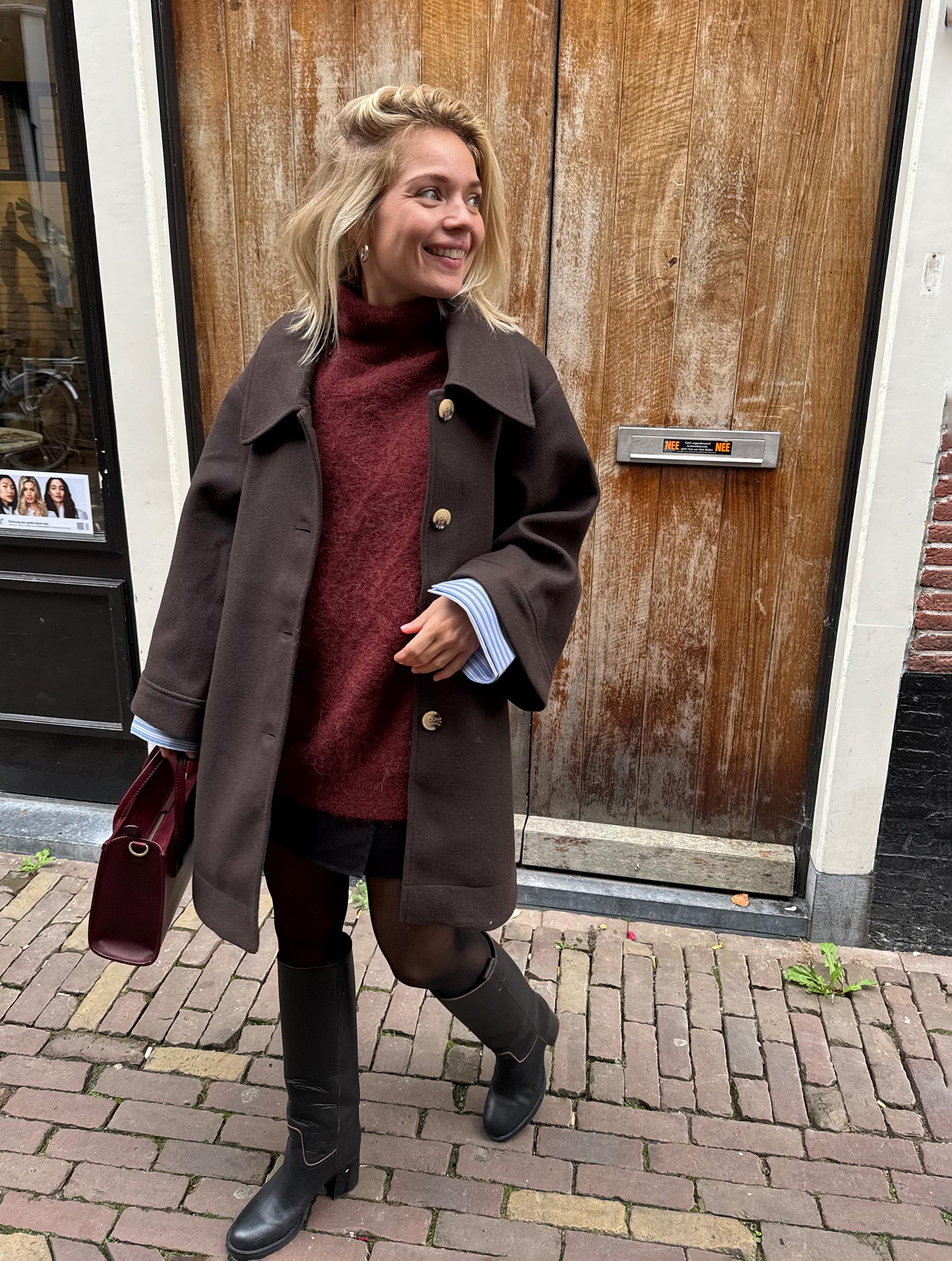 Dit donkerbruine jack van Nümph is zo’n item waar je élke dag blij van wordt. De relaxte fit en grote kraag geven een moderne look en de gouden knopen zorgen voor een chique detail. Combineer casual met jeans of draag hem over een jurk voor een stijlvolle laag.