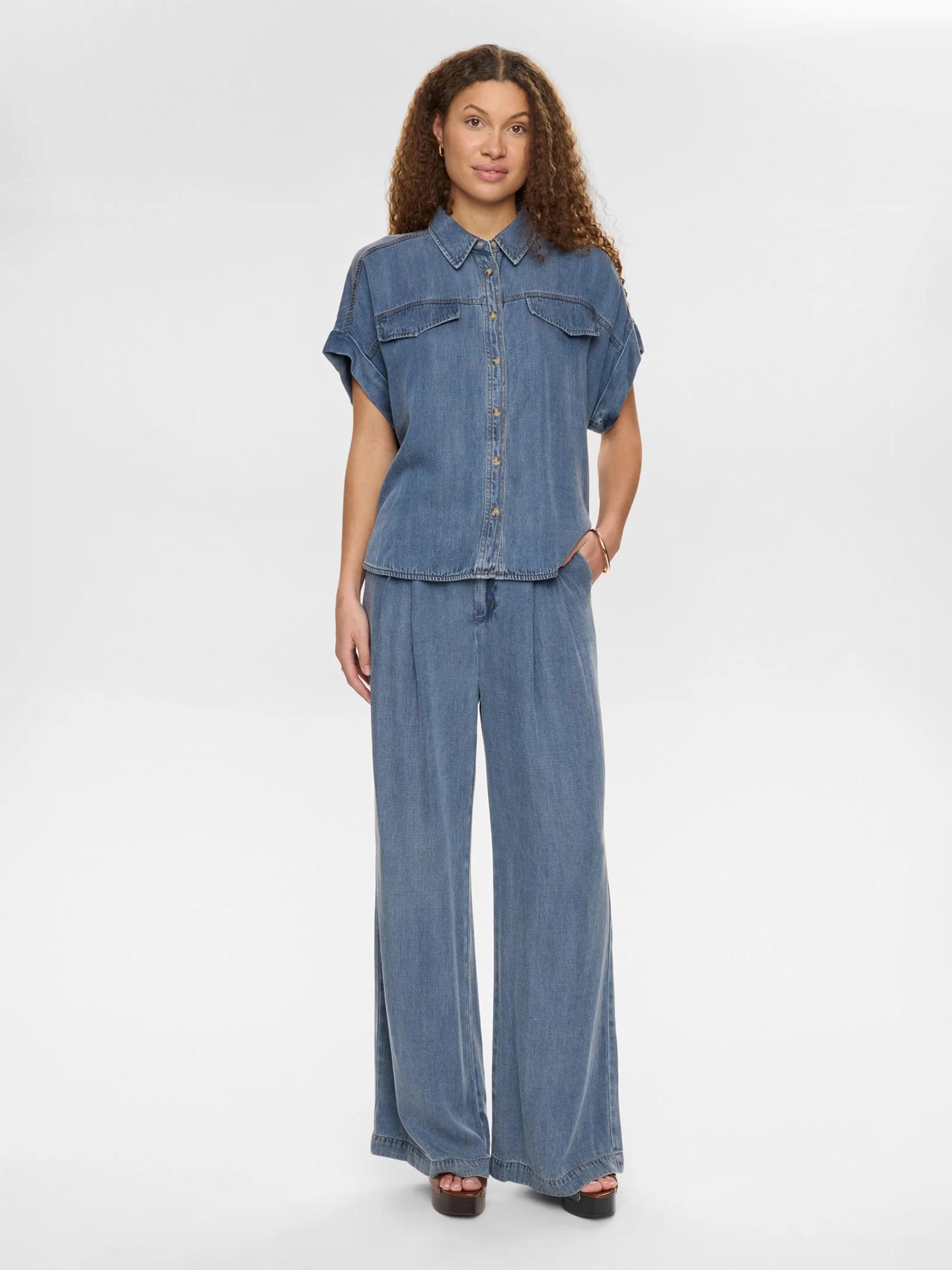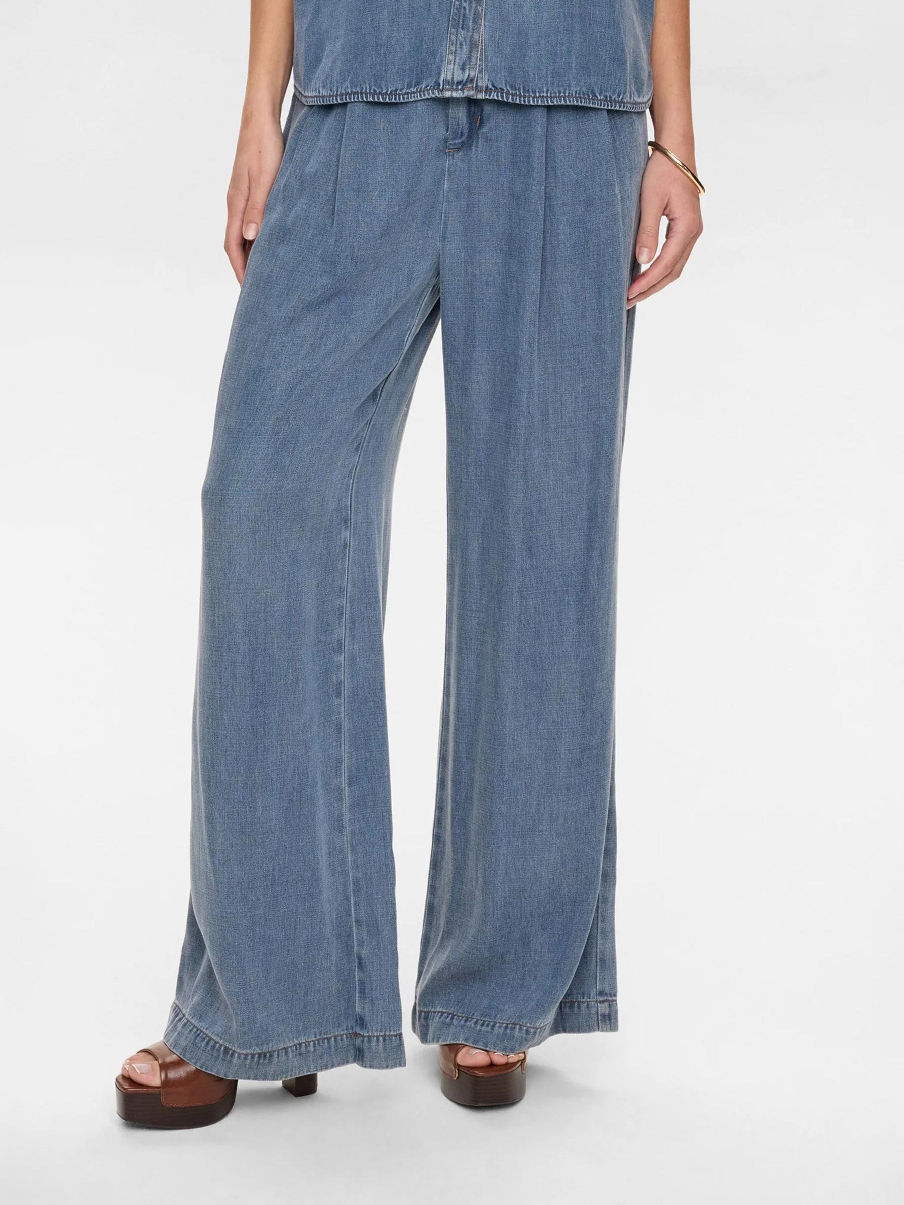 Maak een statement door de broek te dragen met een denim top voor een complete set, of combineer hem met een strakke body om de wijde pijpen extra te accentueren.