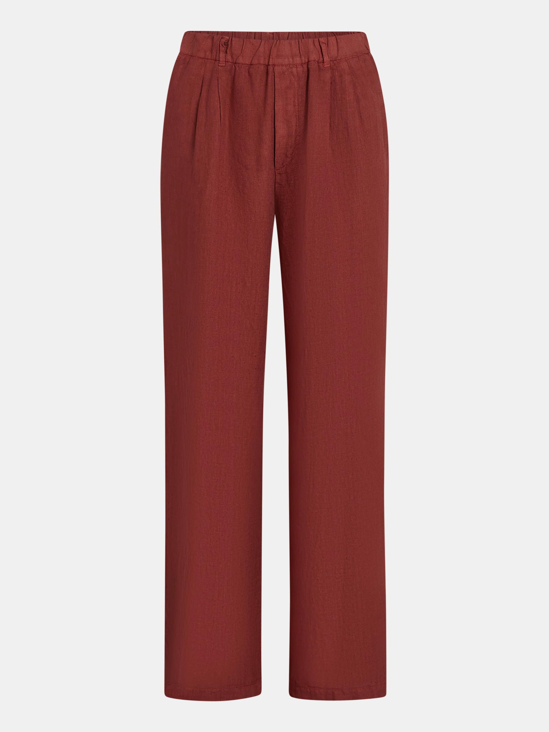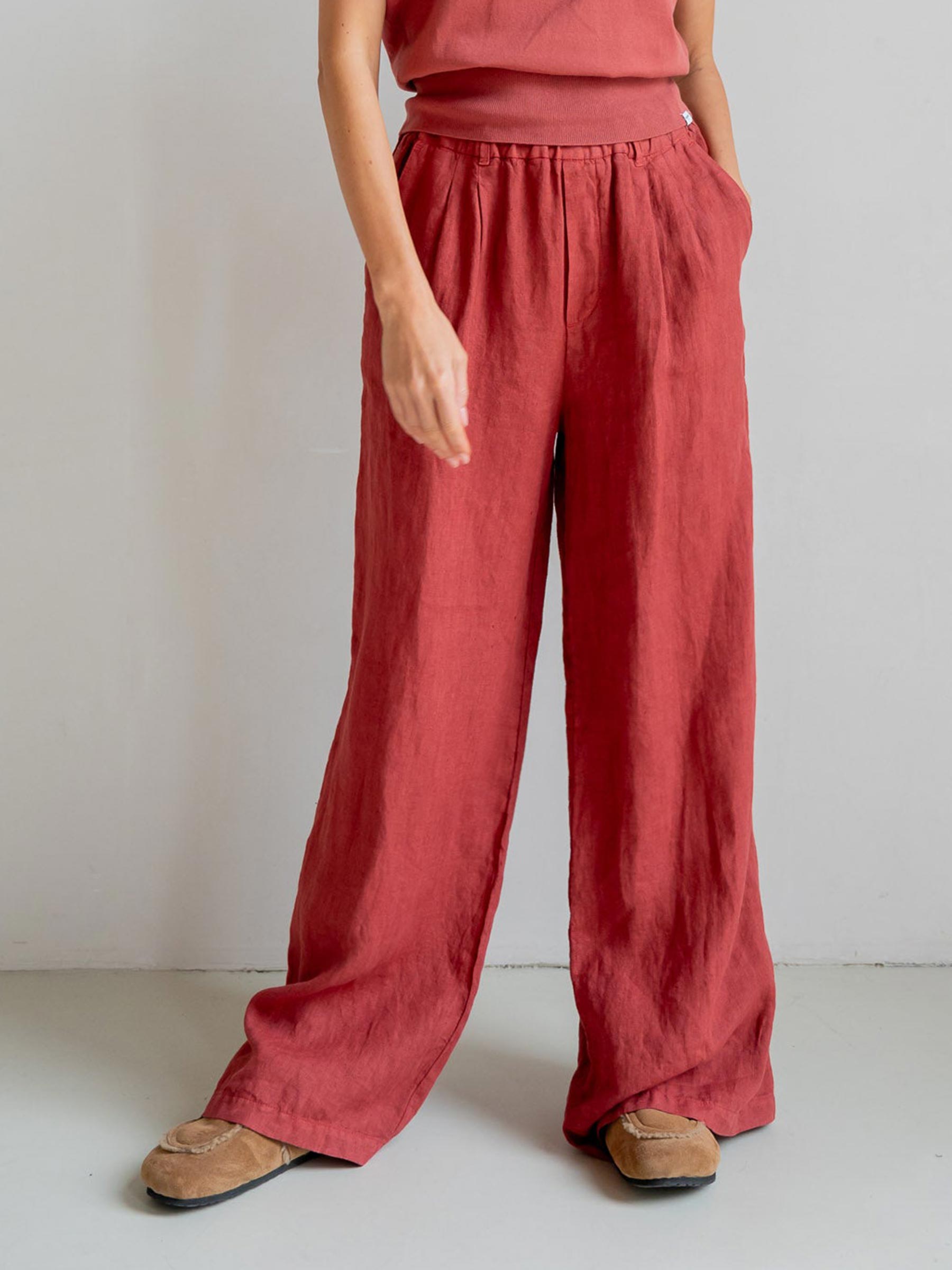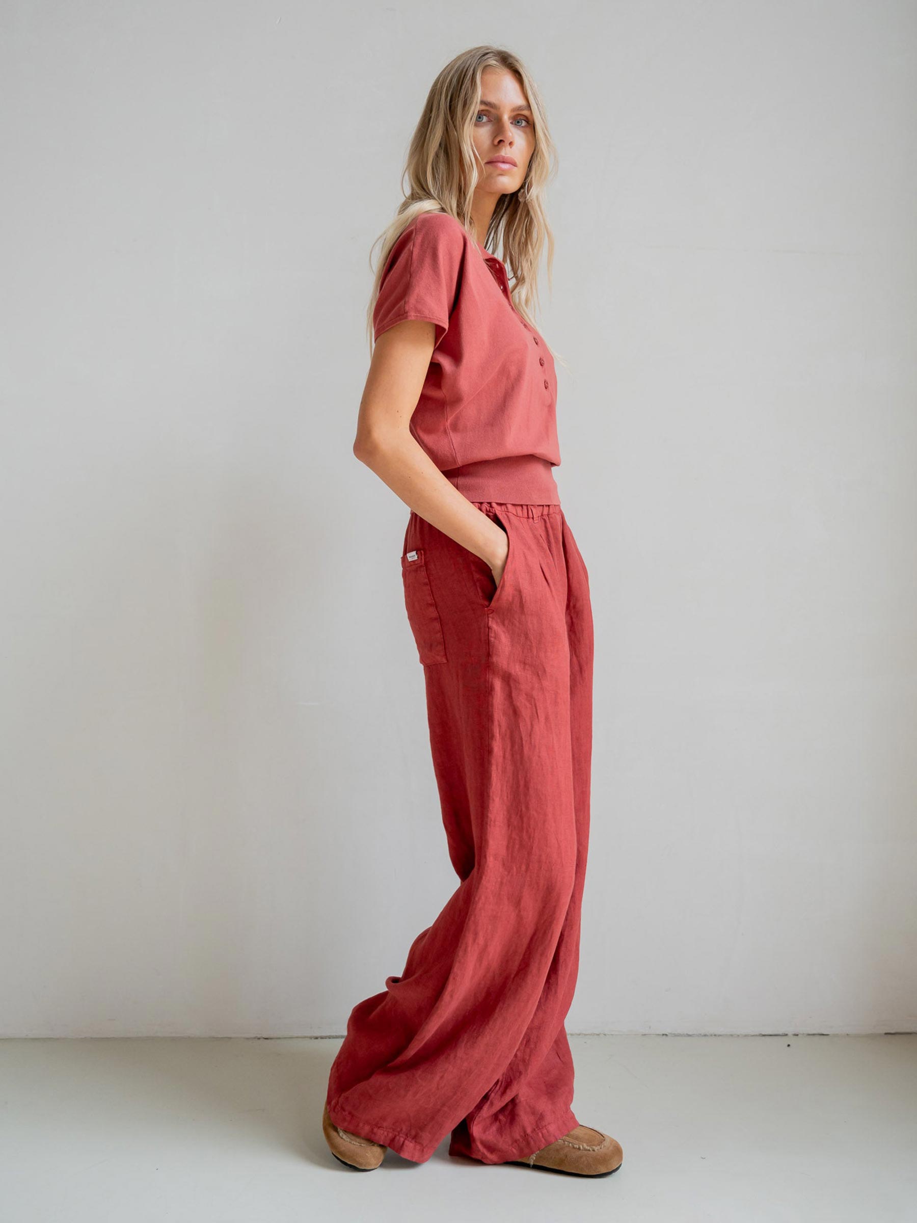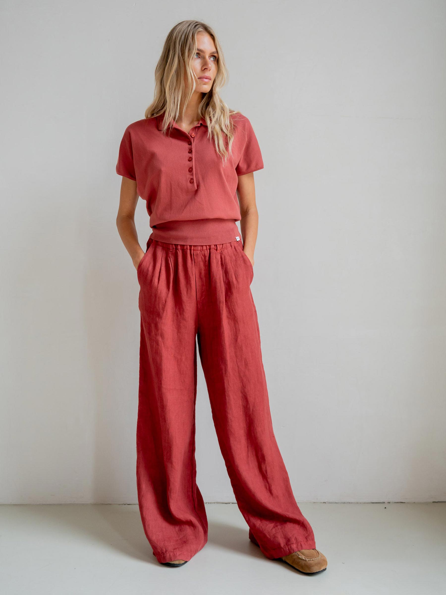 Draag deze broek met de bijpassende rode top voor een krachtig statement in één kleur. Voor een meer ingetogen look combineer je hem met een lichte linnen blouse en suède instappers.