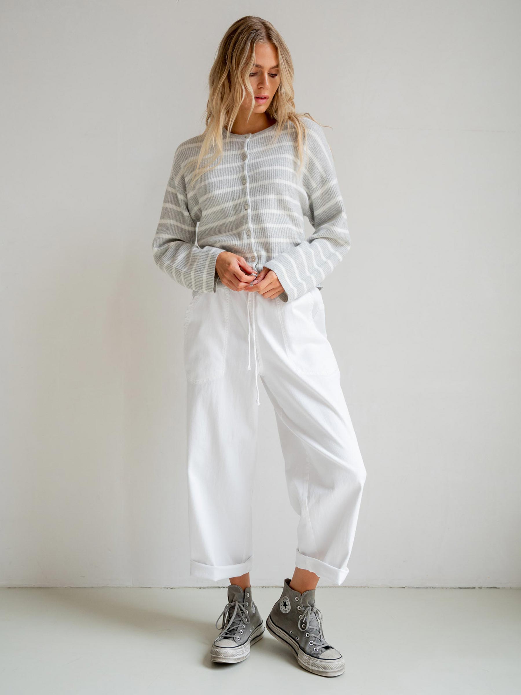 Combineer deze broek met een gestreepte cardigan en grijze hoge sneakers voor een sportieve outfit. Rol de broekspijpen een slagje op voor een extra nonchalant effect tijdens een wandeling door de stad.