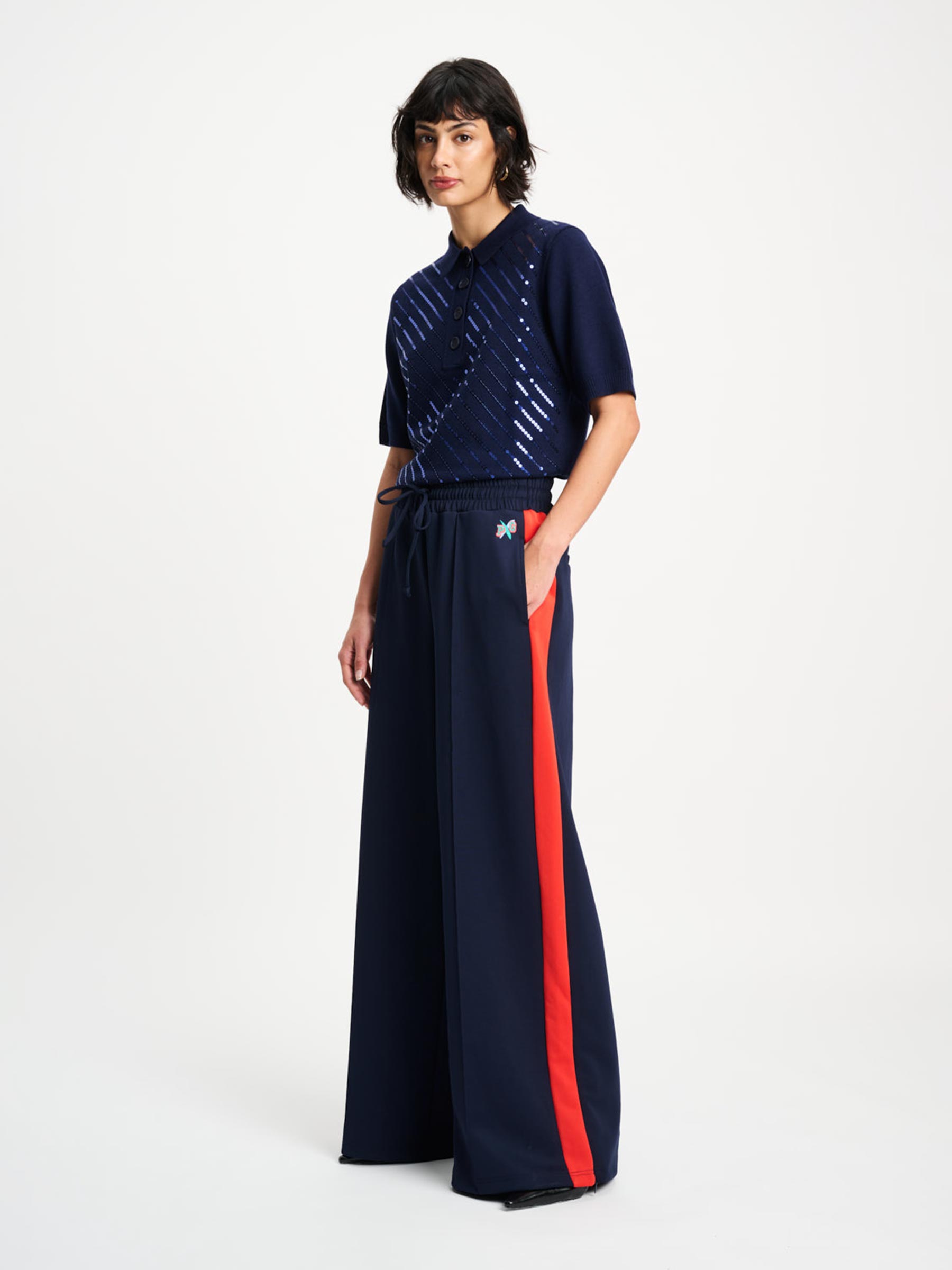 Deze donkerblauwe top van POM Amsterdam x Gwen van Poorten combineert een sportieve polo look met een feestelijke touch dankzij de pailletten op de voorkant. De zachte viscosemix draagt comfortabel en maakt dit item perfect voor zowel casual als geklede momenten. Leuk op een jeans of chic in combinatie met een pantalon.