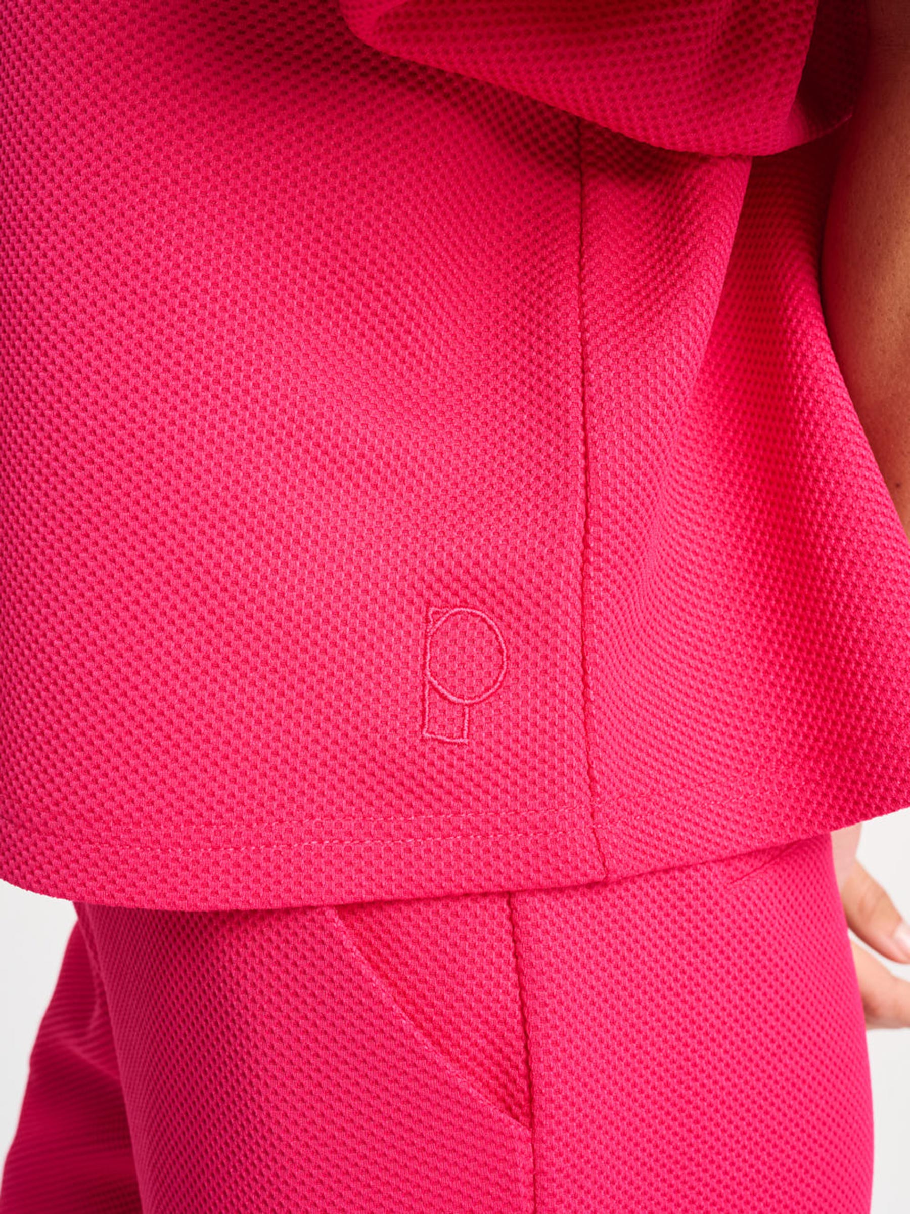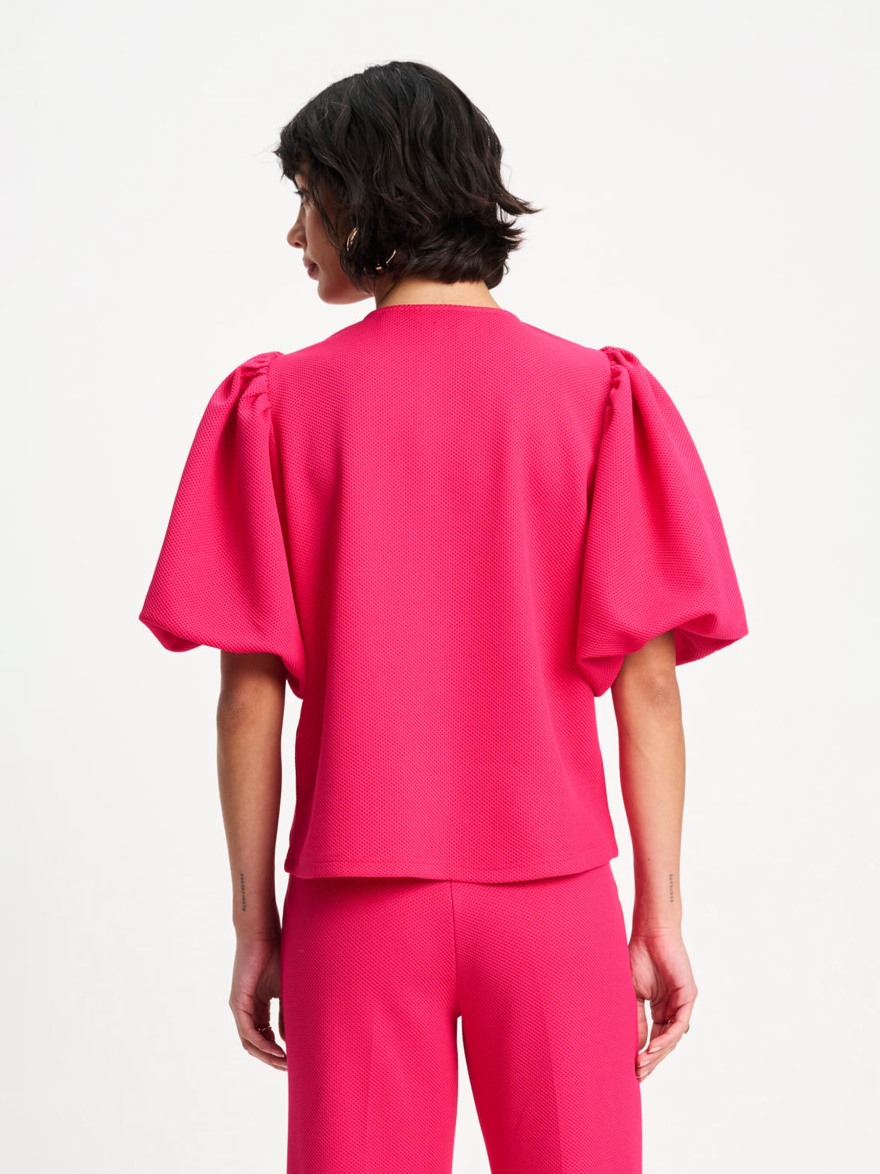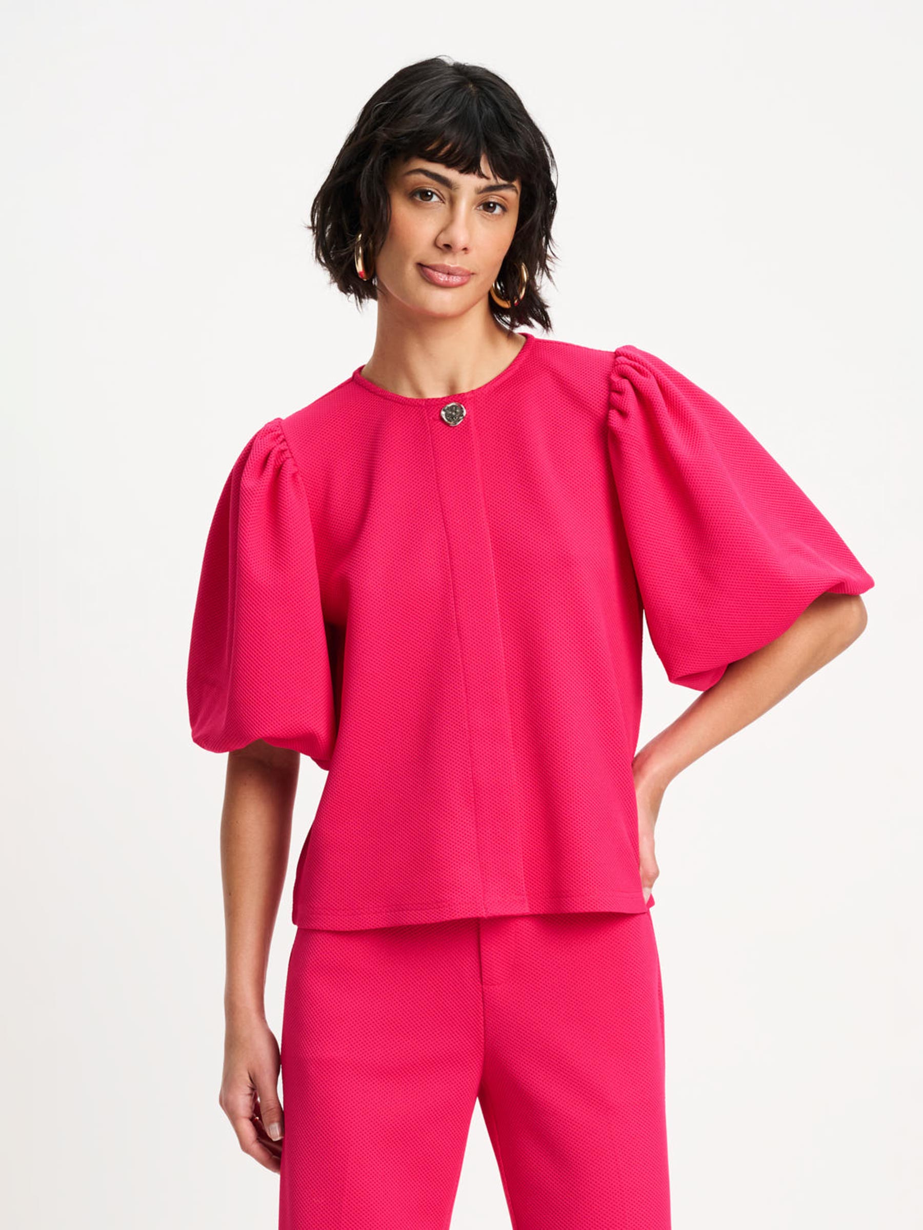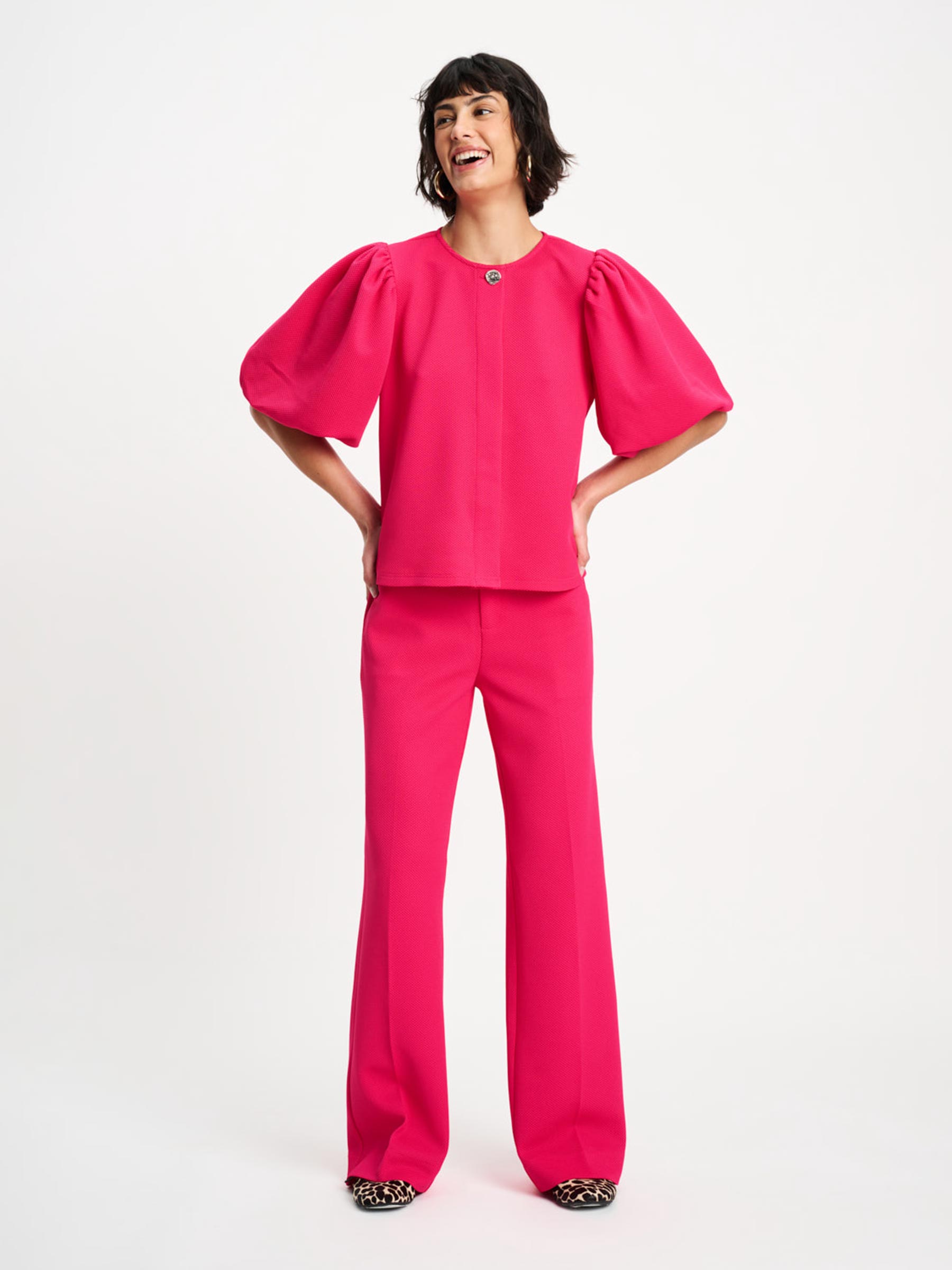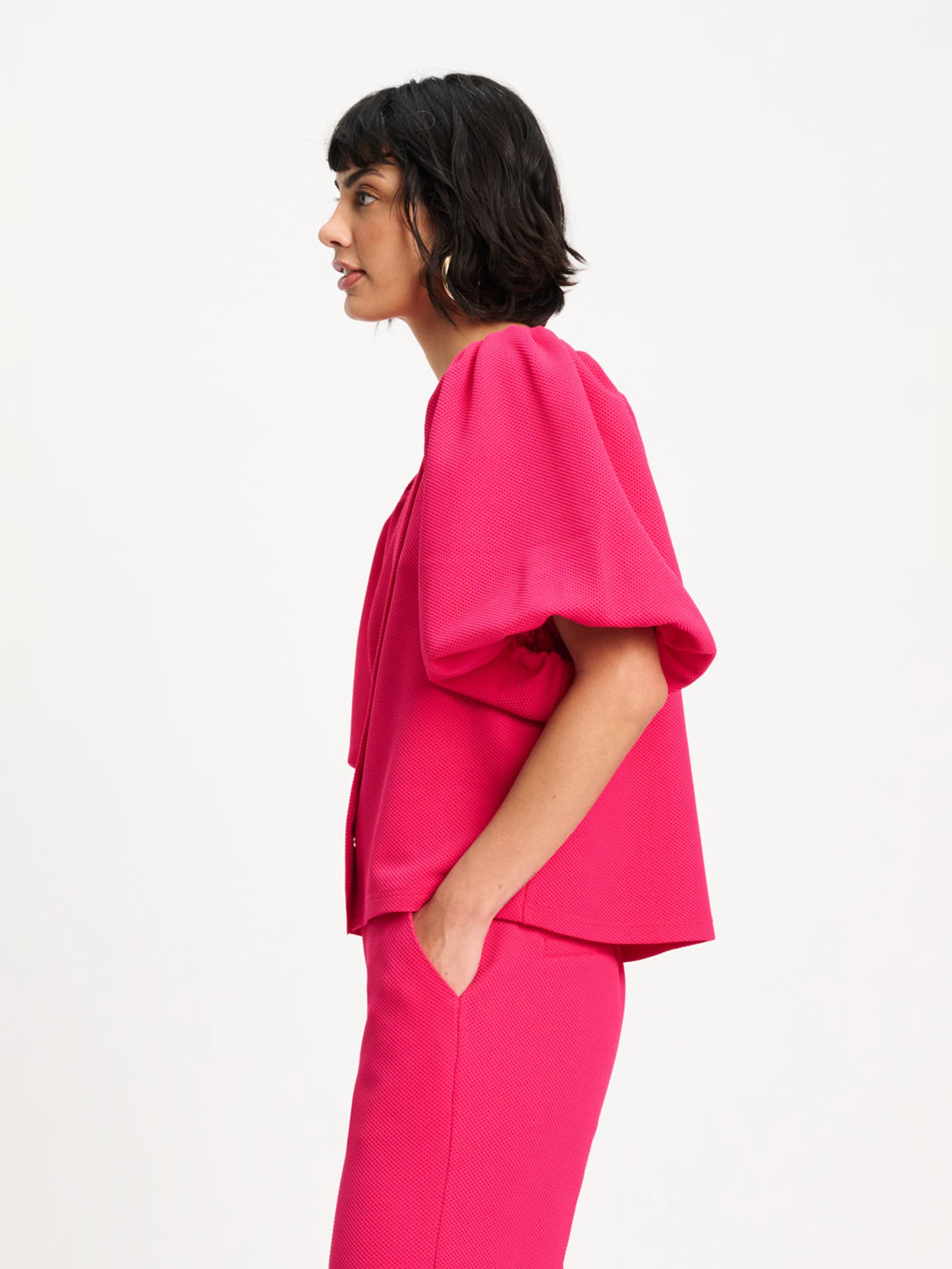 Deze roze top van POM Amsterdam is een echte blikvanger voor dagen waarop je outfit net even meer mag doen. De pofmouwen en mooie knoopsluiting geven karakter en je draagt haar net zo makkelijk gesloten als top of open als licht jasje. Combineer casual met jeans of ga voor een opvallende set met de bijpassende broek.