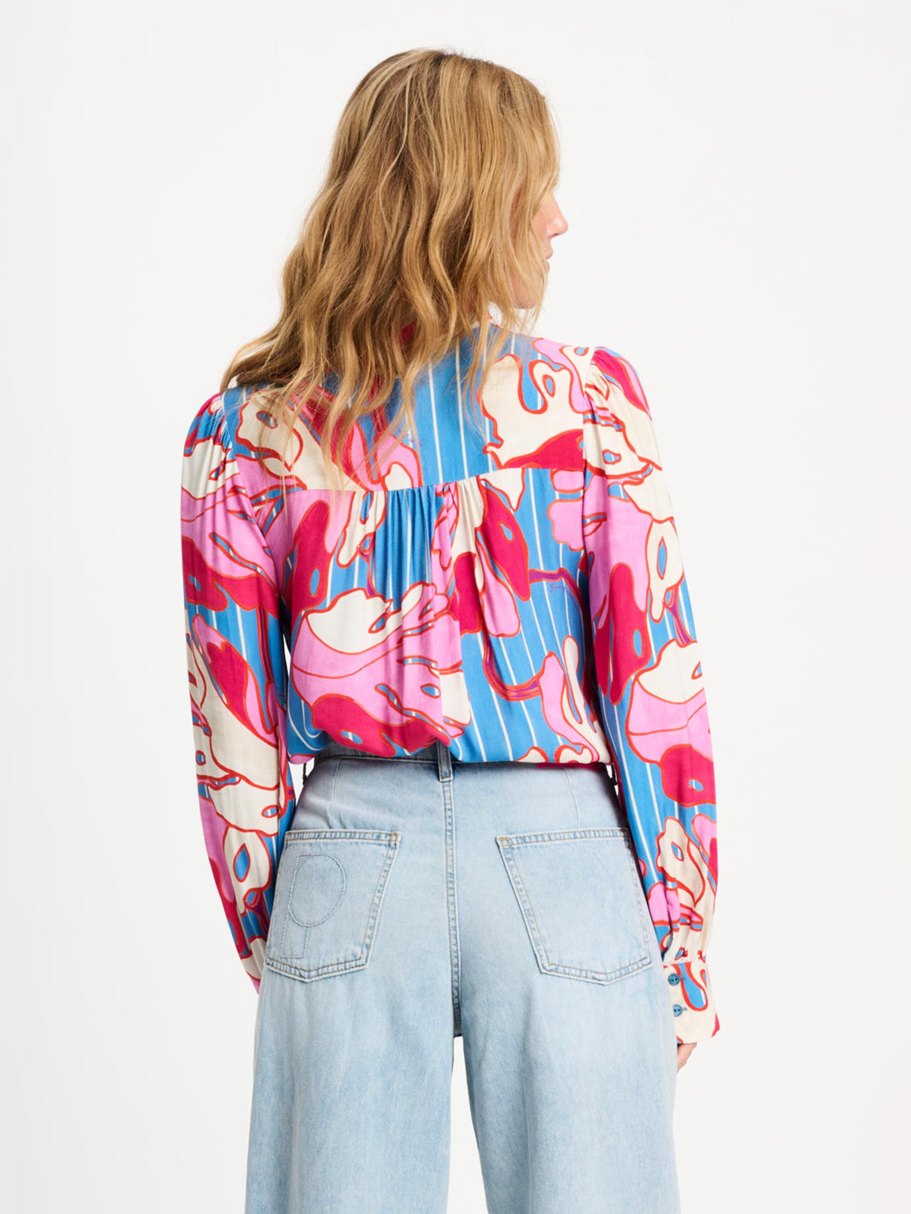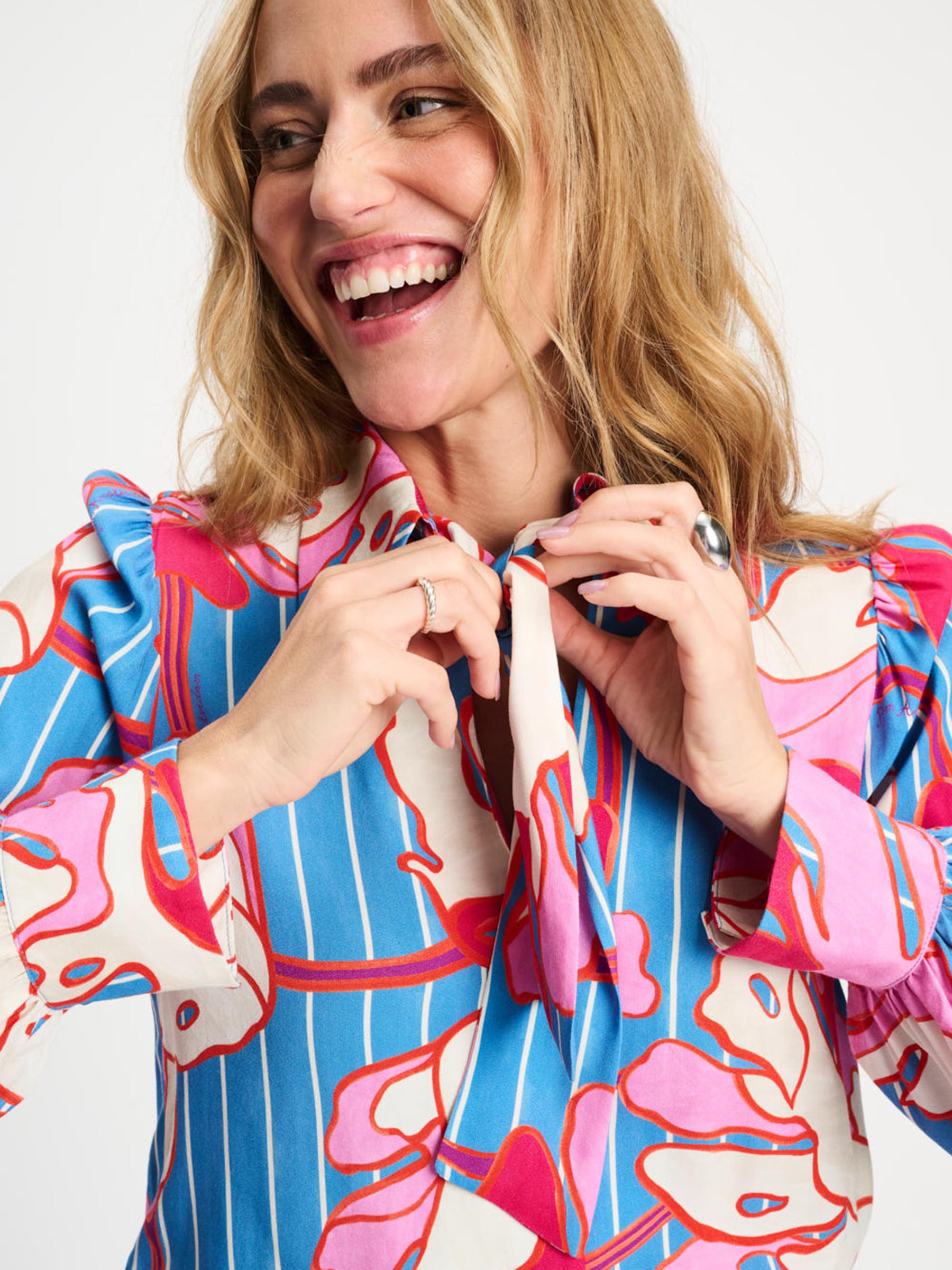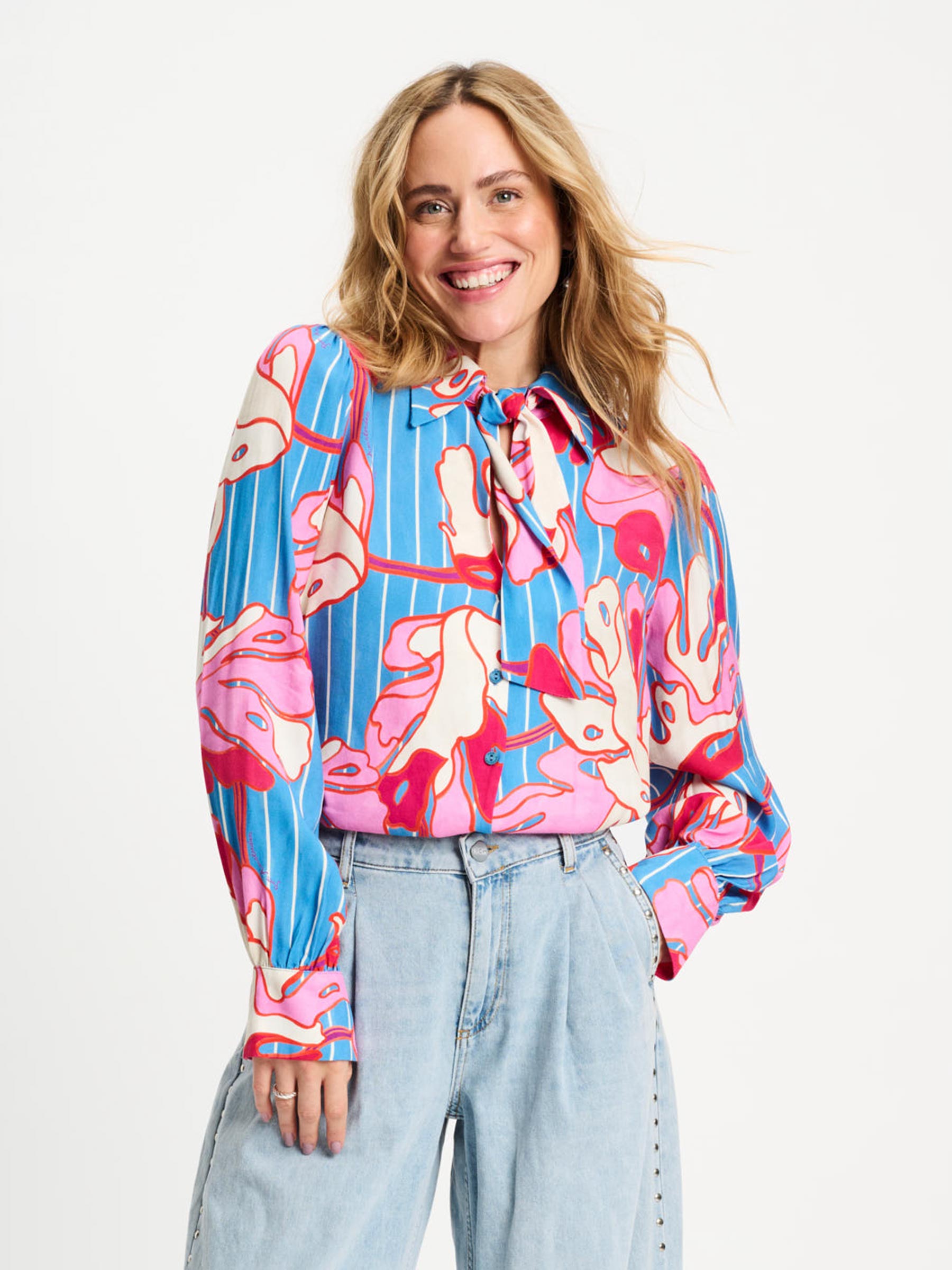Deze blauwe blouse van POM Amsterdam is een echte blikvanger en geeft direct kleur aan je look. Strepen en bloemenprint zorgen voor een frisse uitstraling en de afneembare strik maakt stylen extra leuk. Perfect op een jeans of netjes in een pantalon voor elke dag met iets extra’s.