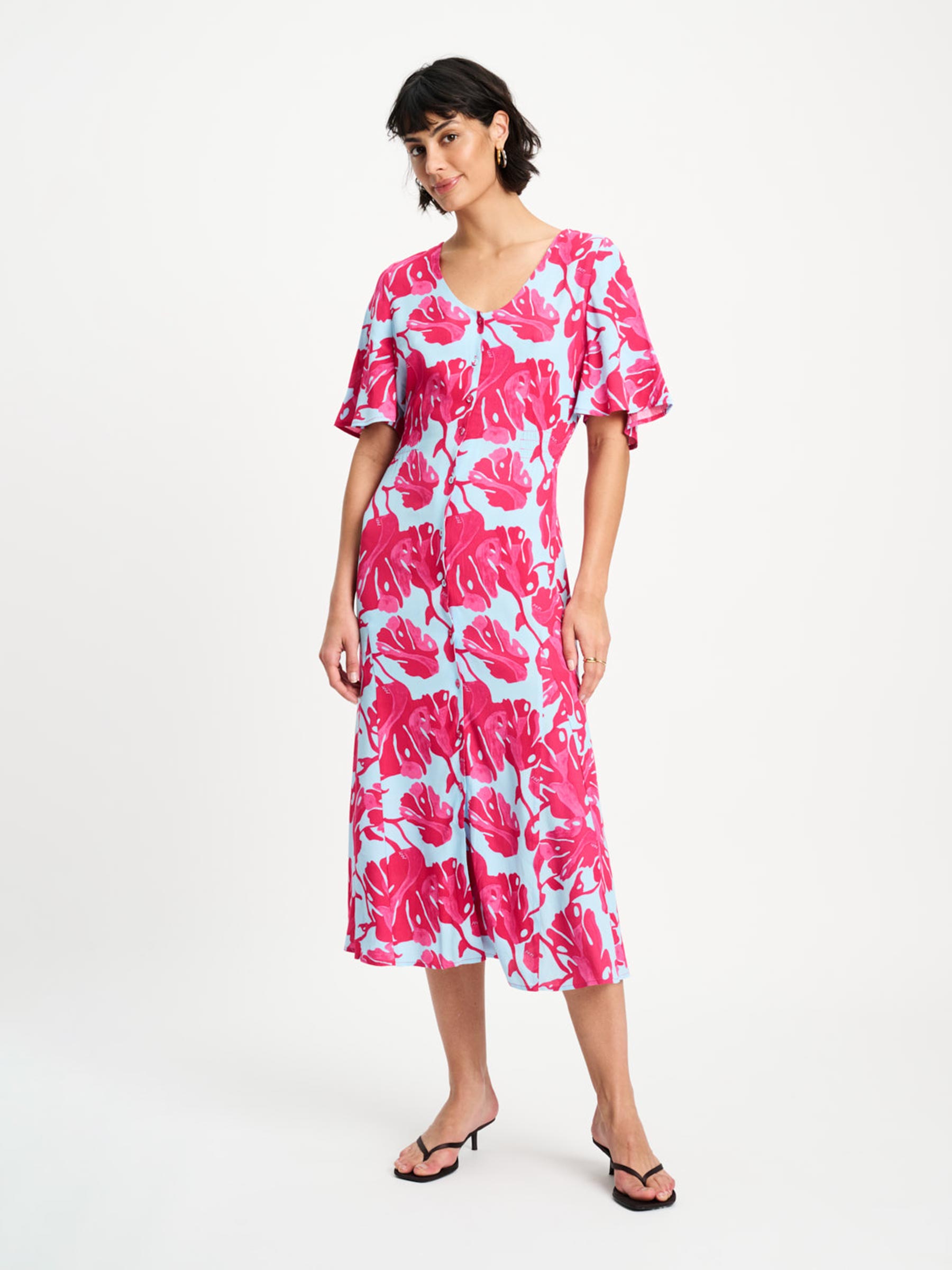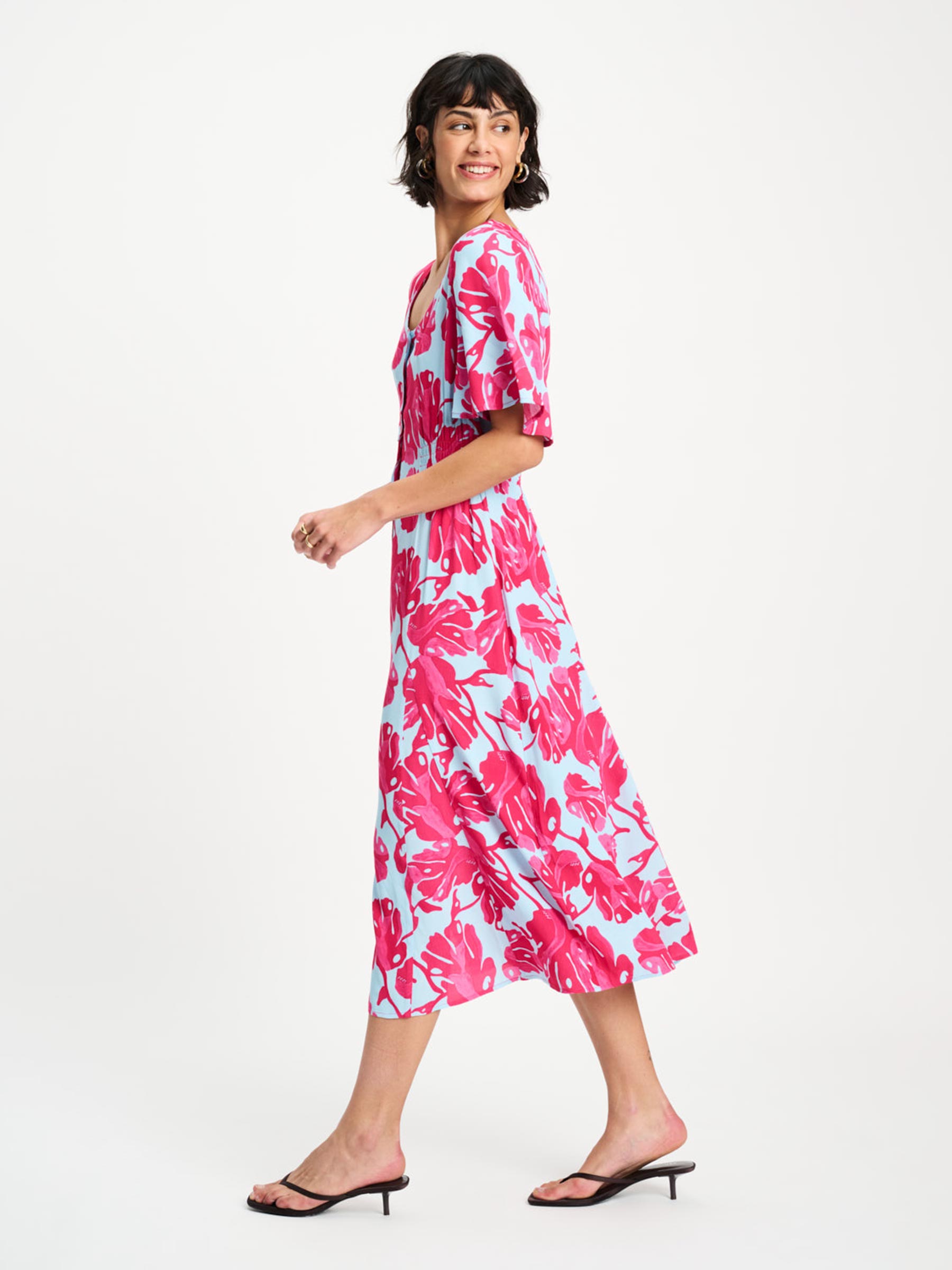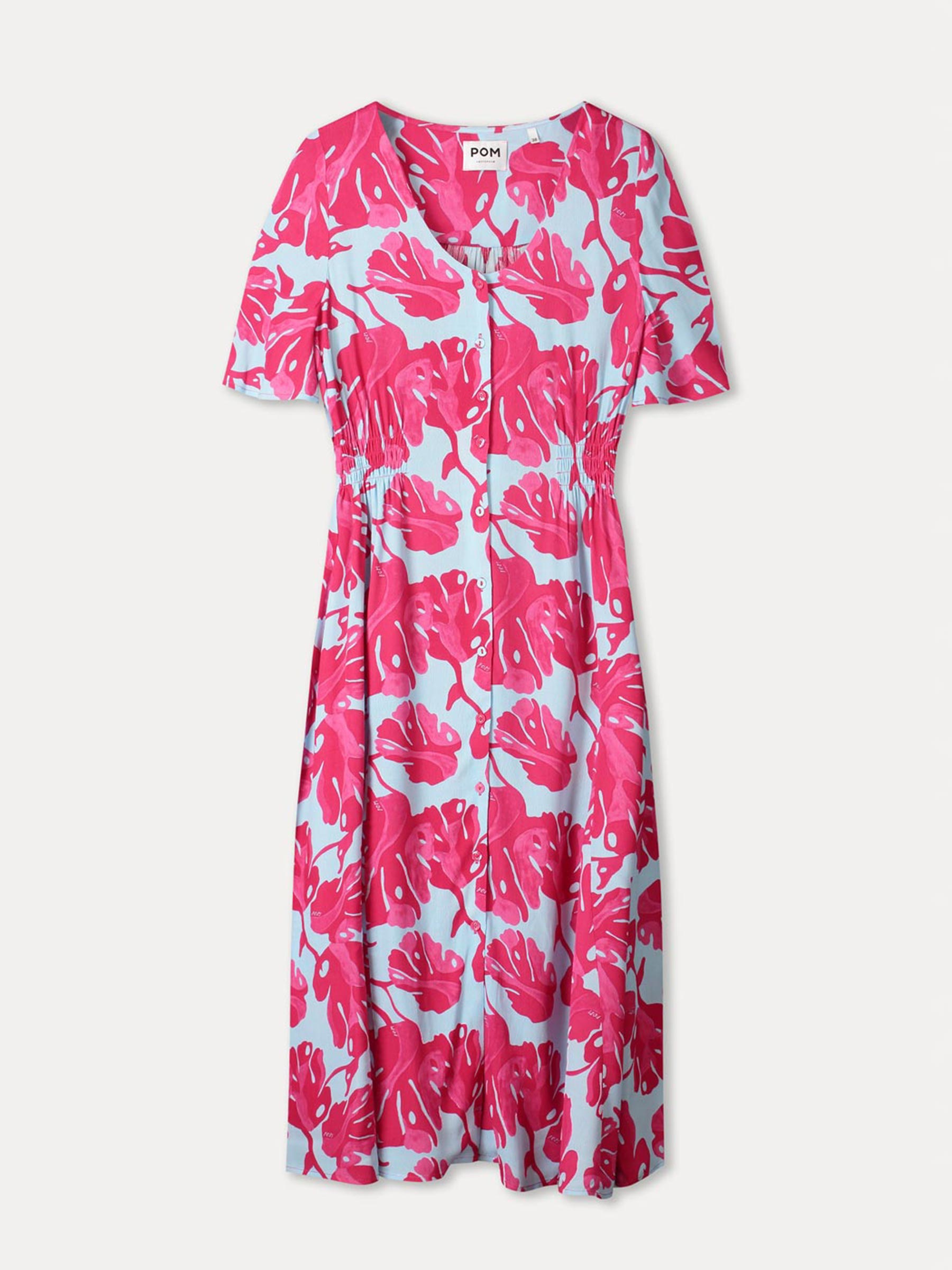 Deze roze midi jurk van POM Amsterdam brengt meteen kleur in je garderobe. De opvallende bladerenprint en de gesmokte taille zorgen voor een mooi silhouet en een luchtig draaggevoel. Perfect voor zonnige dagen met sneakers, sandalen of een hakje.