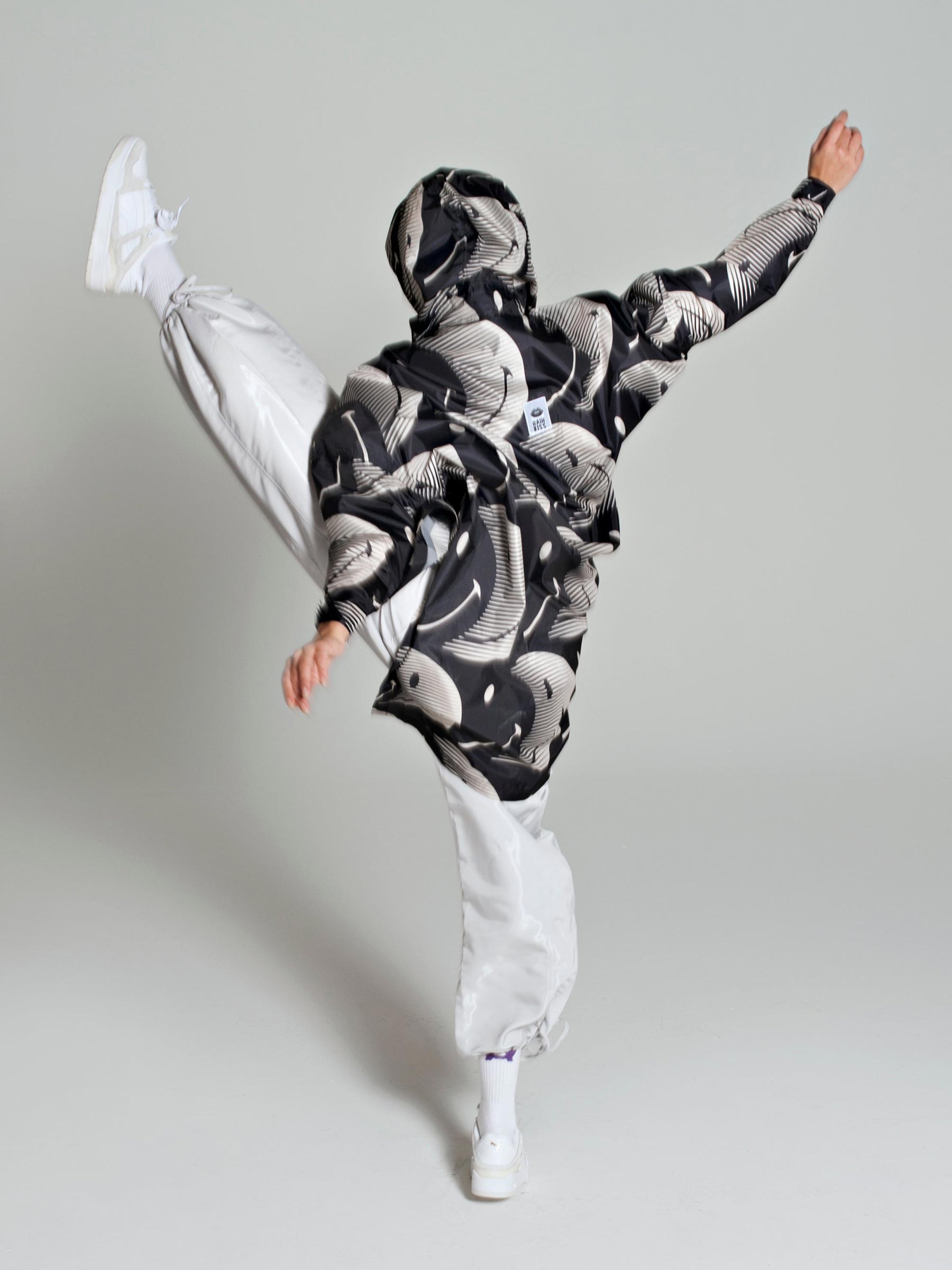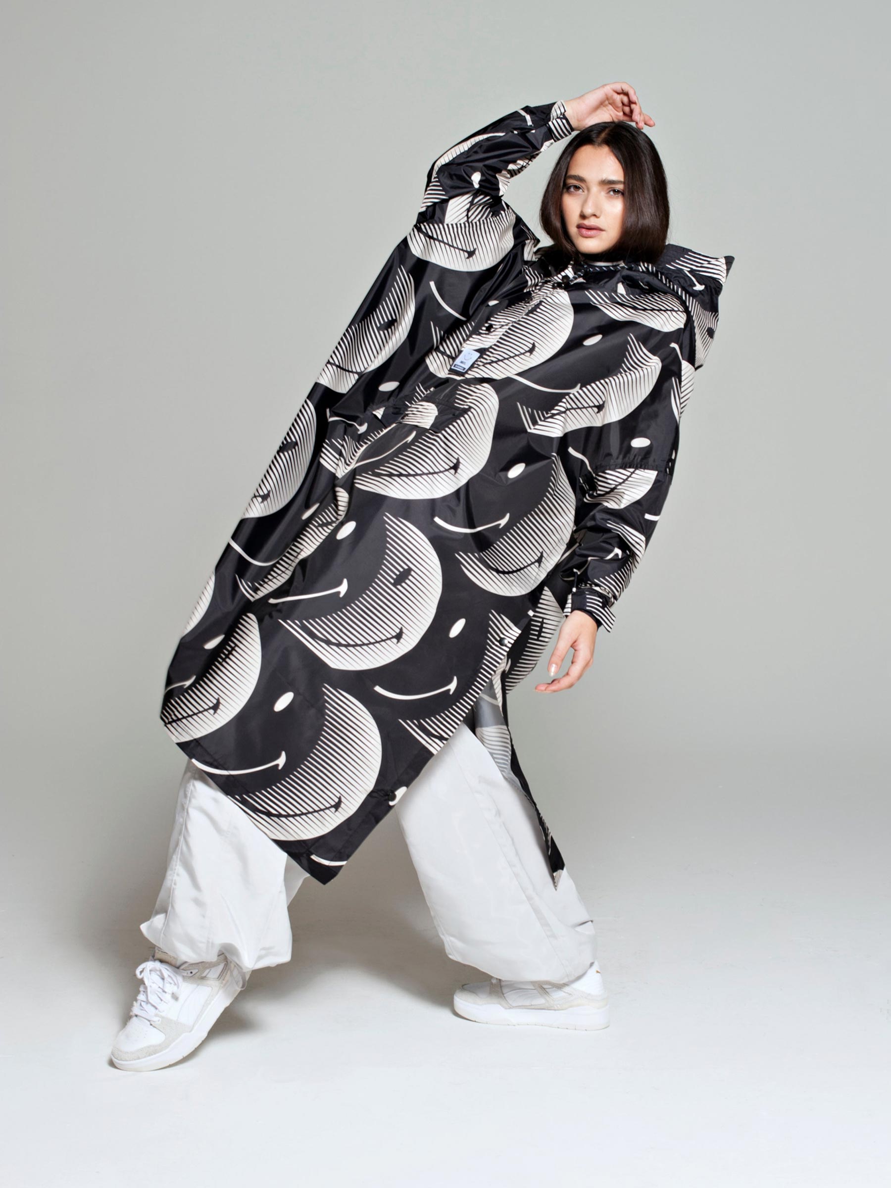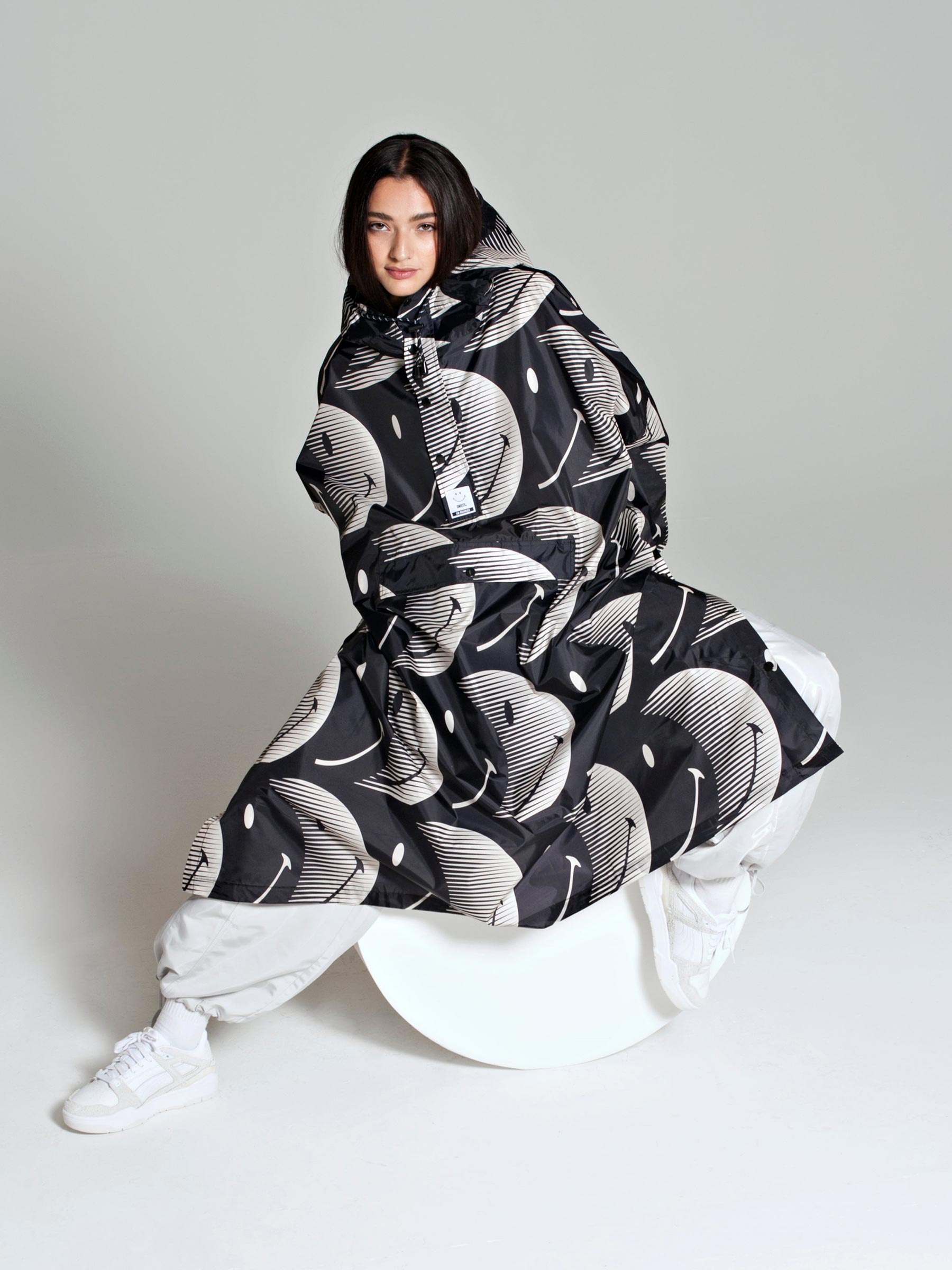 Deze donkerblauwe regenponcho van Rainkiss maakt zelfs regenachtige dagen leuk. De opvallende print is een samenwerking met Smiley, waar de halve manen subtiel in glimlachen veranderen. Gemaakt van 100% gerecycled polyester, lichtgewicht en waterdicht – ideaal voor onderweg of festivals.