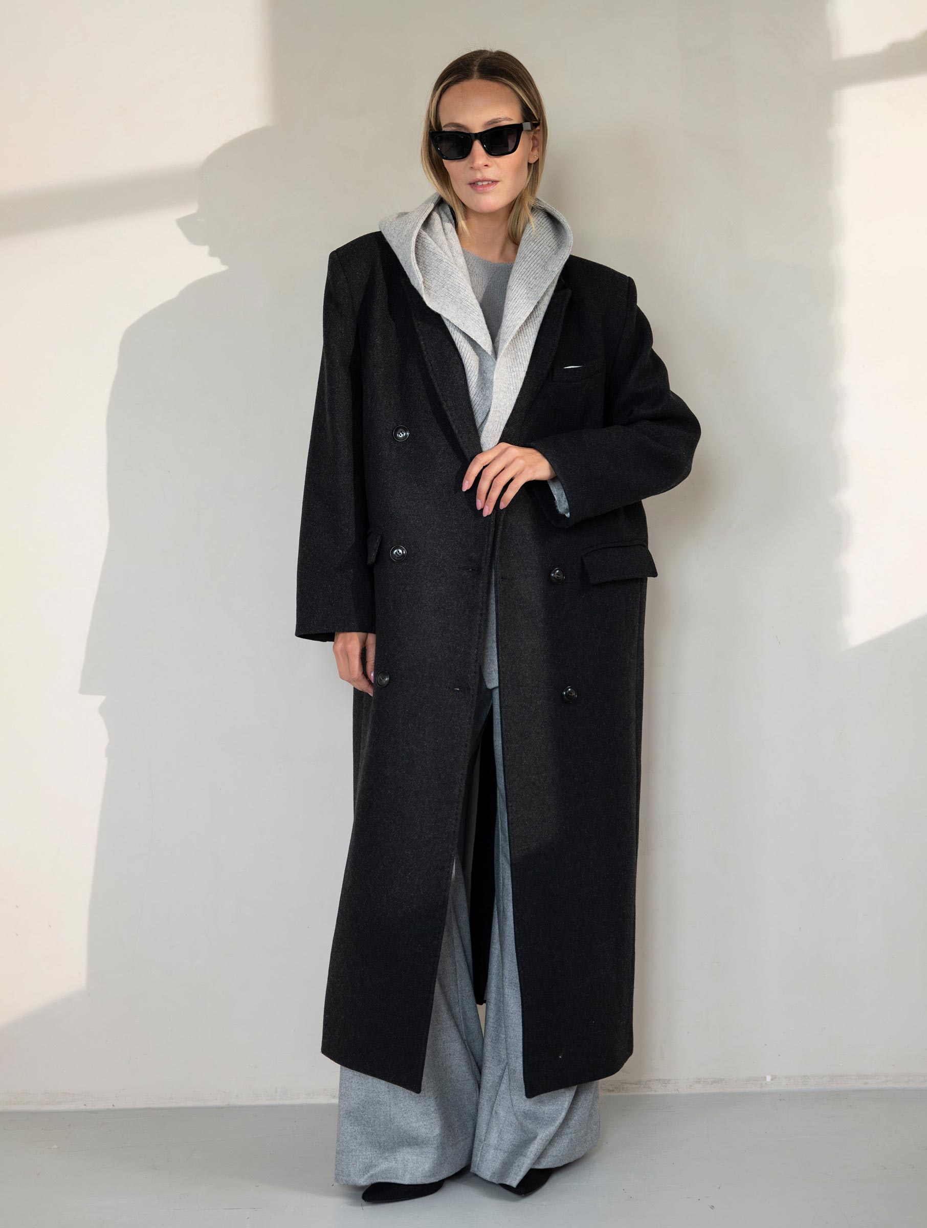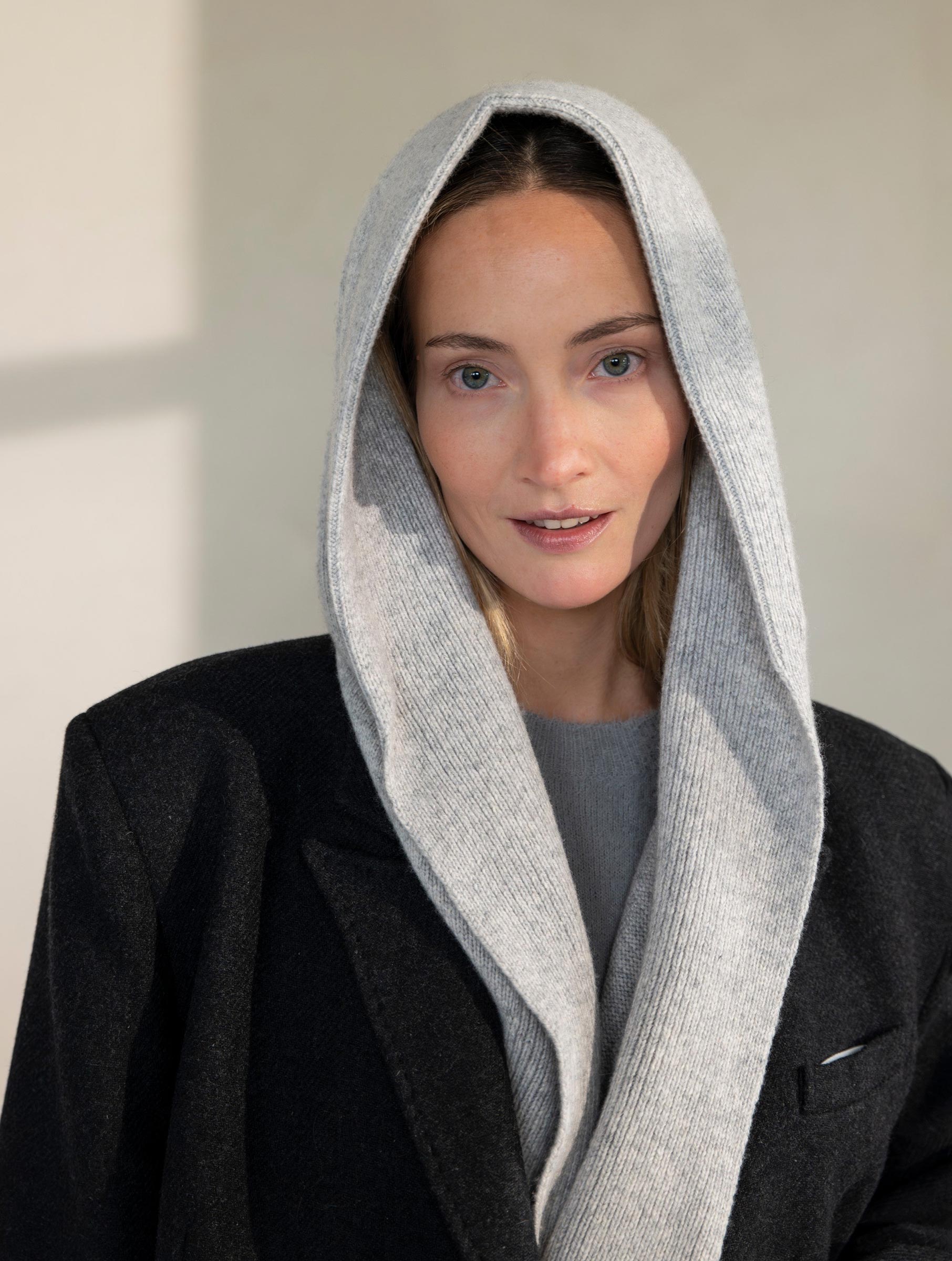 - Grijze sjaal met capuchon