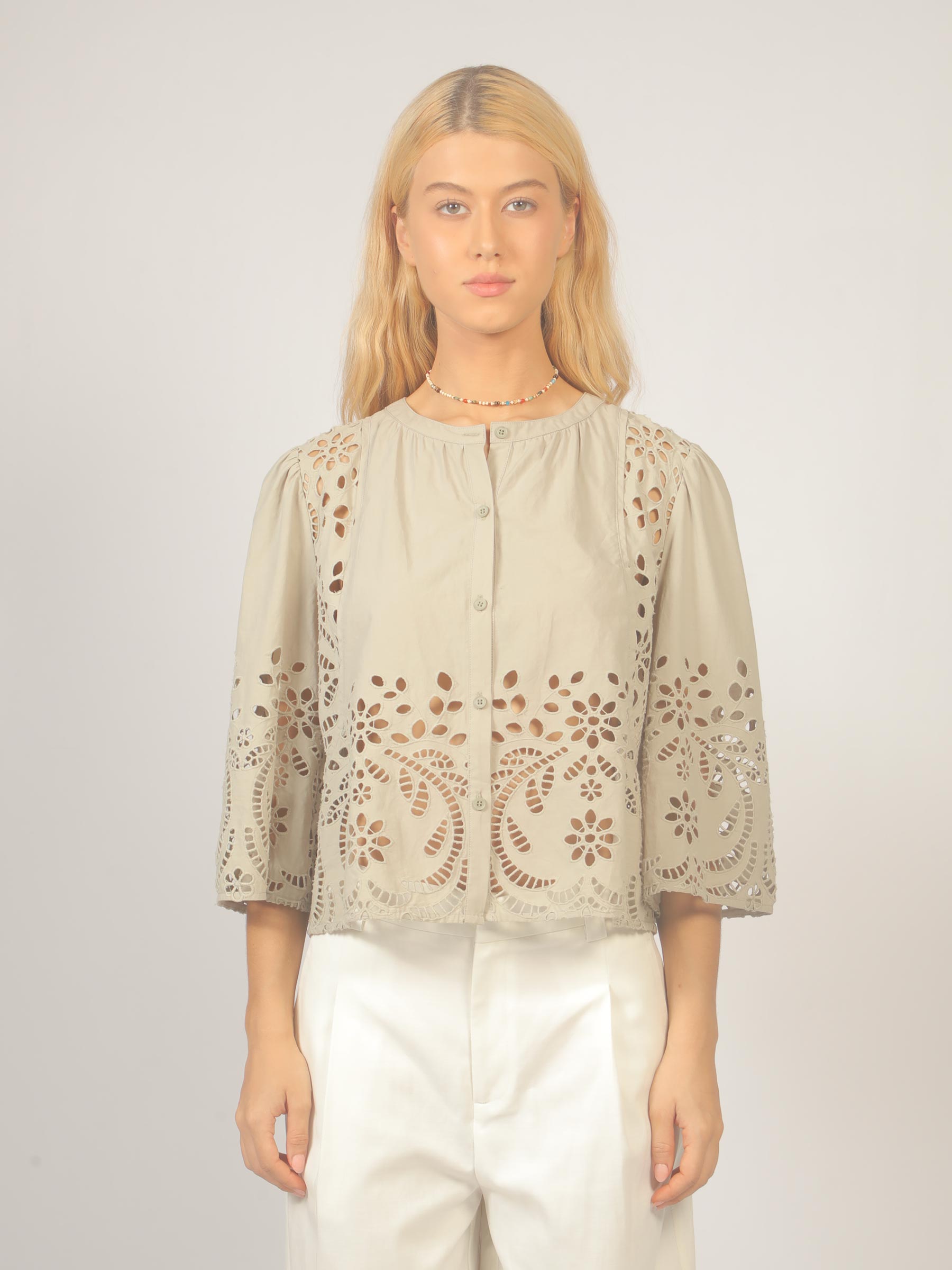 - Khaki blouse met broderie anglaise