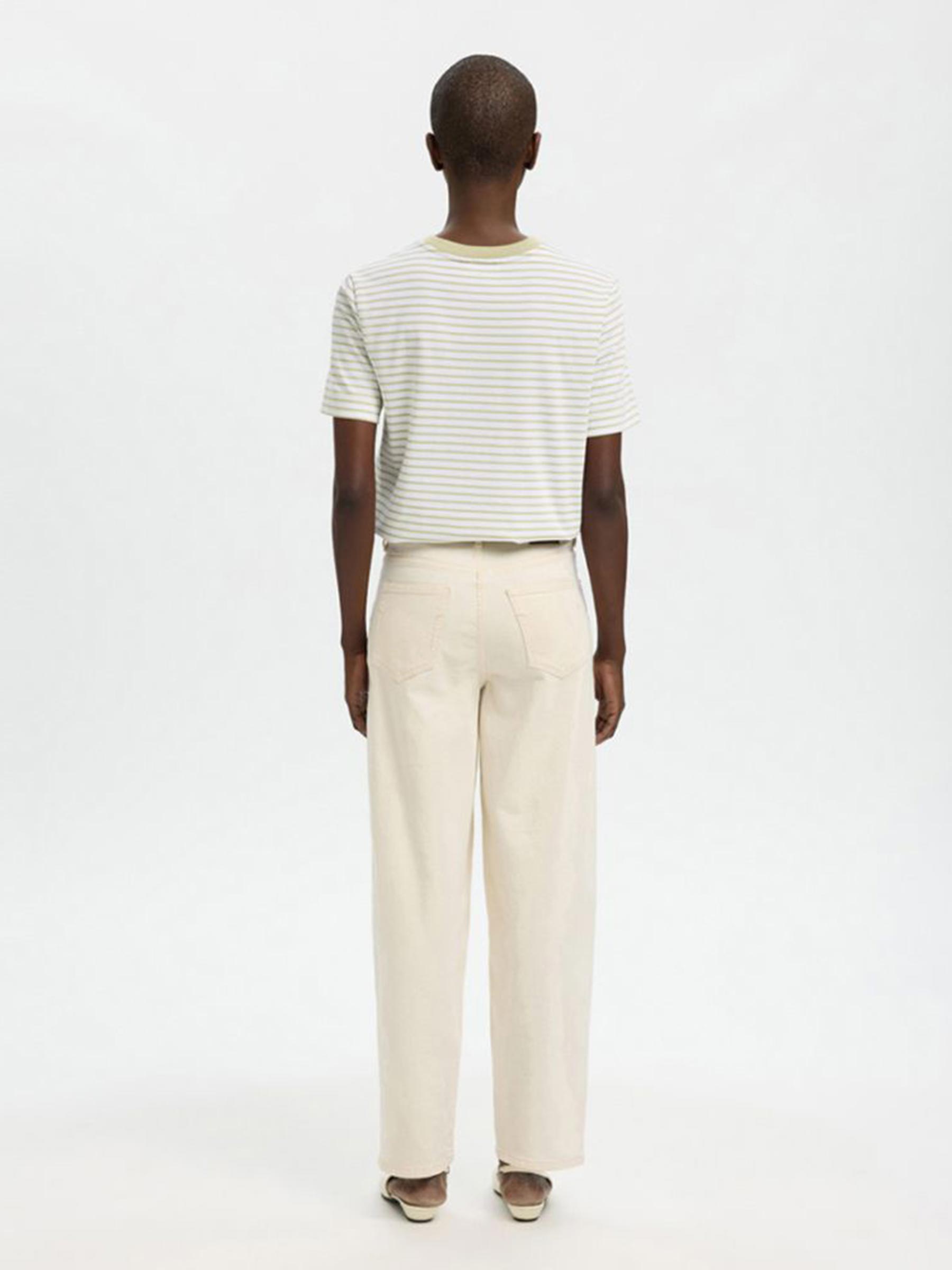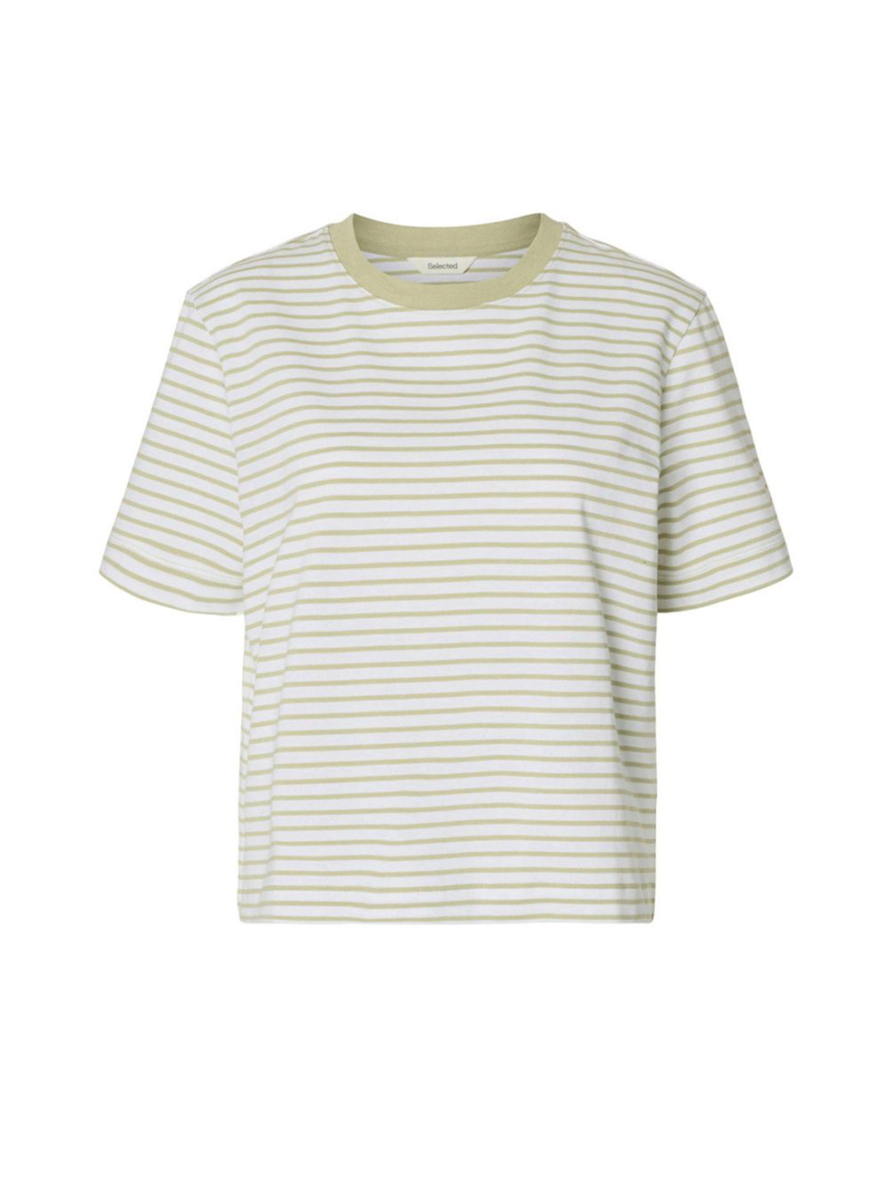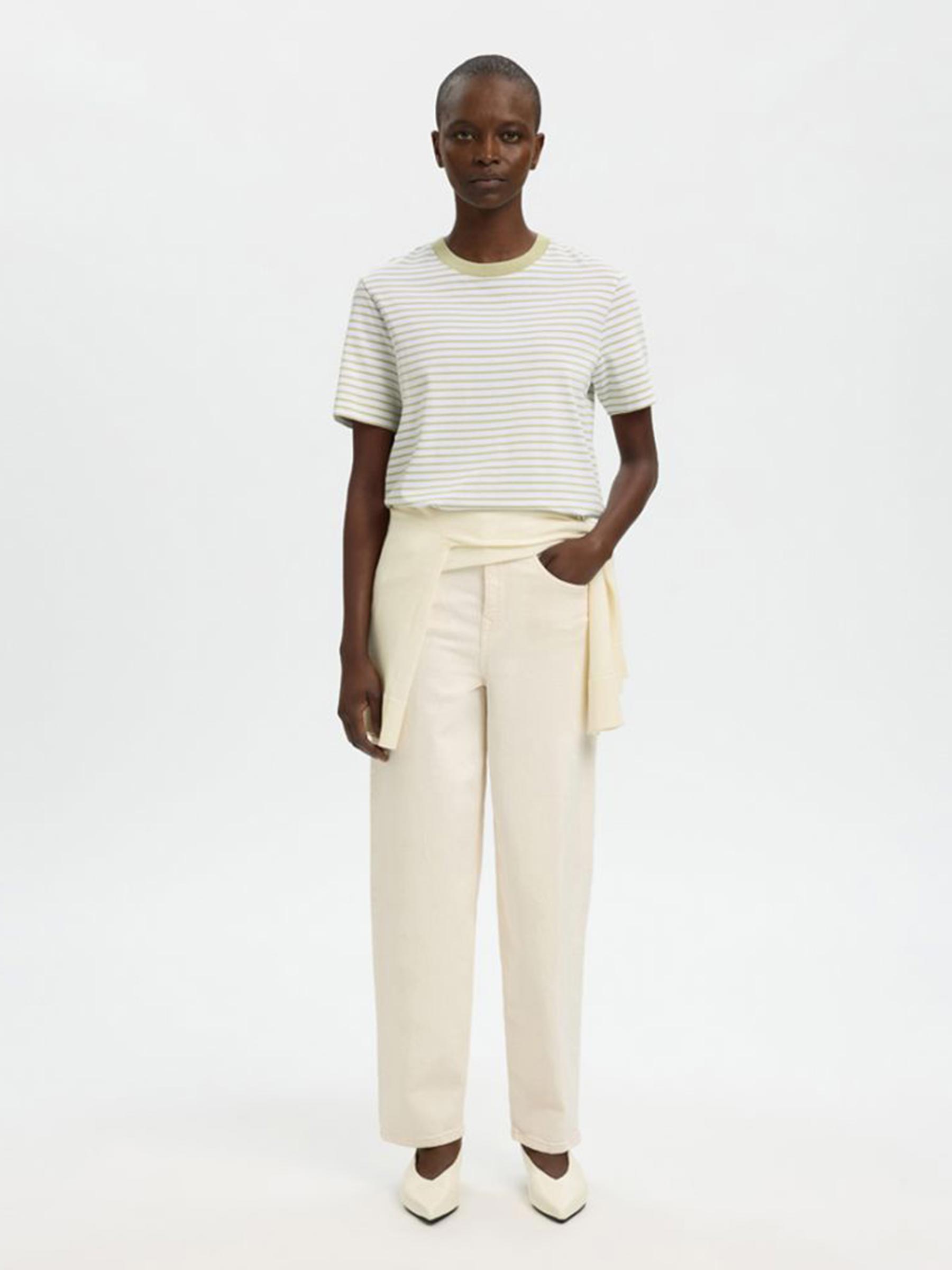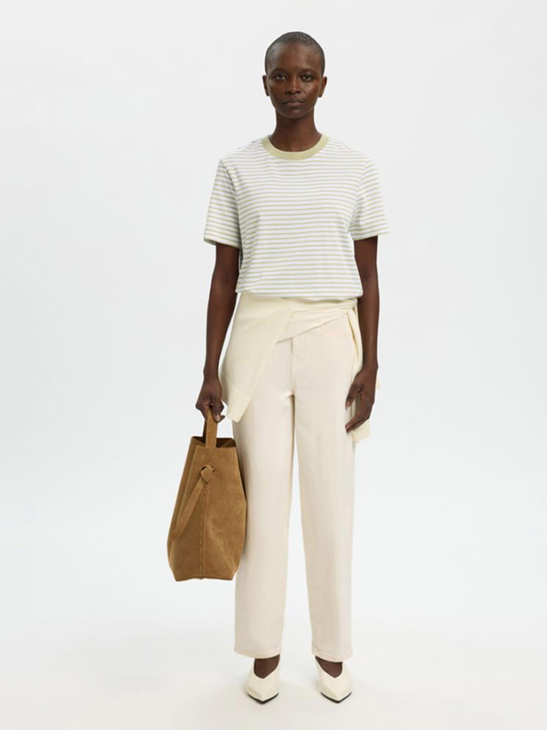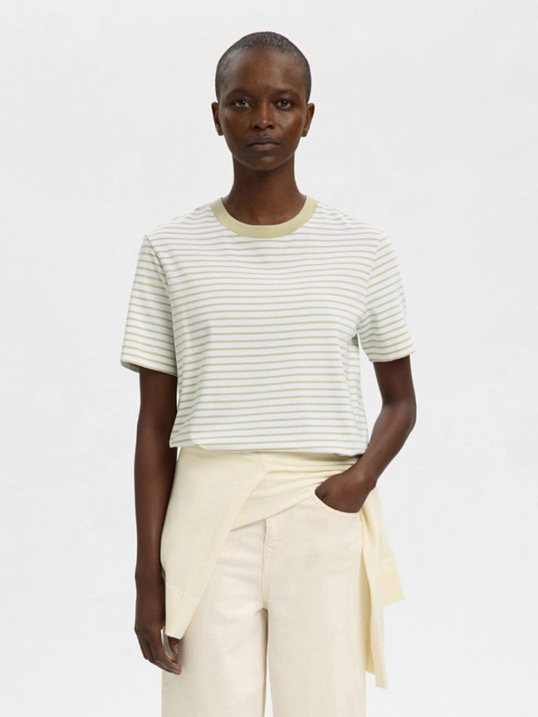 Het lichtgroen gestreepte Essential boxy tee van Selected Femme is gewoon een heel goed t-shirt, dik biologisch katoen, relaxte boxy pasvorm, niks teveel. Dat is ook precies waarom hij in elke kast thuishoort.